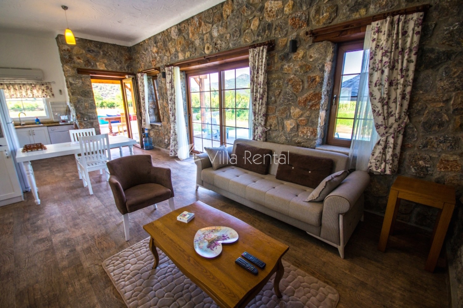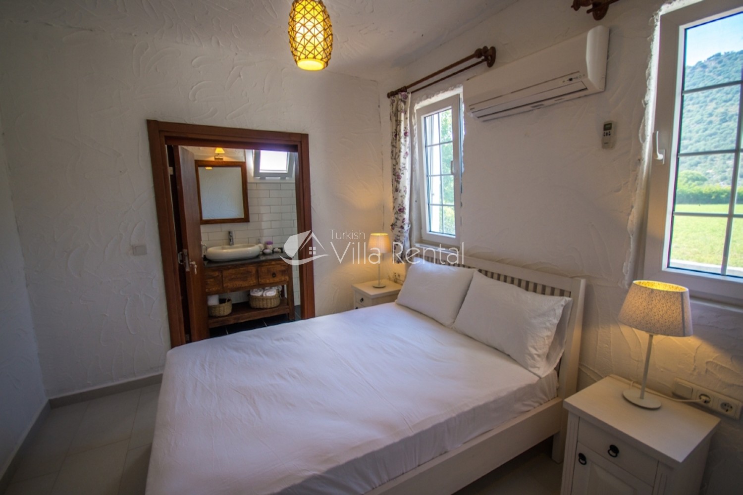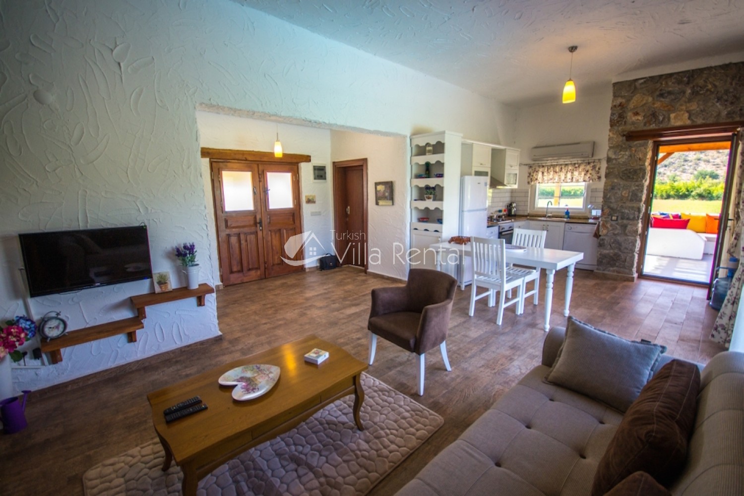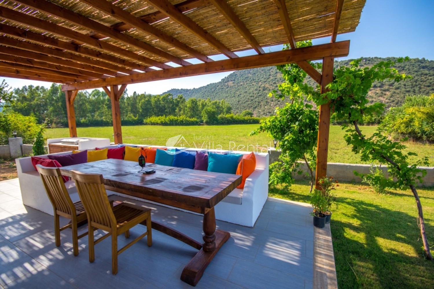 The setting of the villa is peaceful and full of natural surroundings, green fields, trees, and the mountainous background. It is the perfect place to go and forget the stresses of life. One of the great things about the location is that it is also not too far from the centre of Hisaronu and also beautiful beaches.