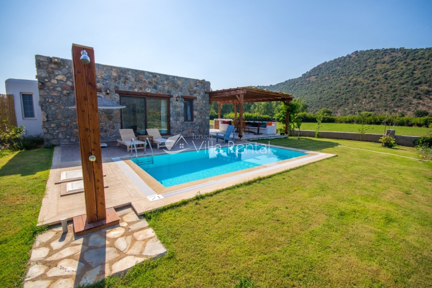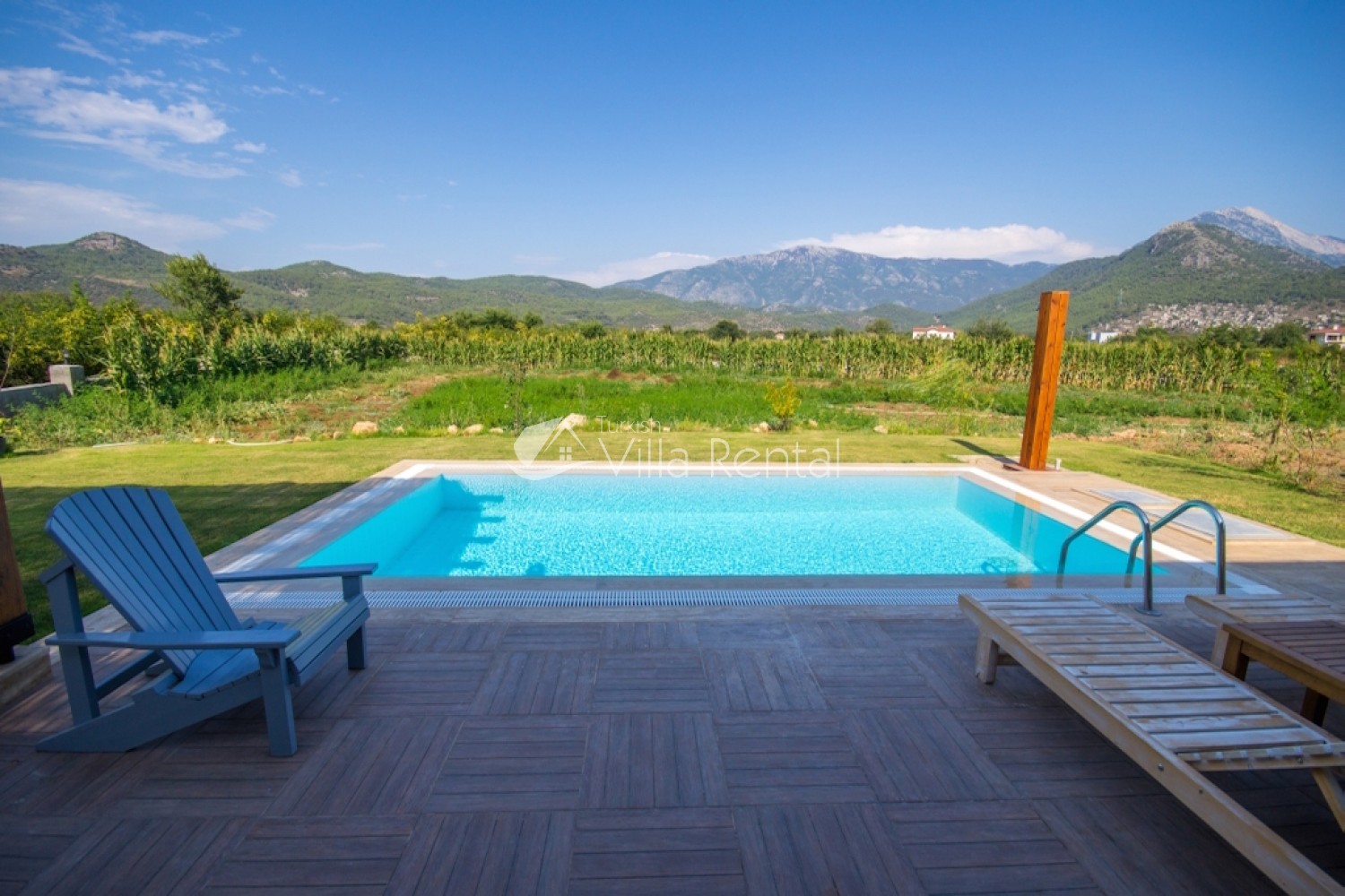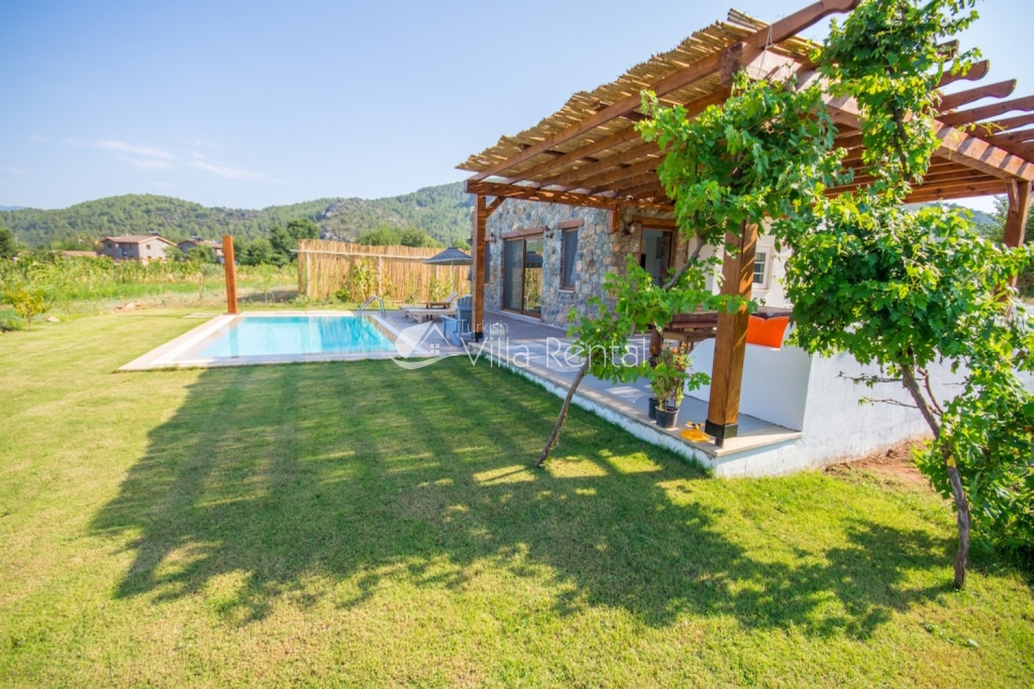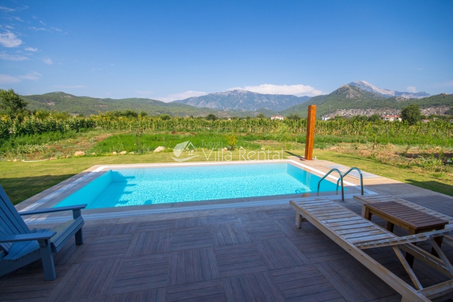 The setting of the villa is peaceful and full of natural surroundings, green fields, trees, and the mountainous background. It is the perfect place to go and forget the stresses of life. One of the great things about the location is that it is also not too far from the centre of Hisaronu and also beautiful beaches.