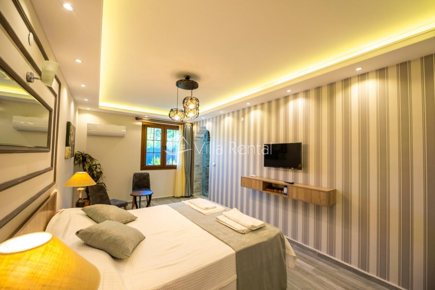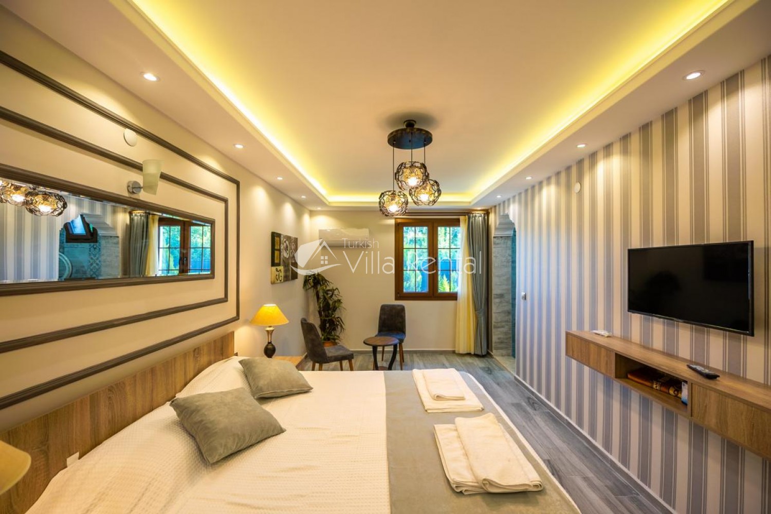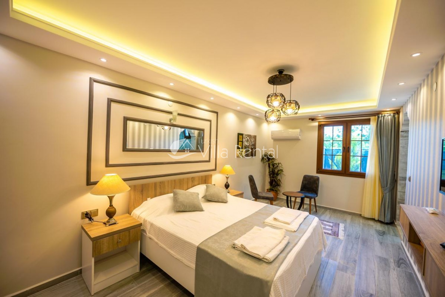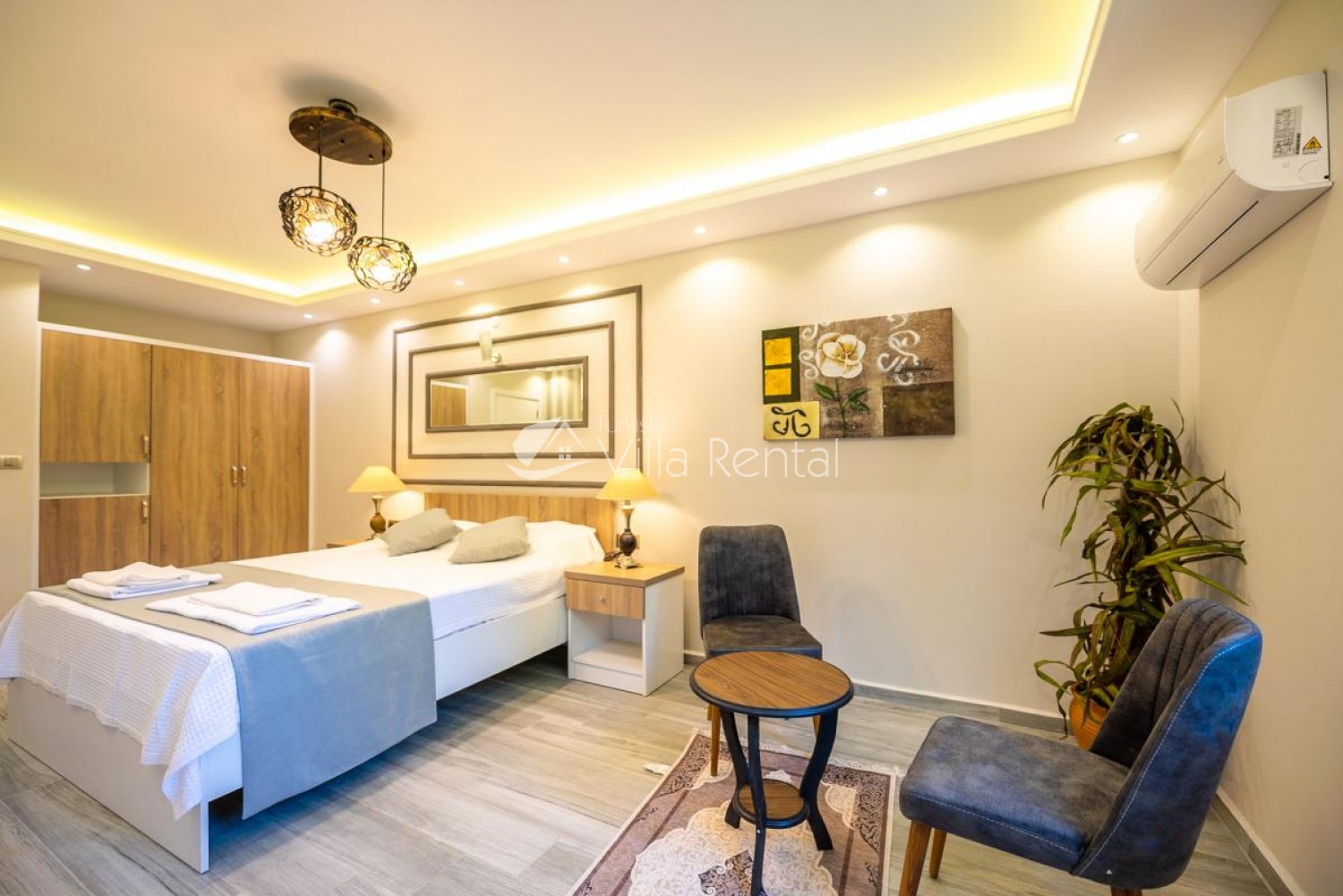 1.Bedroom: Double bed, bedside table, wardrobe, TV, air conditioning, table and chairs and bathroom and toilet.