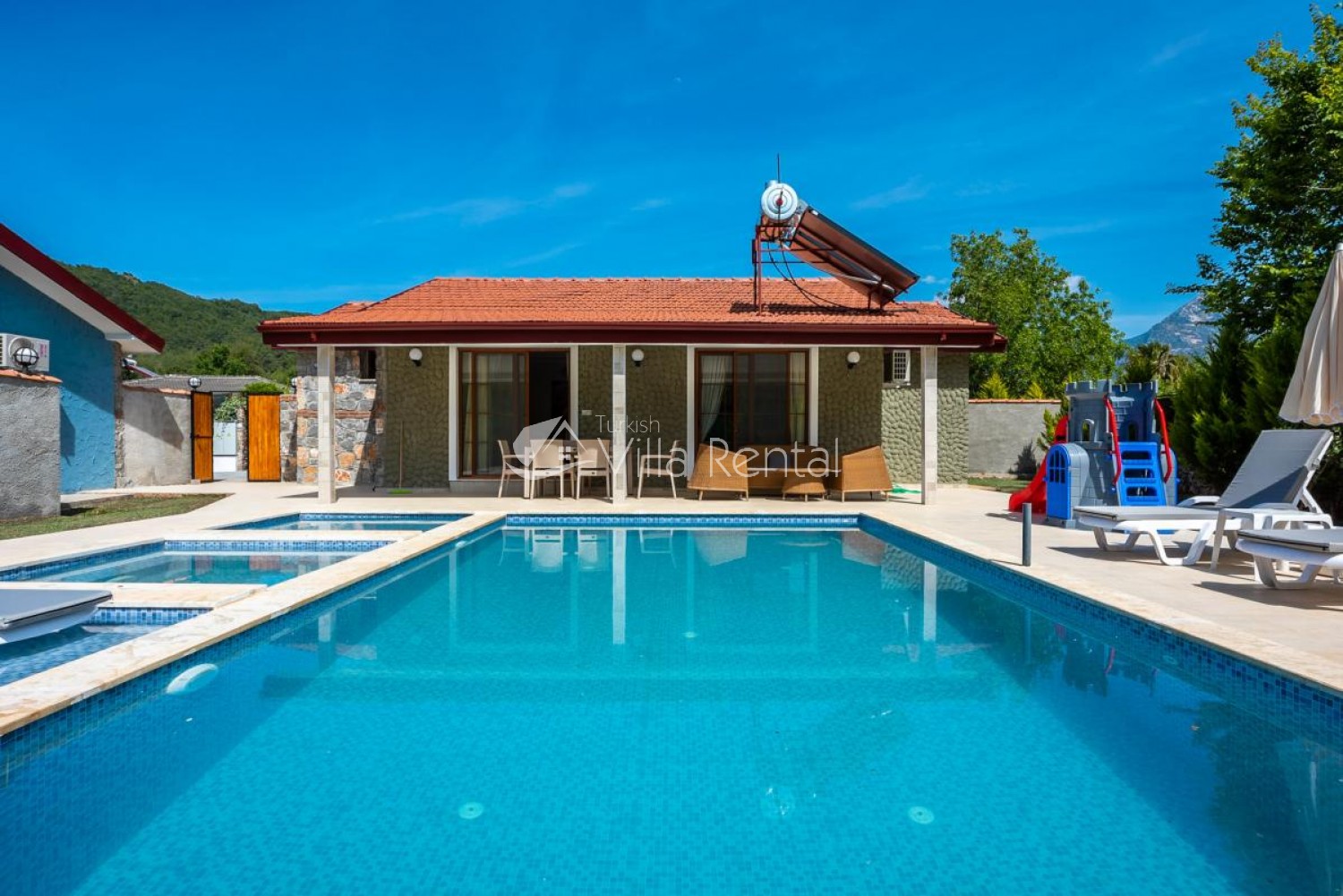 Garden: Private swimming pool, deck chairs, umbrellas, dining table, sitting group, playground.