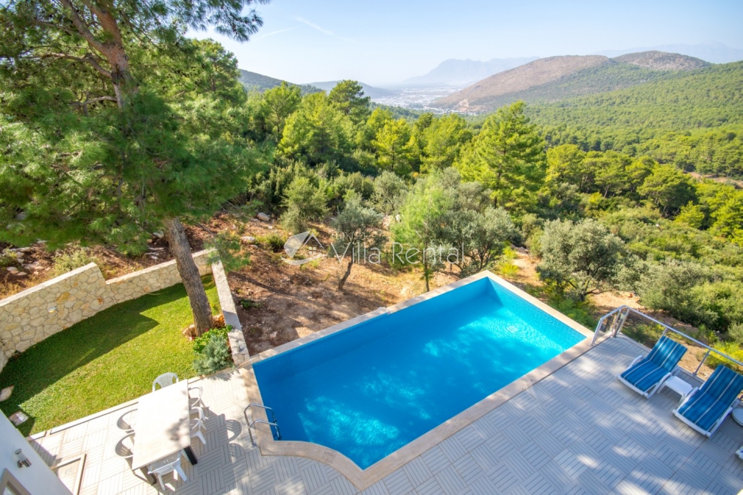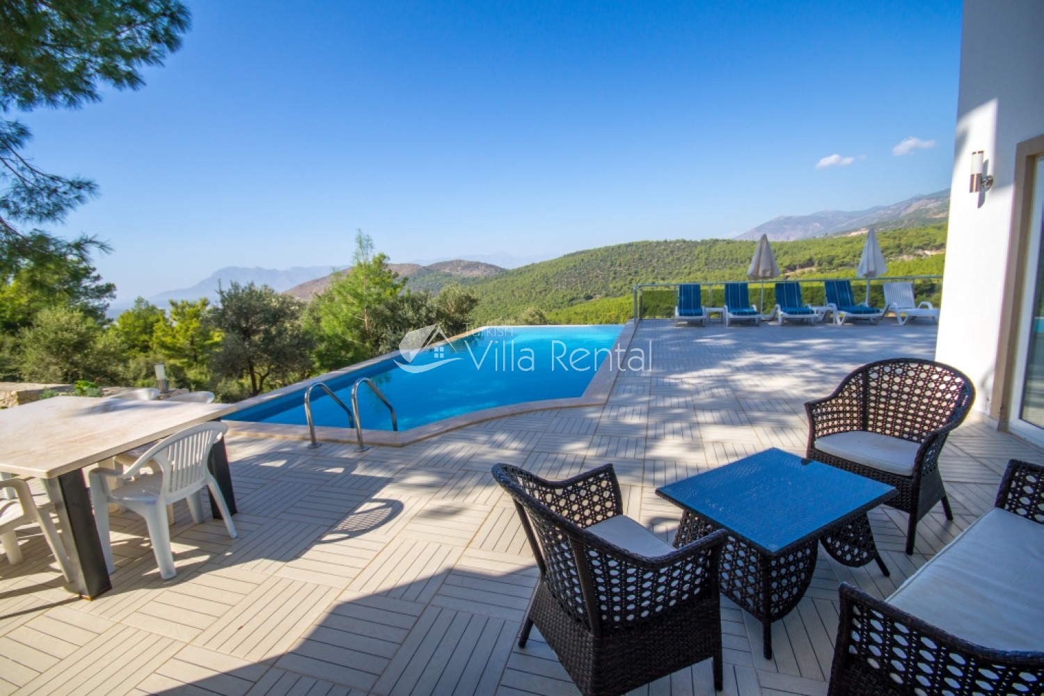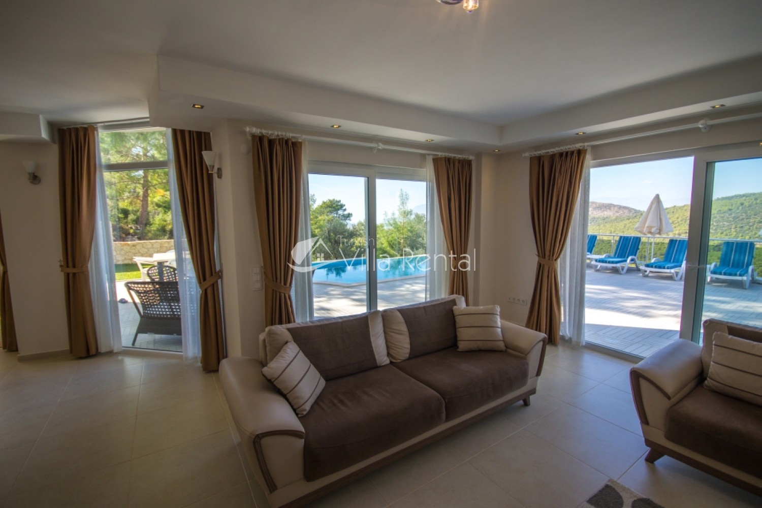 Lounge: Sea and countryside views, 8 person dining table, sitting area, satellite receiver, LCD TV, air conditioning, iron, ironing board, wifi modem, Living room and kitchen are lead directly to the pool terrace.