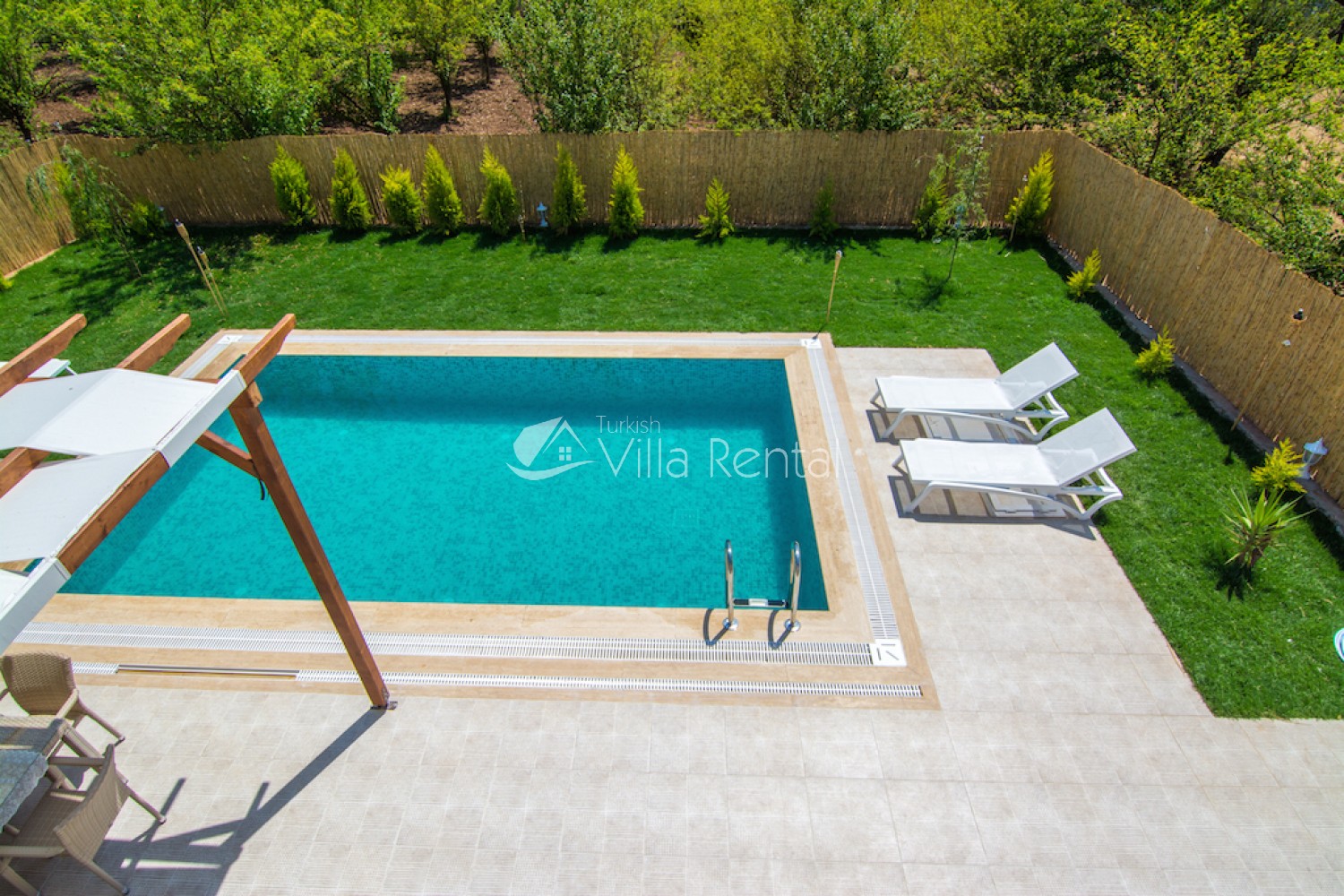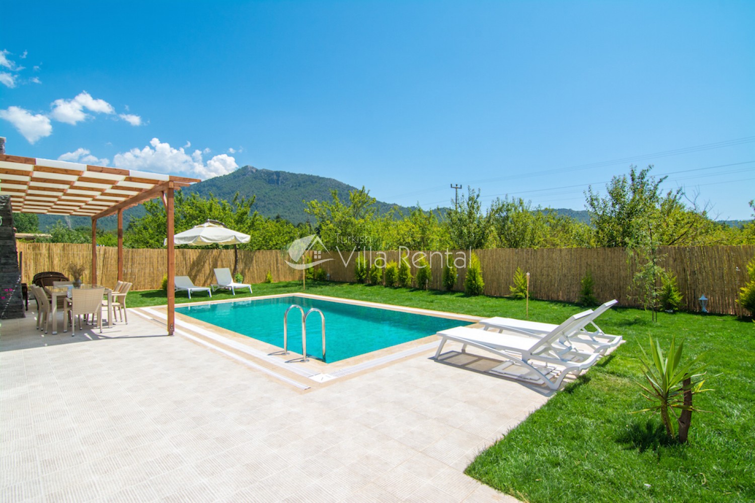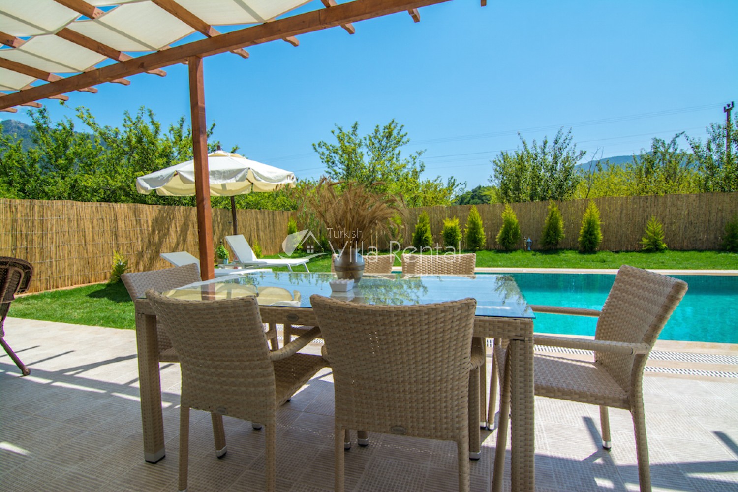 There are sun loungers, umbrellas, barbecue, garden furniture, chairs and tables.