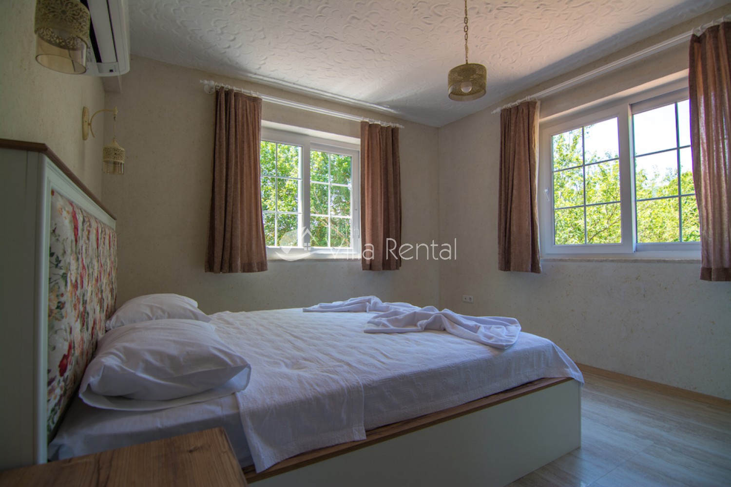 Bedroom 3: Double bed, dressing table, air conditioning, wardrobe, bedside tables, bathroom and toilet.