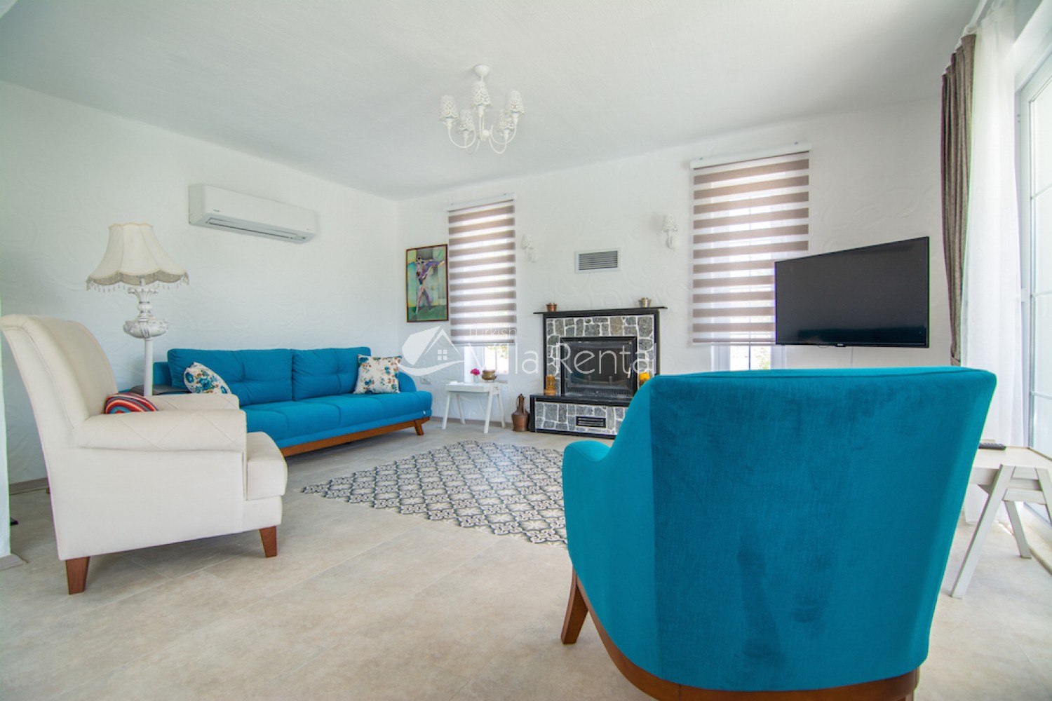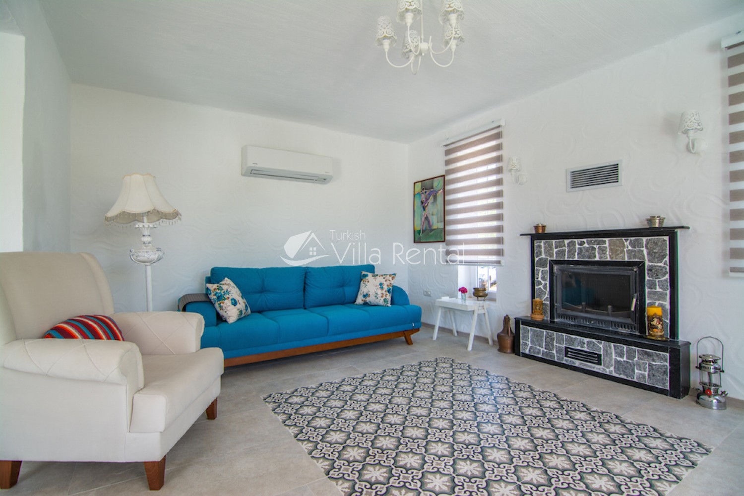 Living Room: Seating area/sofa set, satellite receiver, TV, air conditioning, fireplace.