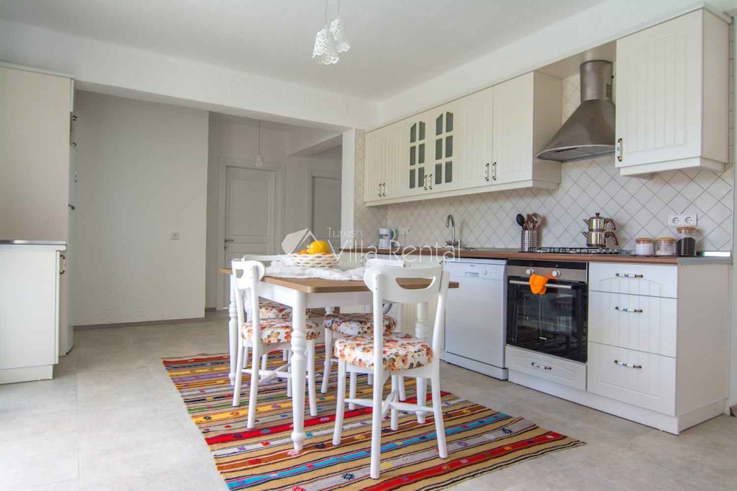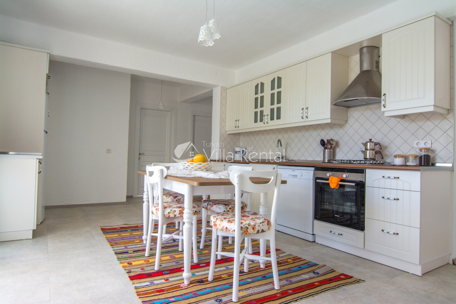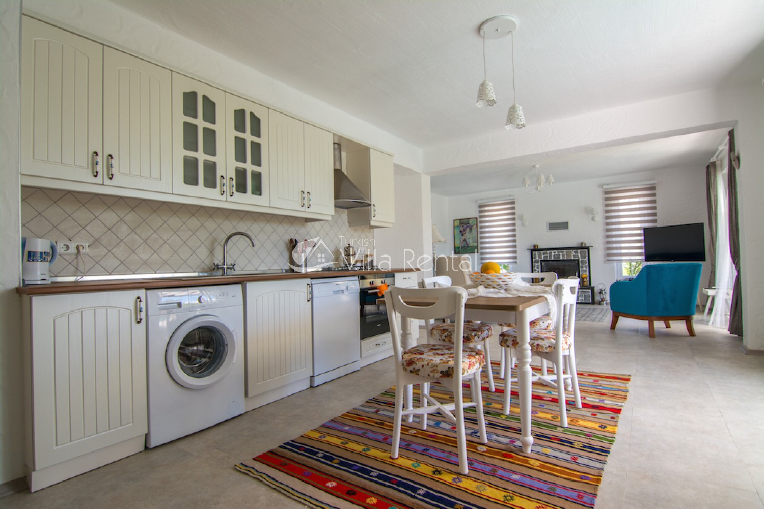 Kitchen: Fully fitted and equipped kitchen with fridge, dishwasher, washing machine, dining table, oven, cooker, kettle, 6-seater dining set, pans, pots, cutlery, knife set.