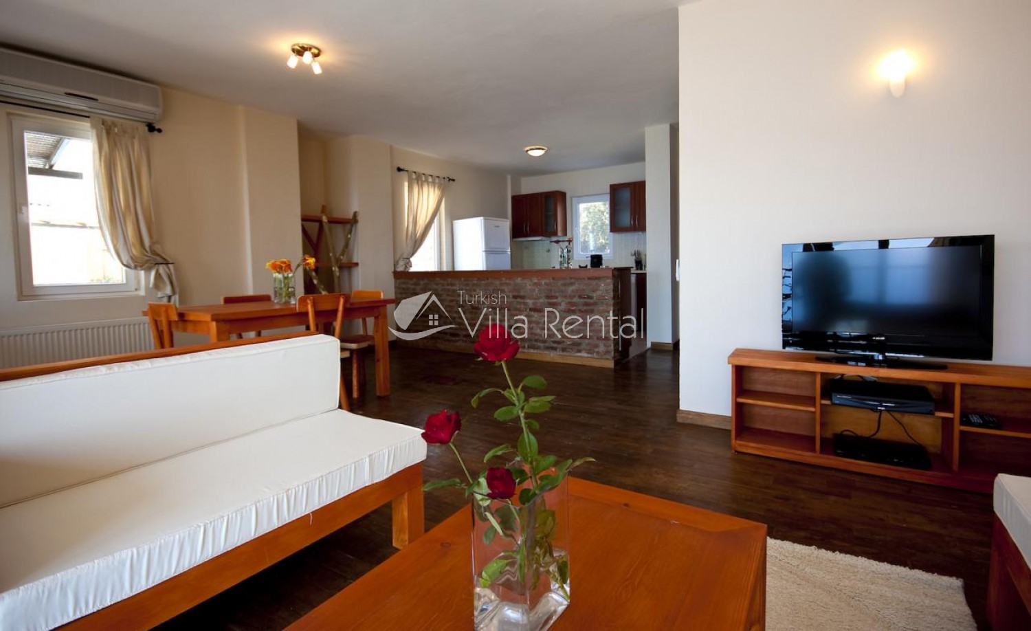 Living Room: Open plan with kitchen and dining area, comfortable lounge area, TV, DVD player.