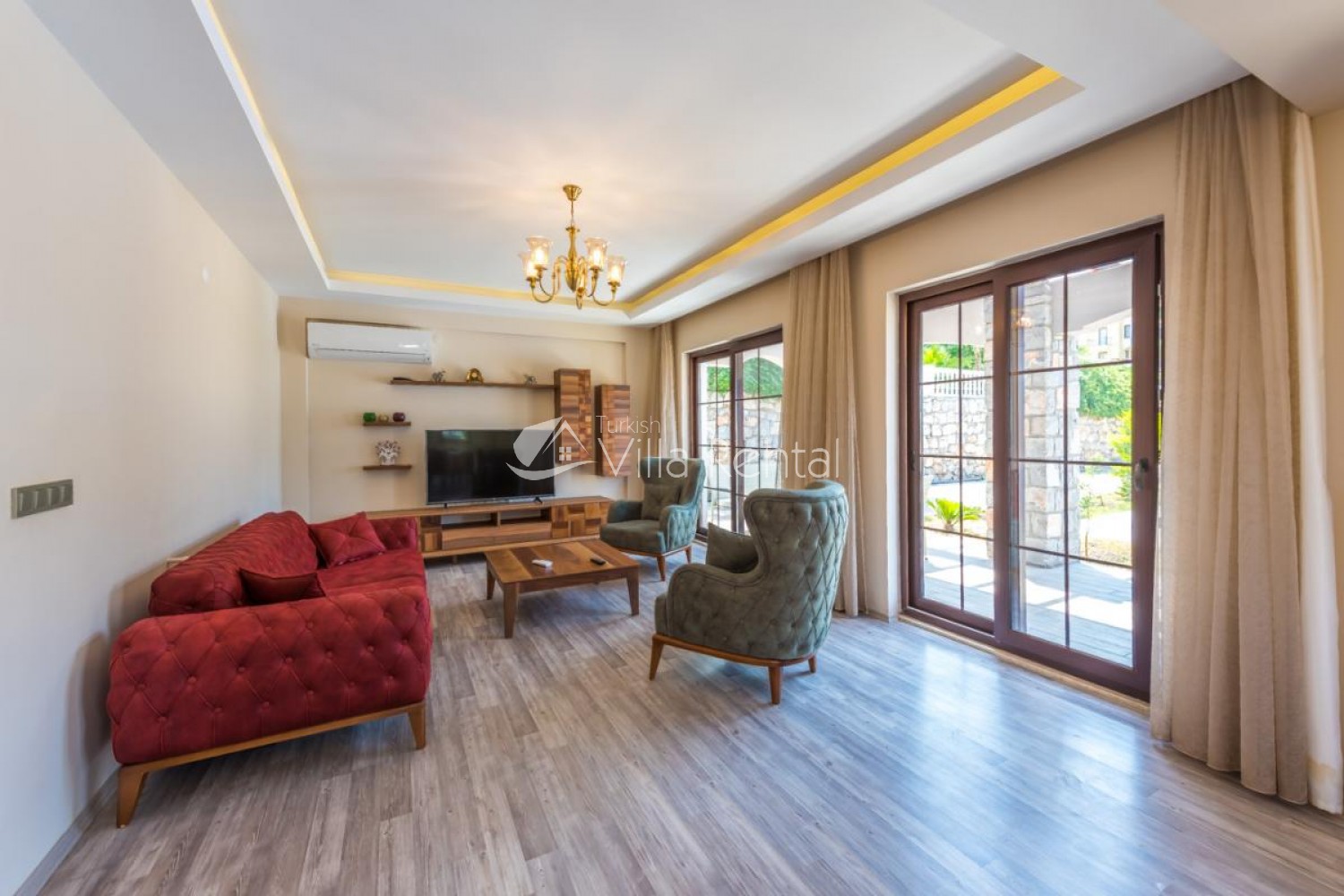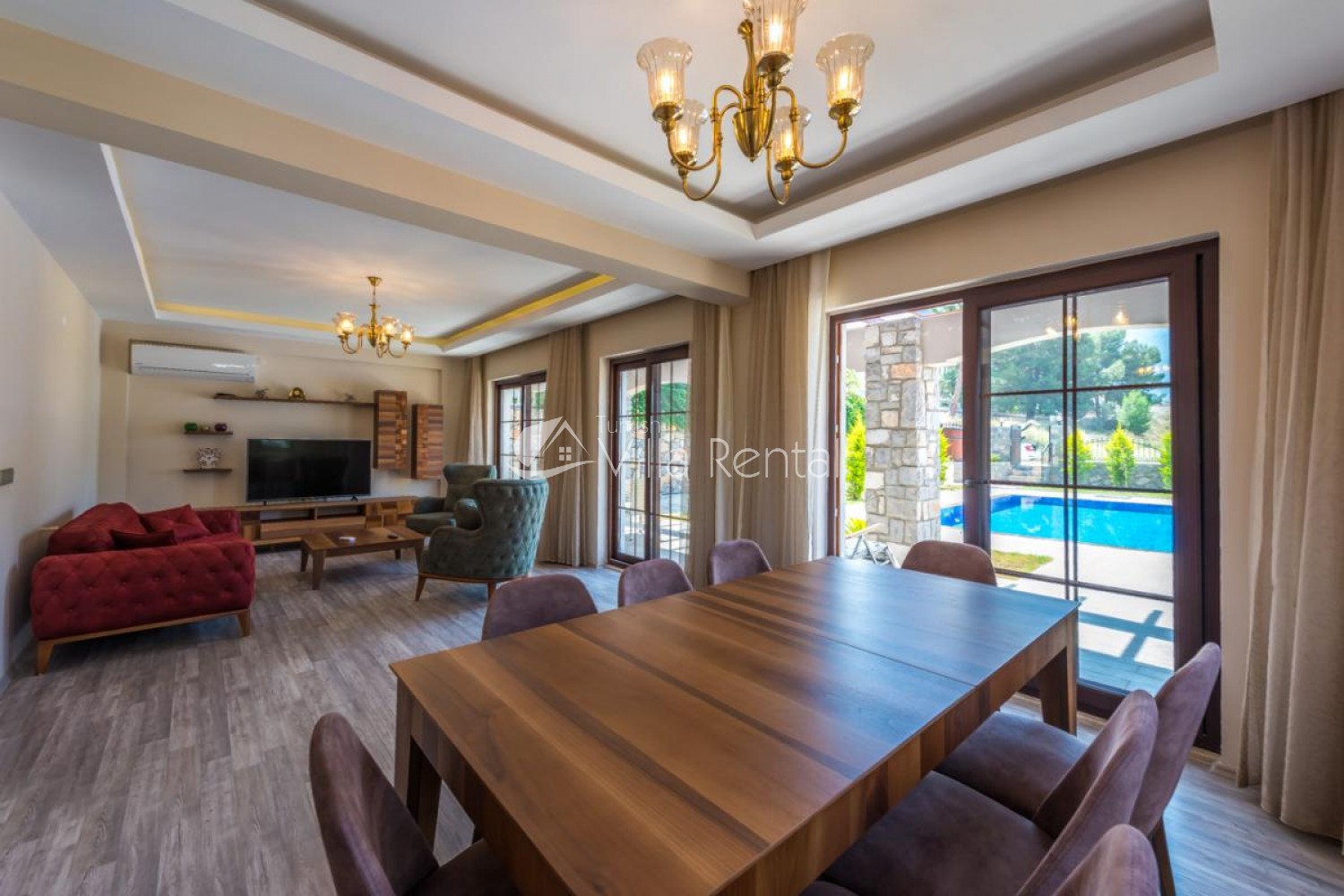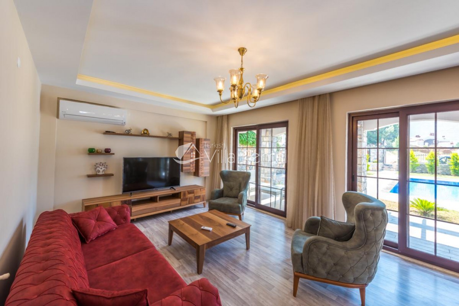 Hall There is a nature hall on the ground floor of Villa Olivya. The lounge has a TV, satellite receiver, sofa set, dining table, air conditioning and access to the pool area.
