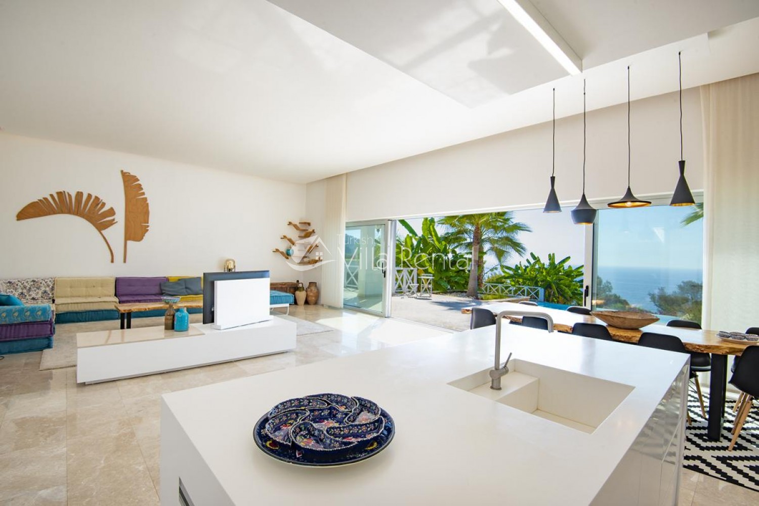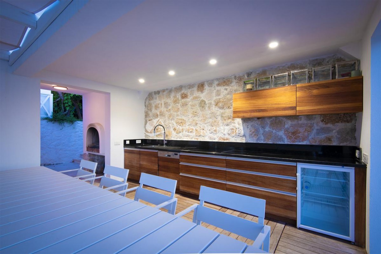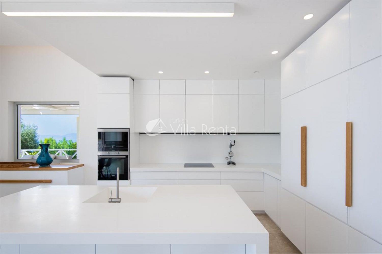 Kitchen: Modern American kitchen with sea views, fully equipped with Refrigerator, Dishwasher, Washing Machine, Oven, Microwave Oven, Built-in cooker, Electric Kettle, Toaster, 8 Person Dining Set, Pans, Pots, Crockery and Cutlery.