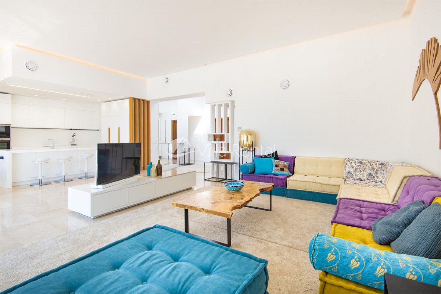 Living Room: Comfortable lounge area with sea view, air conditioning, Sink, Iron, Ironing Board, Vacuum Cleaner, Pool Side access, and Wireless Modem, WC and a wash basin.