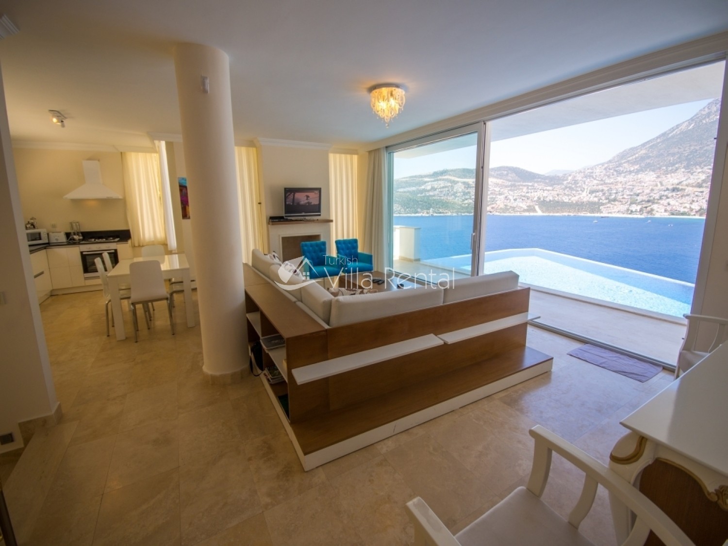 Living Room: Open plan with kitchen and dining area, full sea view lounge, LCD TV, satellite TV channels, patio doors to terrace and pool area.