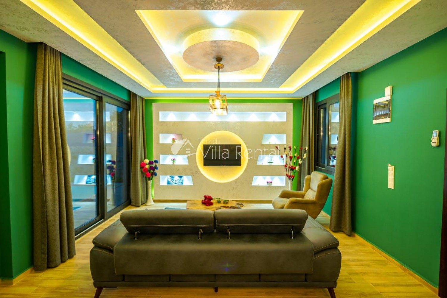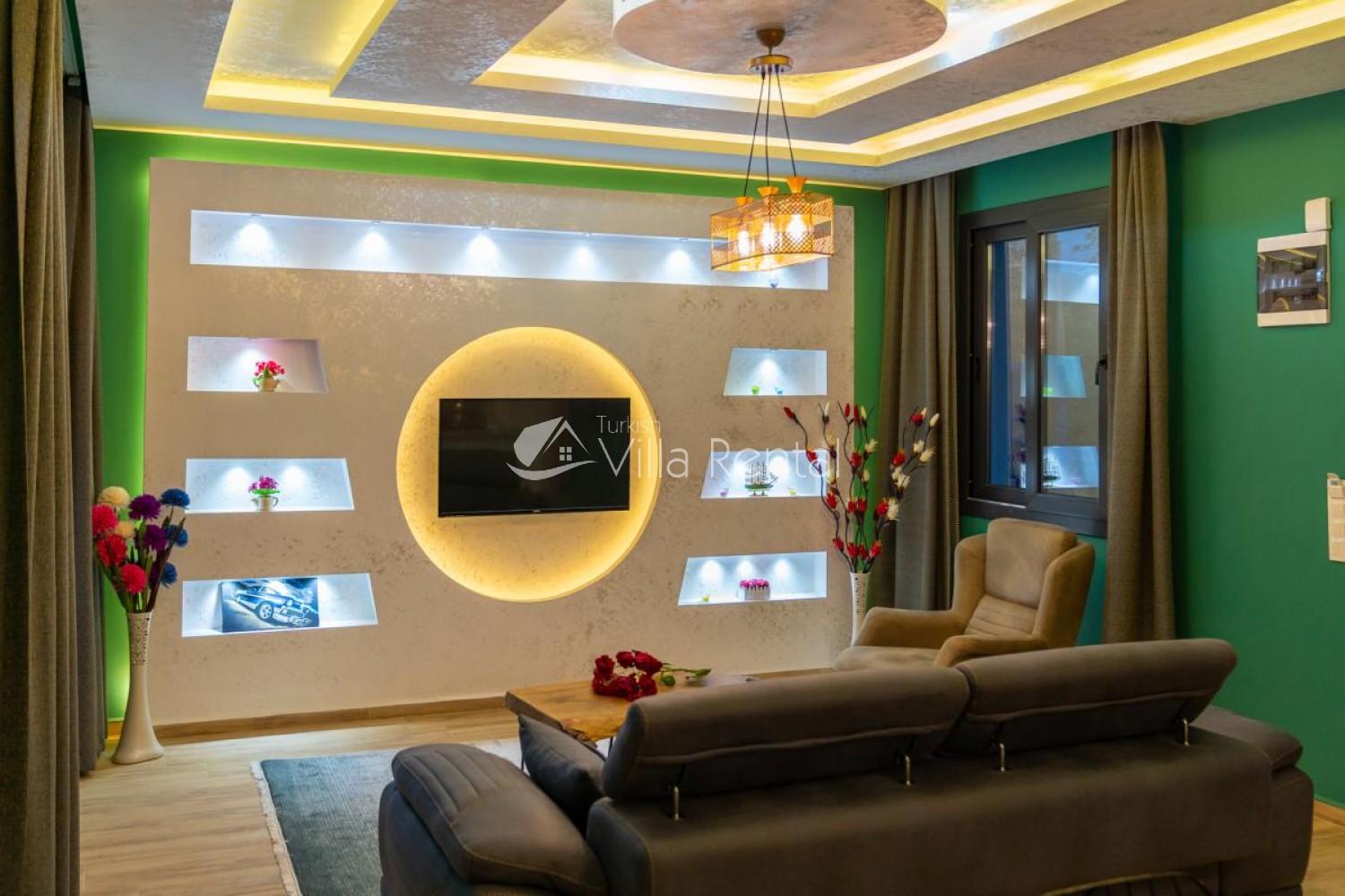 Living Room: The lounge has LCD TV, satellite receiver, modern sofa set, air conditioning and exit to the pool terrace.
