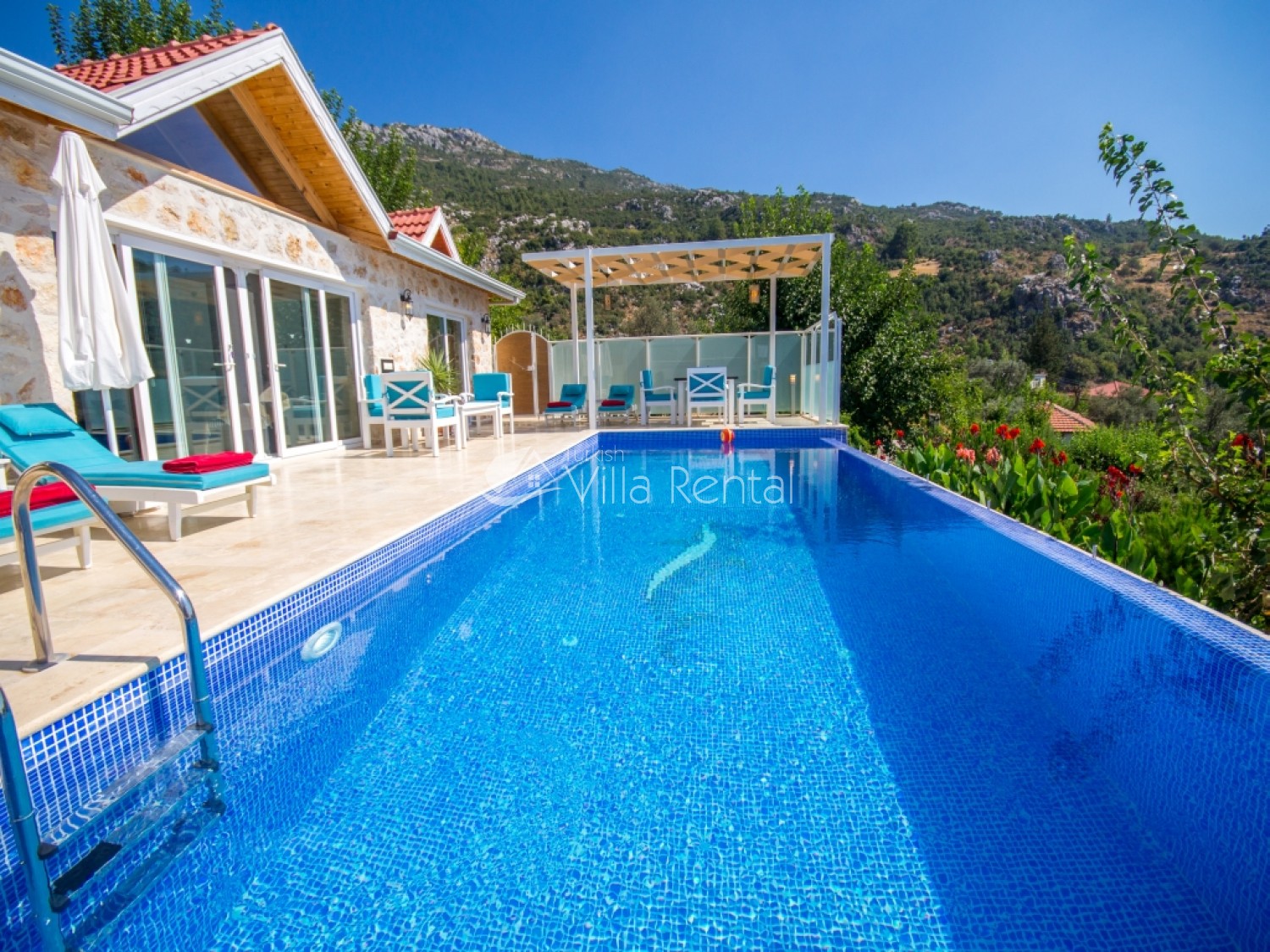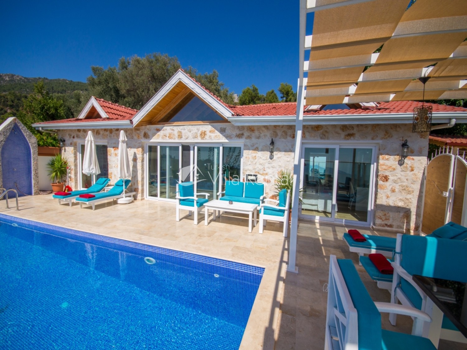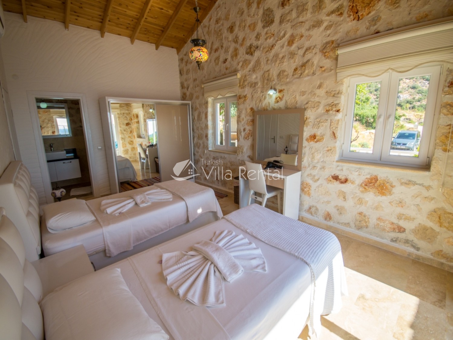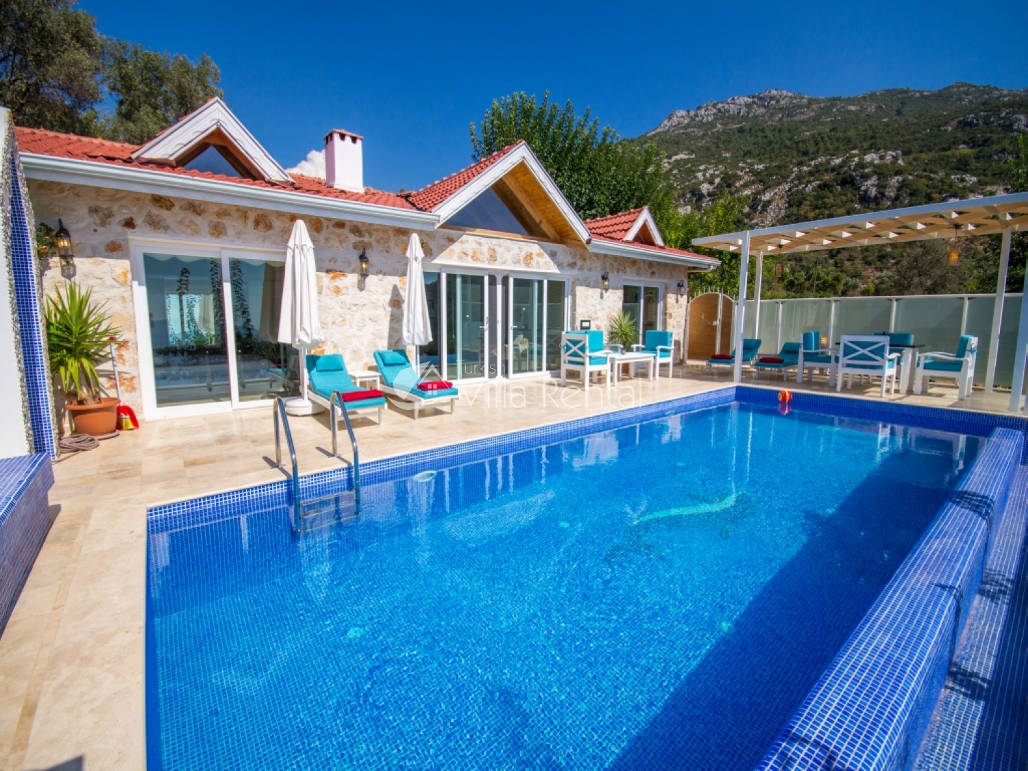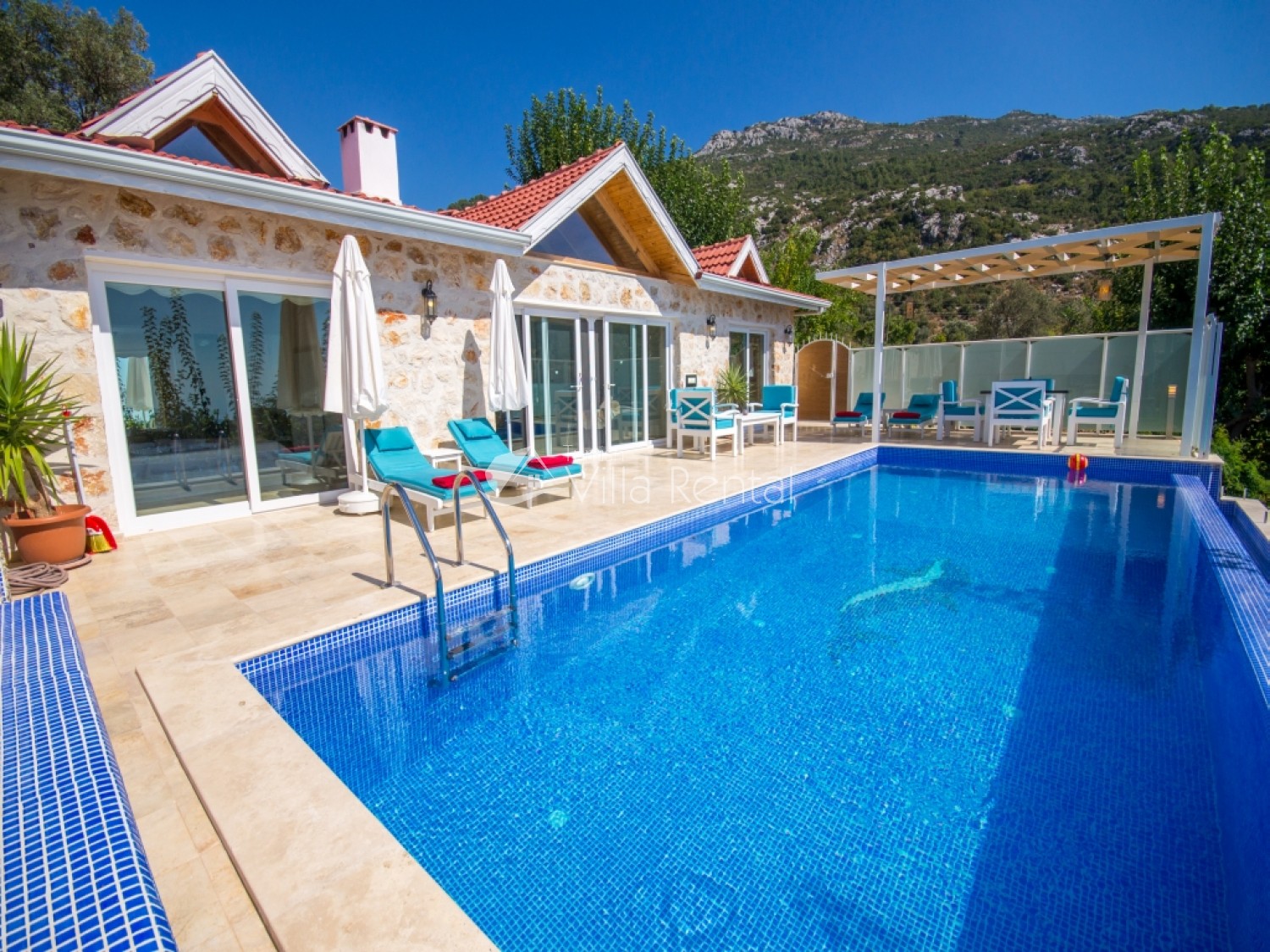 Villa Sade is a modern, 2 bedroom villa which is full of charm and character. It is set in a peaceful, tranquil area and yet is still only a few minutes’ walk from the local amenities. The villa also comes with breath taking views of the mountain valley leading to Patara beach. The bedrooms consist of one double room, and one twin room, which makes the villa a perfect family holiday home, as well as an ideal rental for two couples or a small group of friends. Both bedrooms have an en-suite bathroom, as well as a view of the pool and sun lounge area. The beautiful and lively town of Kalkan is just a 20 minute drive where you will find sophisticated restaurants, cafes, and bars.