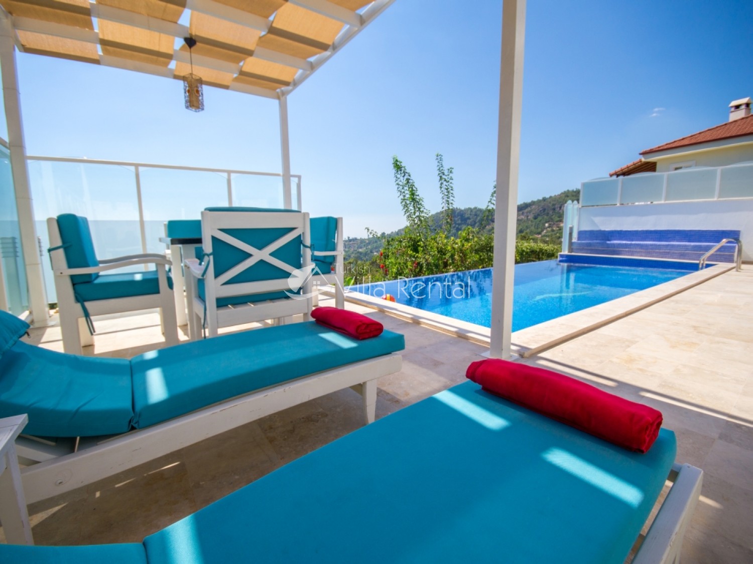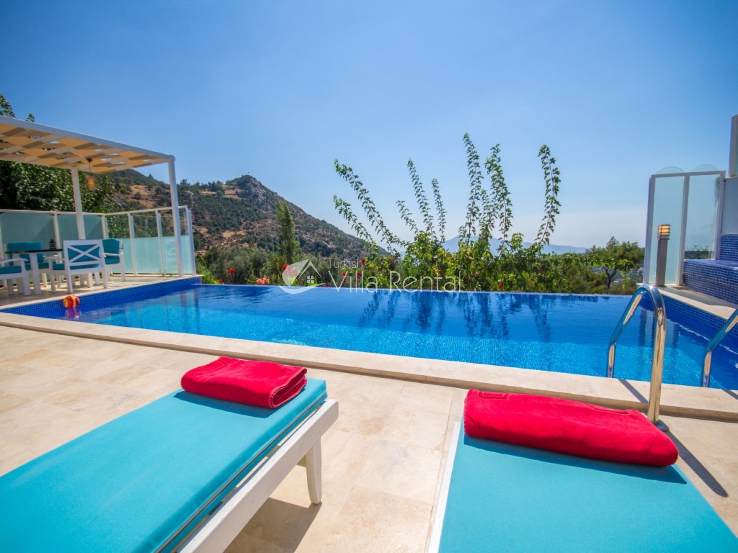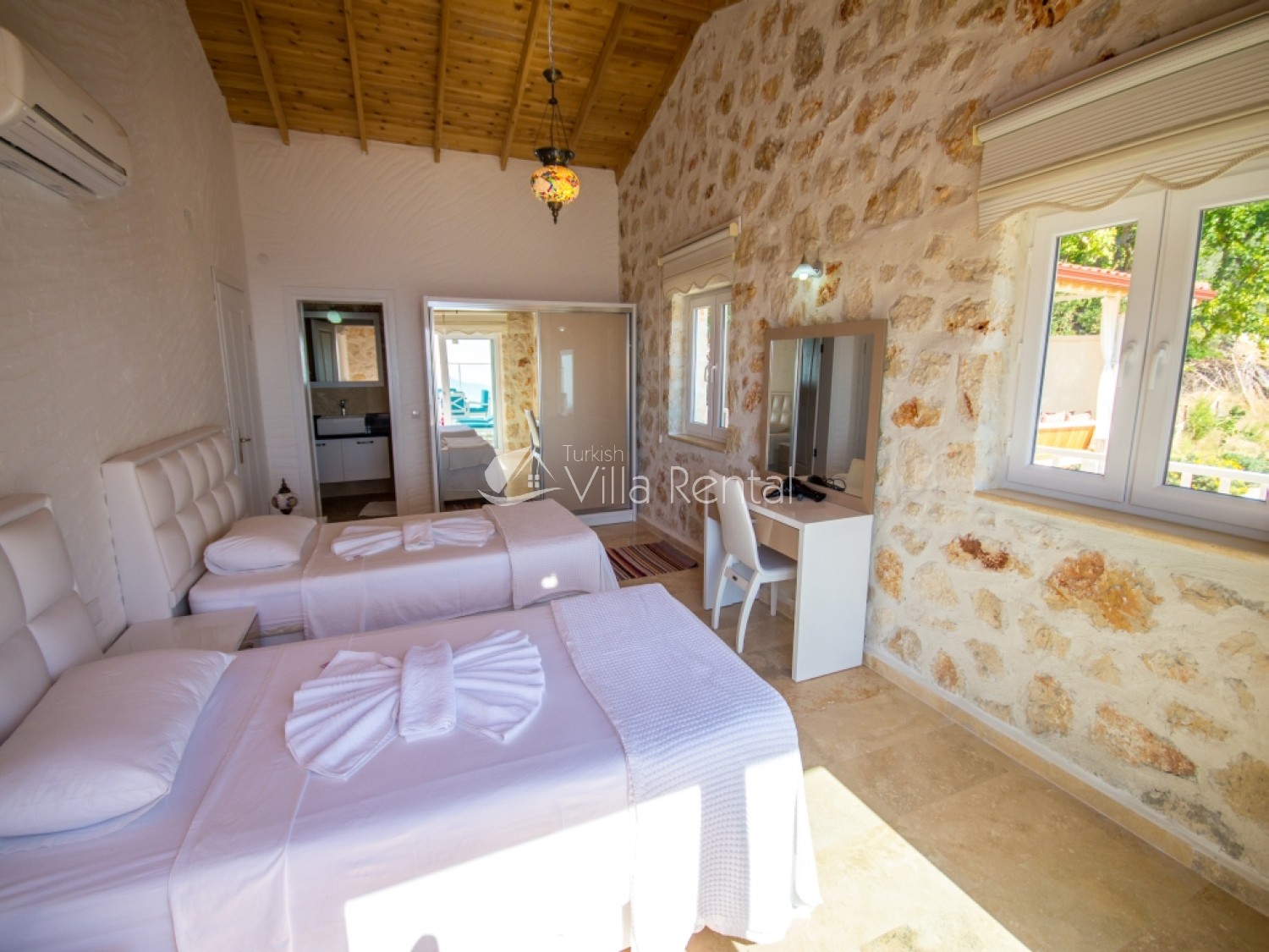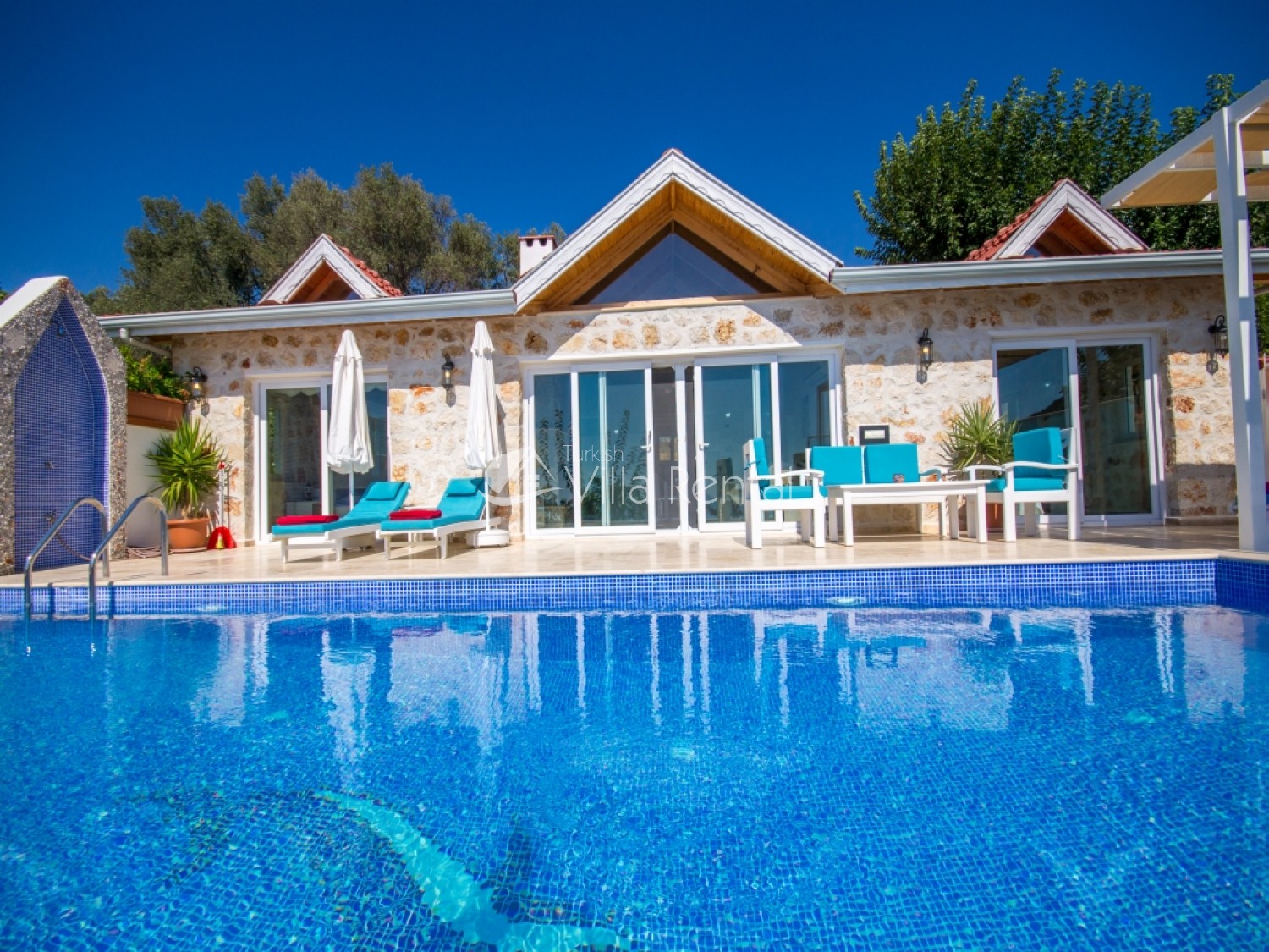 Villa Sade is a modern, 2 bedroom villa which is full of charm and character. It is set in a peaceful, tranquil area and yet is still only a few minutes’ walk from the local amenities. The villa also comes with breath taking views of the mountain valley leading to Patara beach. The bedrooms consist of one double room, and one twin room, which makes the villa a perfect family holiday home, as well as an ideal rental for two couples or a small group of friends. Both bedrooms have an en-suite bathroom, as well as a view of the pool and sun lounge area. The beautiful and lively town of Kalkan is just a 20 minute drive where you will find sophisticated restaurants, cafes, and bars.
