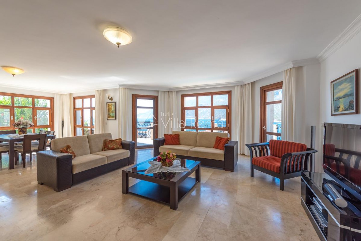 Lounge: Seaview with sea view, air-conditioned villa has DVD Player, LCD TV, satellite receiver, sitting group dining table and chairs. There is a pool edge exit. Pool floor.