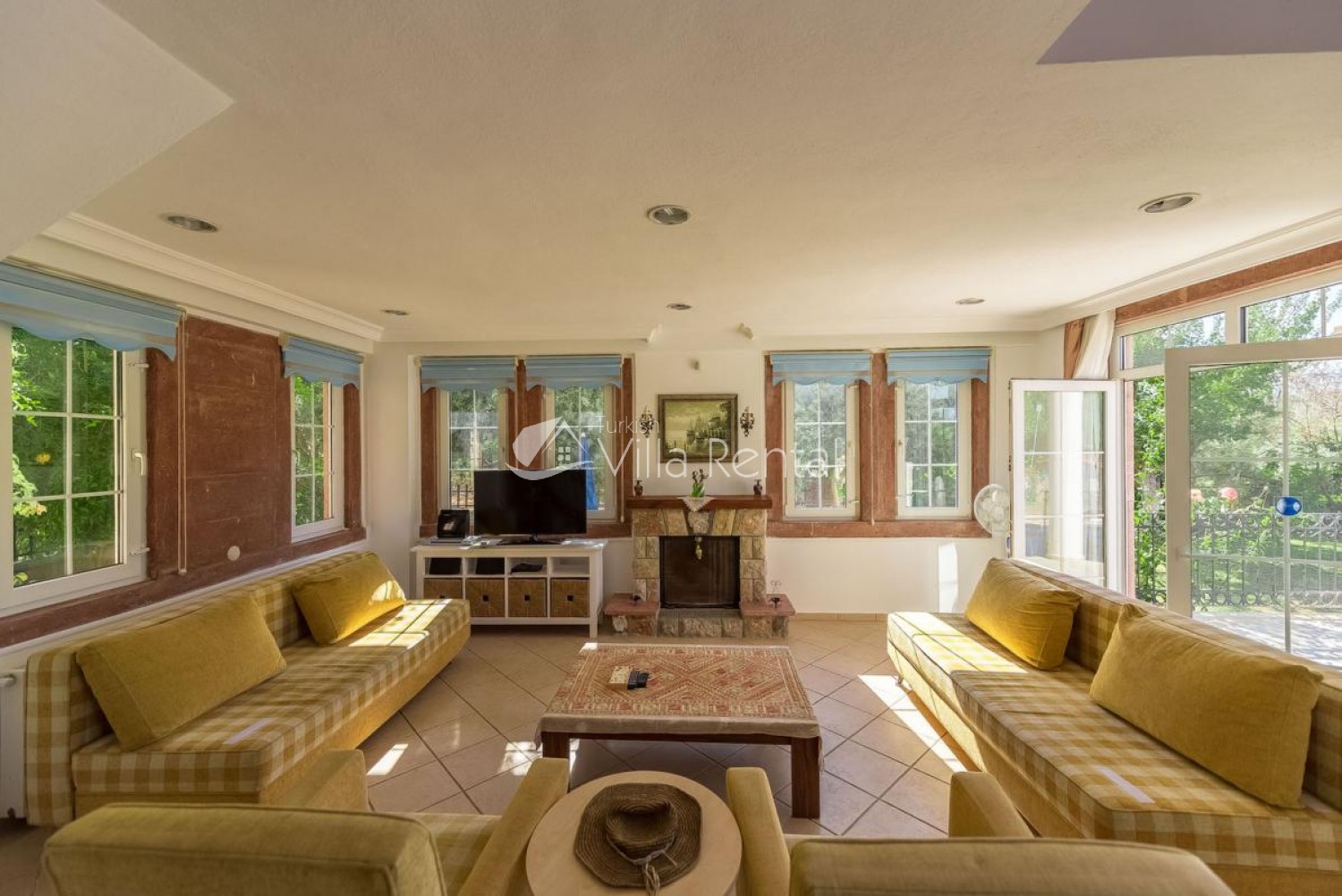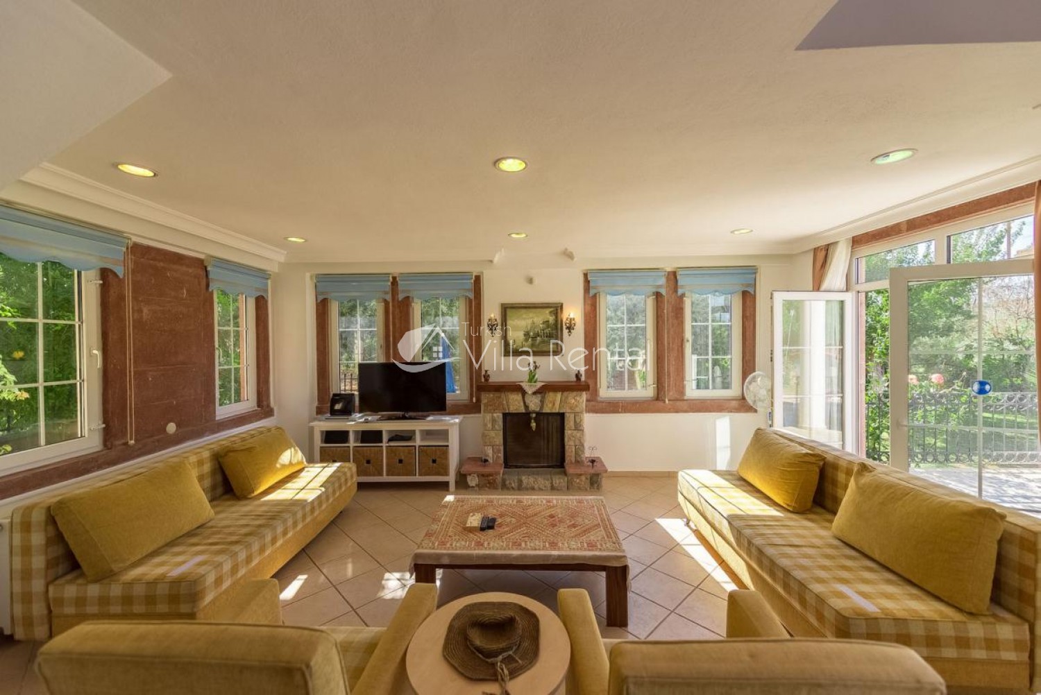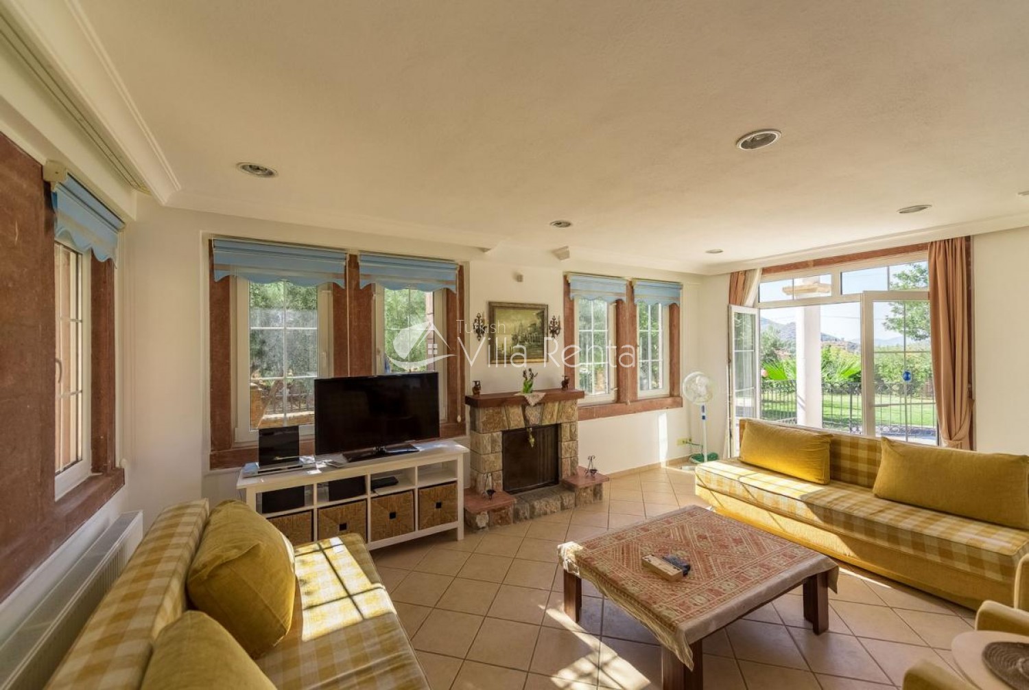 Lounge: Comfortable seating area with coffee table, fire place, free standing fan, Satellite TV, Flat screen TV, DVD player, CD player, Patio doors, Terrace.