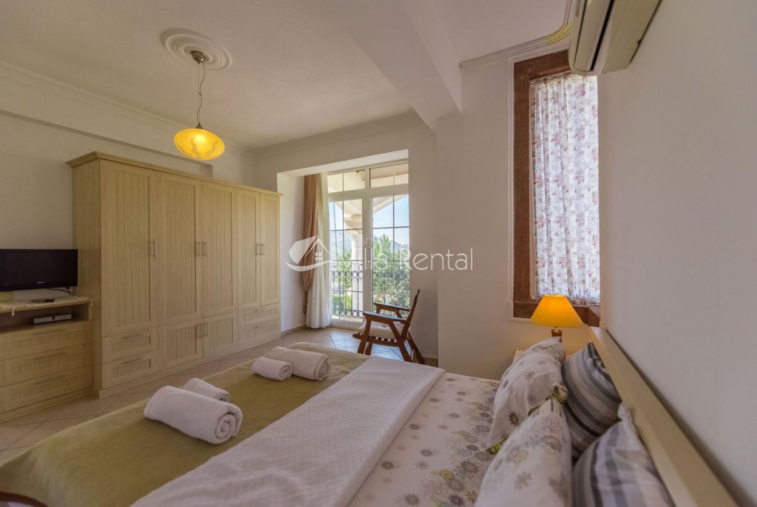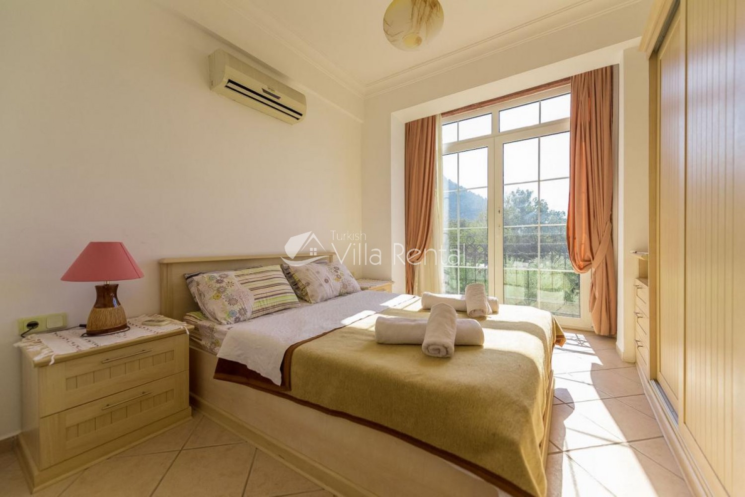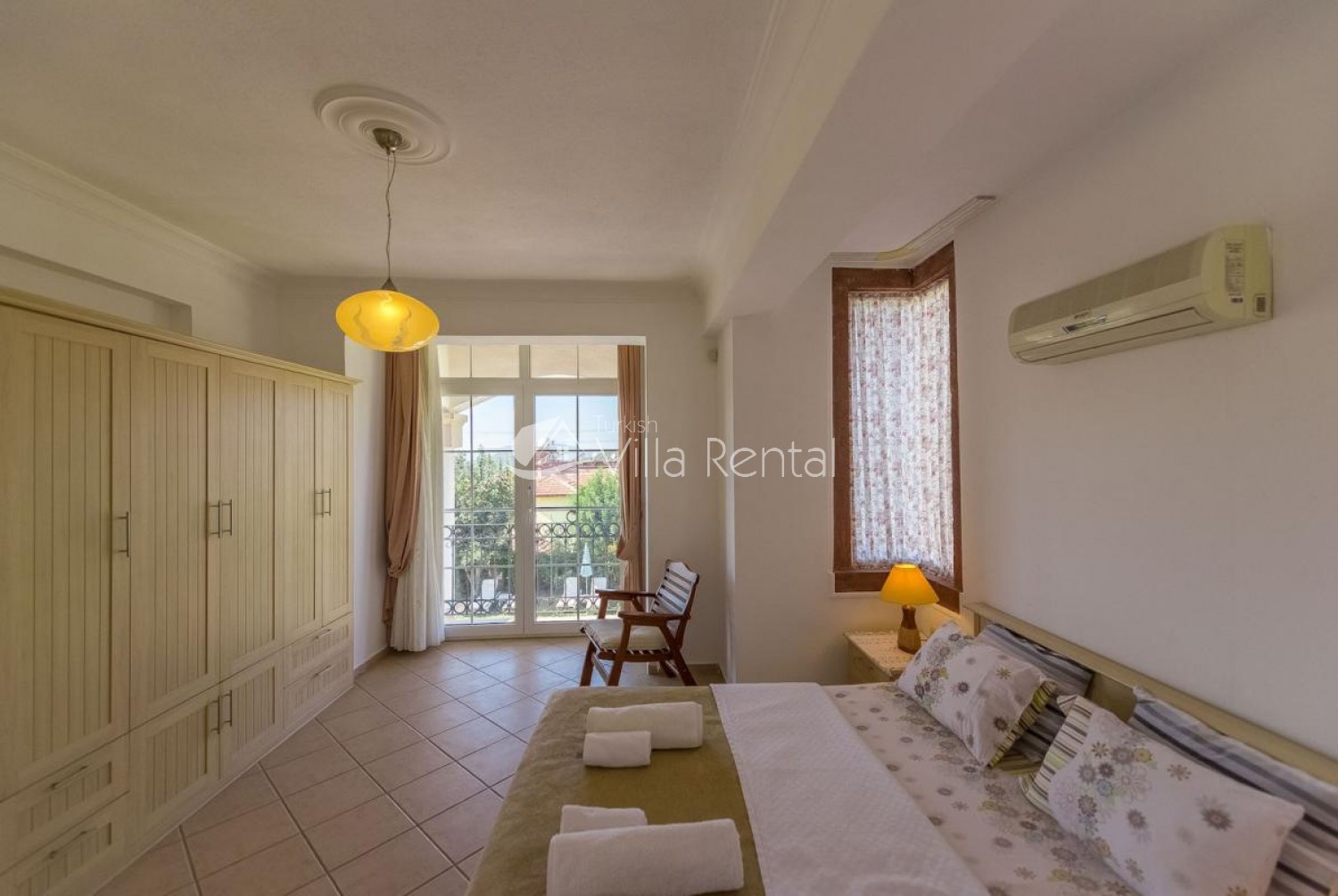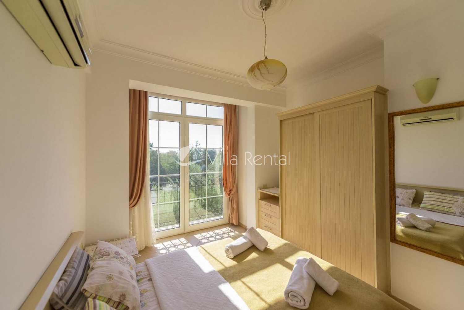 Bedroom 2: Double bed, air-conditioning, patio doors, balcony.