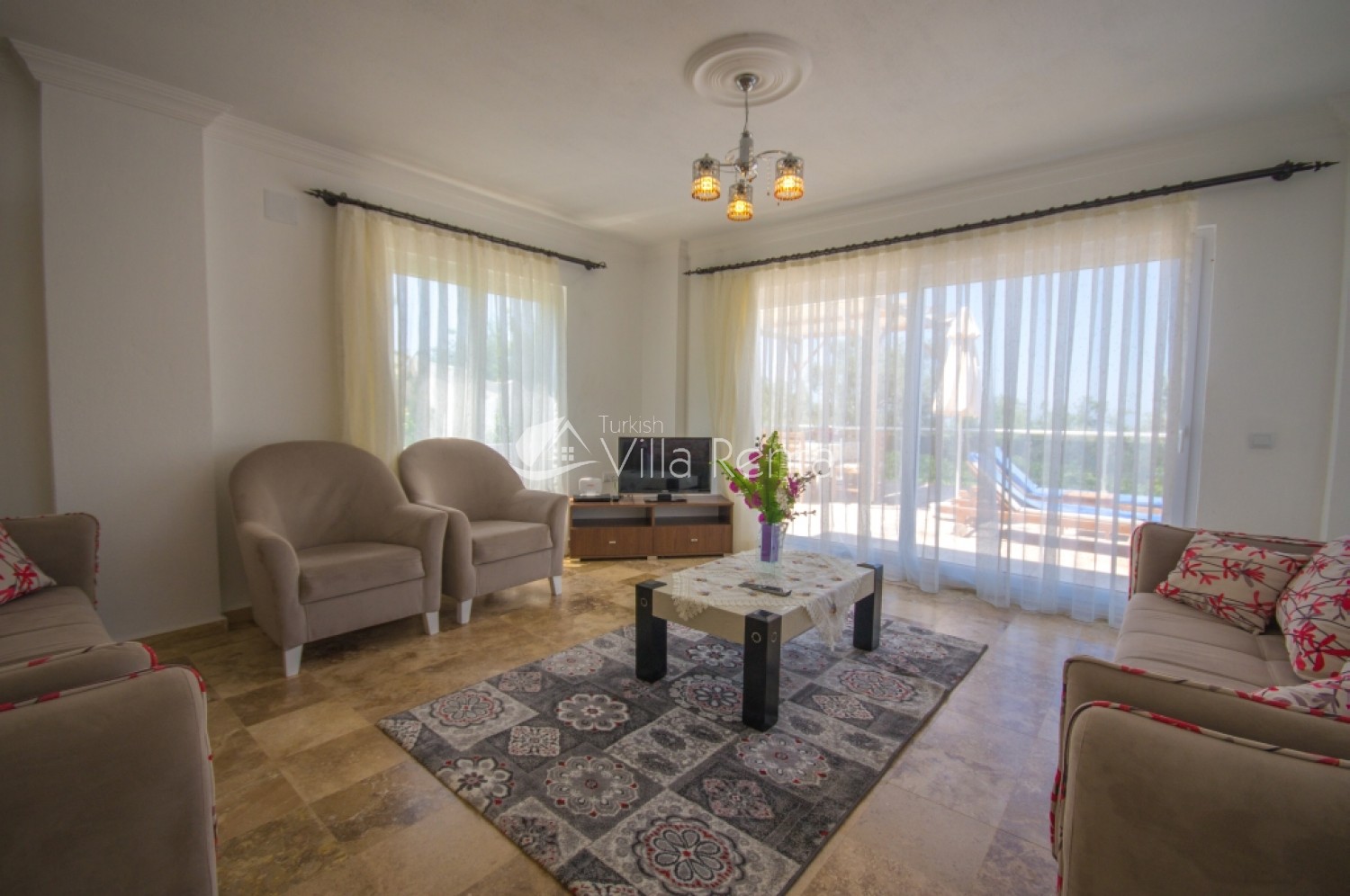 Living Room: Open plan with kitchen and ding area, comfortable and stylish seating area, coffee table, TV, DVD Player, large windows providing views, access to pool and terrace. Wifi internet.
