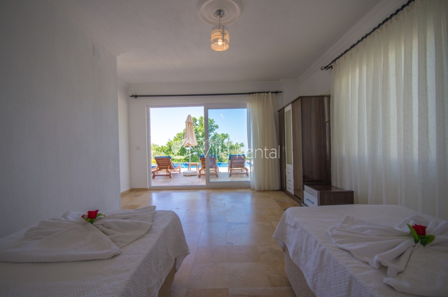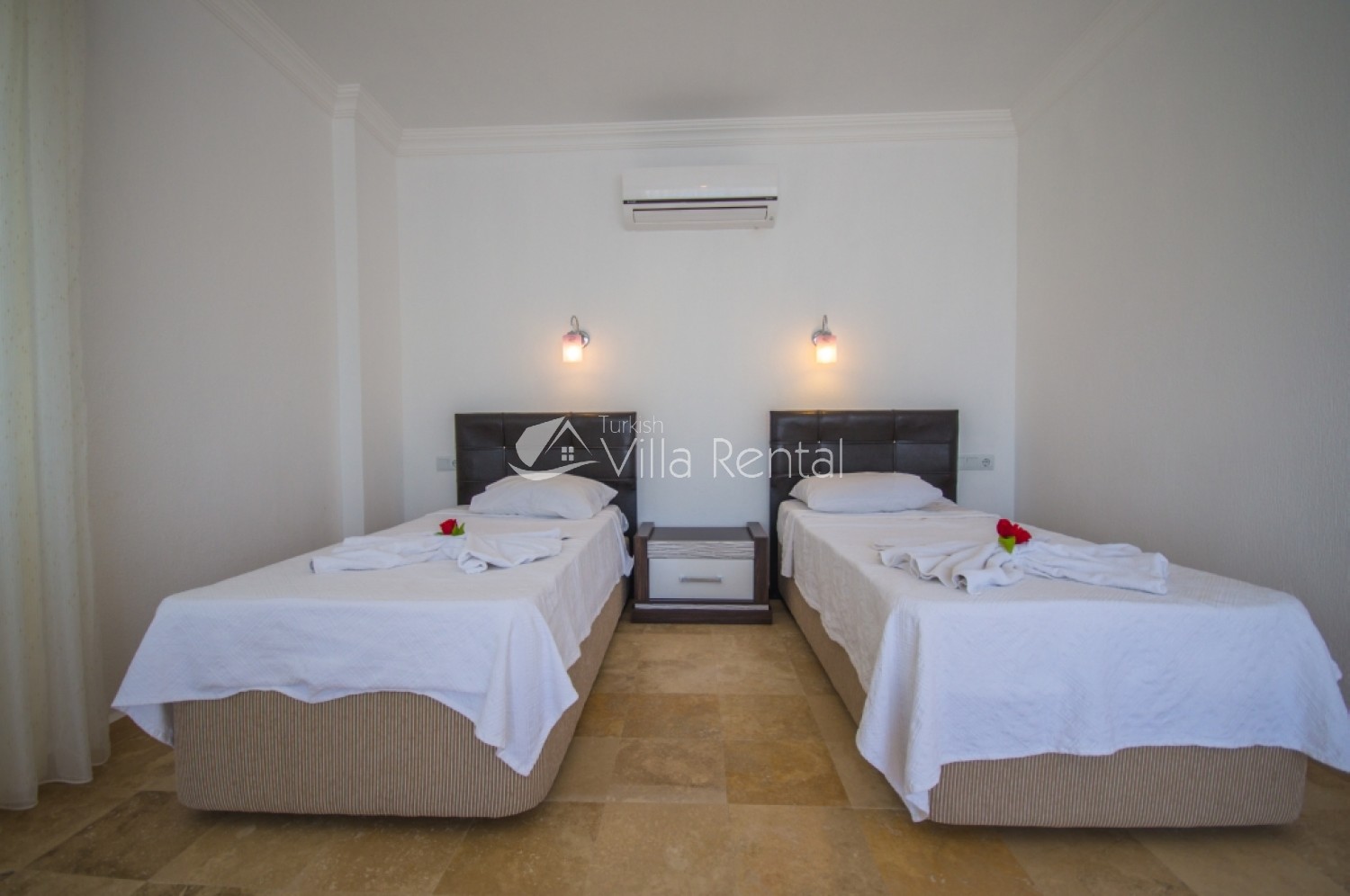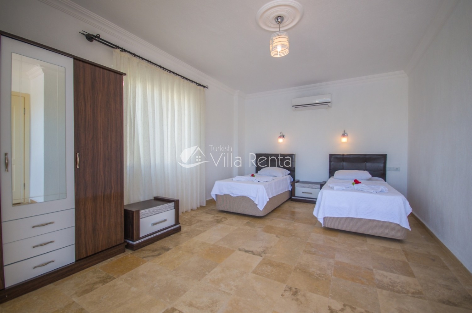 Bedroom 1: Twin beds, en-suite, wardrobe, dressing table, air-conditioning, access to pool terrace, sea views.