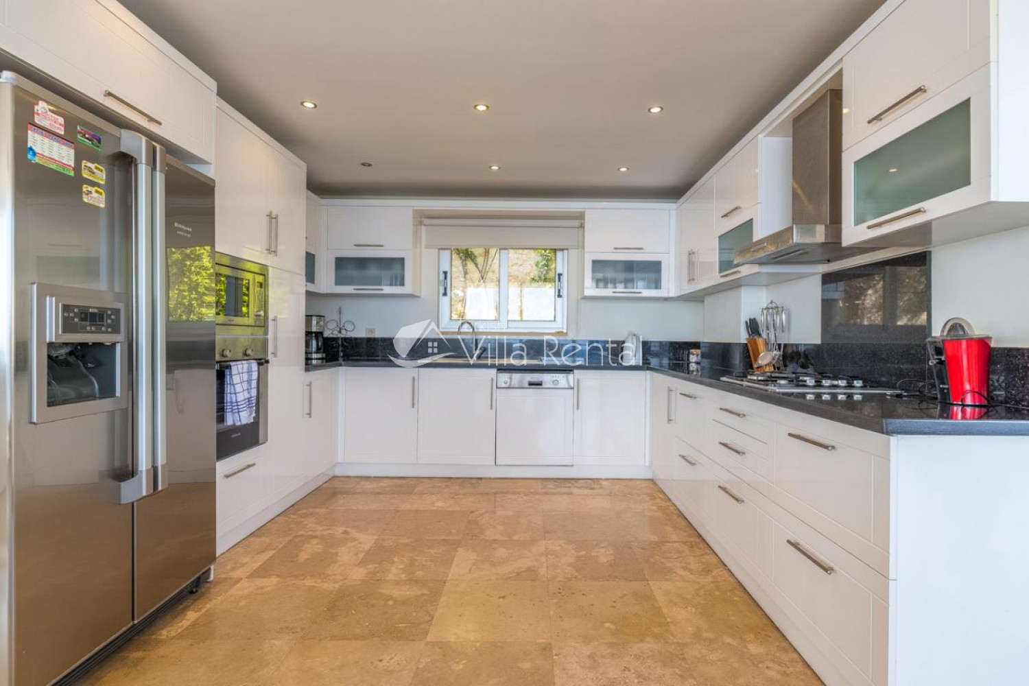 Kitchen Villa The cottage has modern American kitchen. Kitchen has microwave oven, dishwasher, built-in oven, refrigerator, washing machine, built-in 4-burner, electric kettle kettle, toaster, pots and pans, dinner set for 12 people, spoon and fork set and glasses. The kitchen is at the pool level.