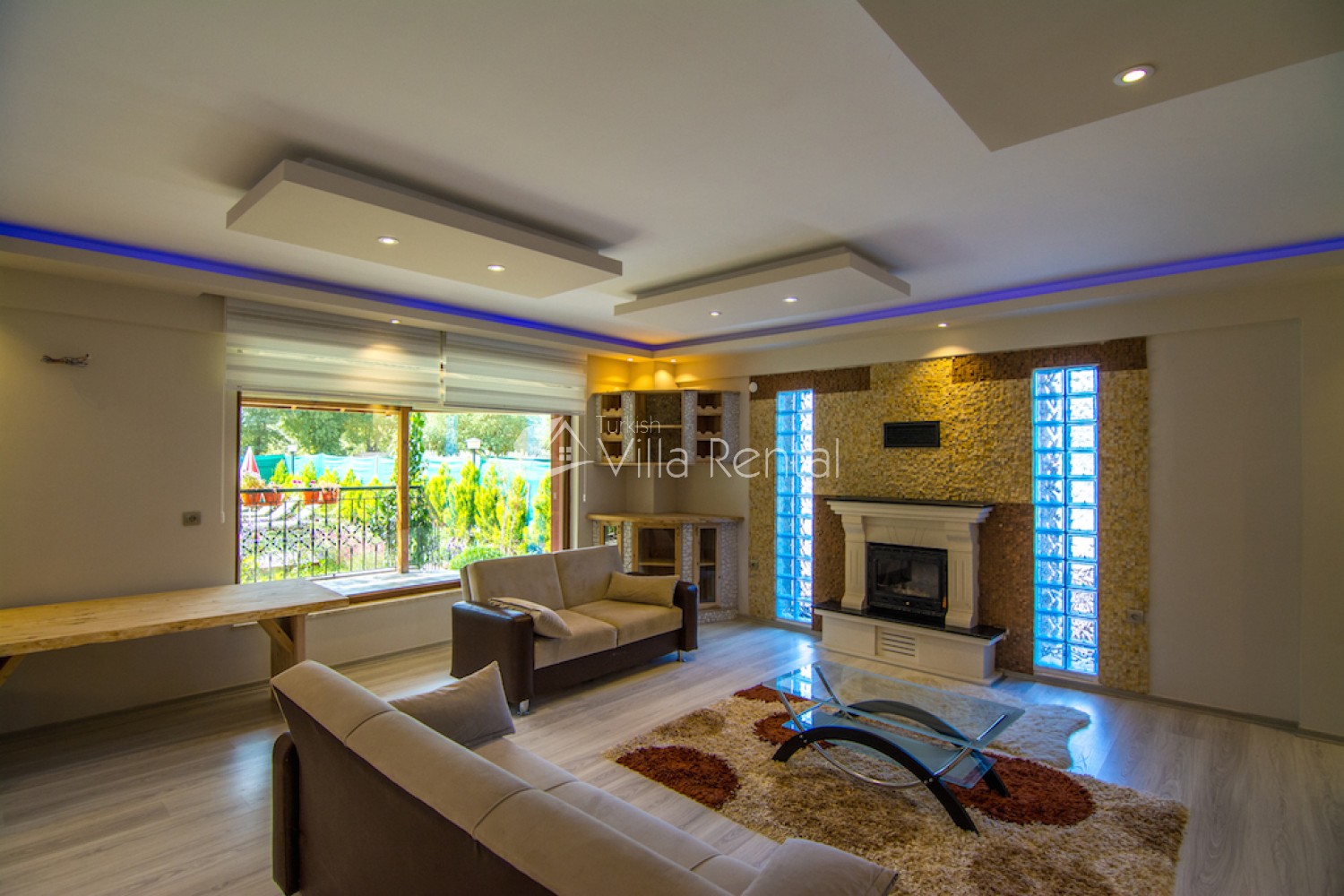 Living Room: modern and spacious living room with comfortable seating, stylish decor, Fireplace, lounge, satellite, TV, 4 seater dining table and access to pool terrace.