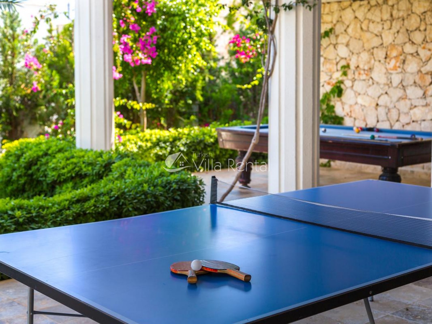 Garden: Private garden and swimming pool, arbor, sitting area for 6 people, dining table for 8 people and chairs, 9 sun loungers, parasols, billiards, table tennis, shower, barbecue.