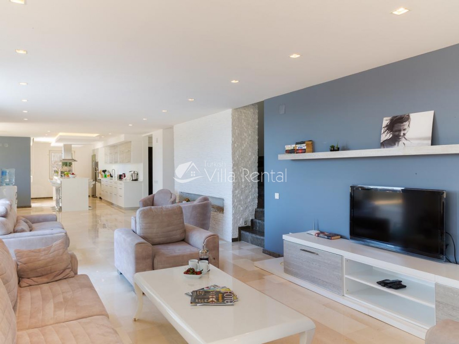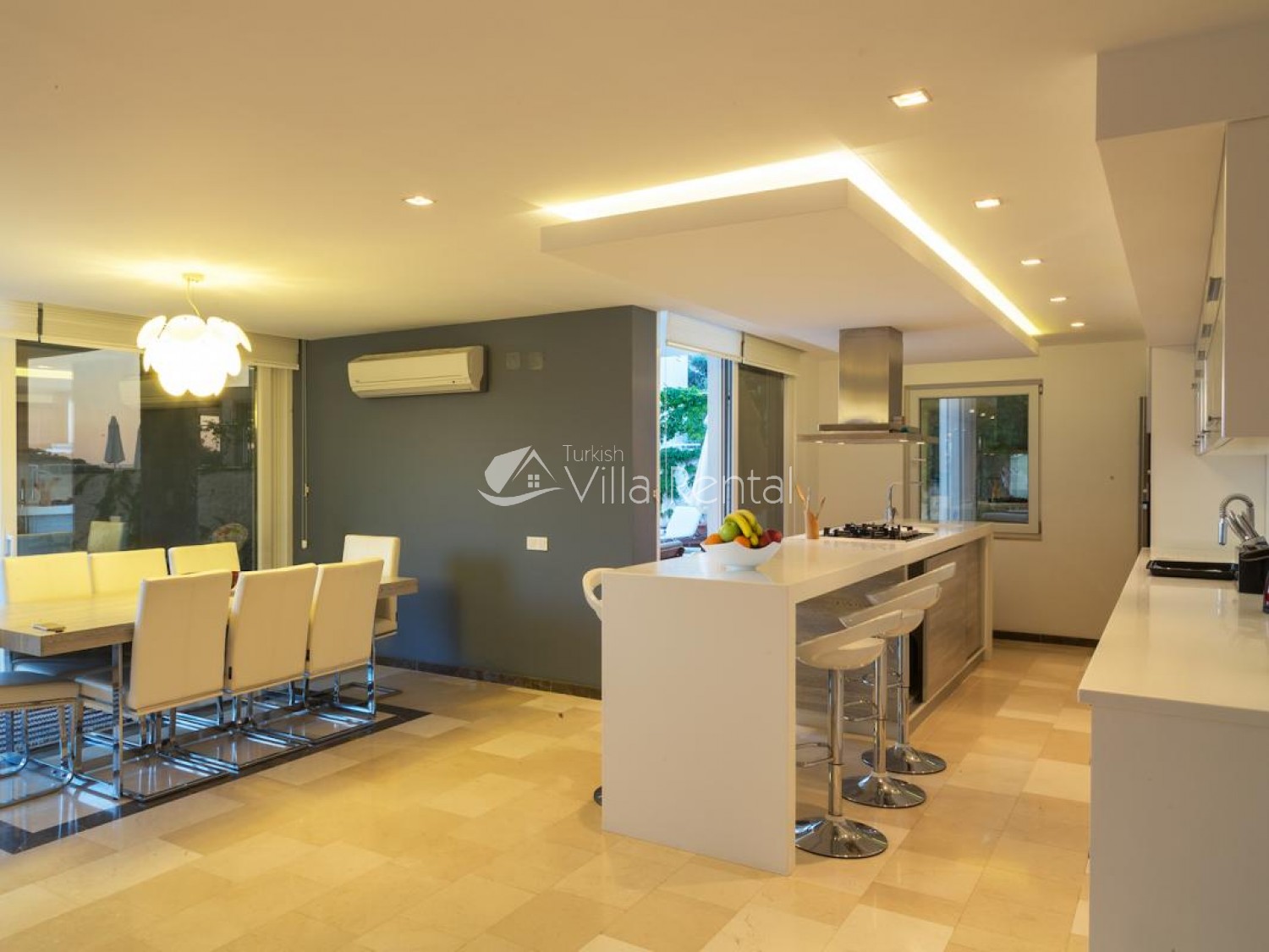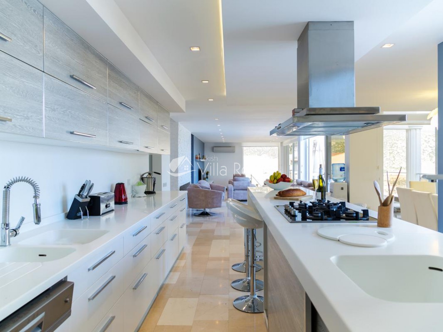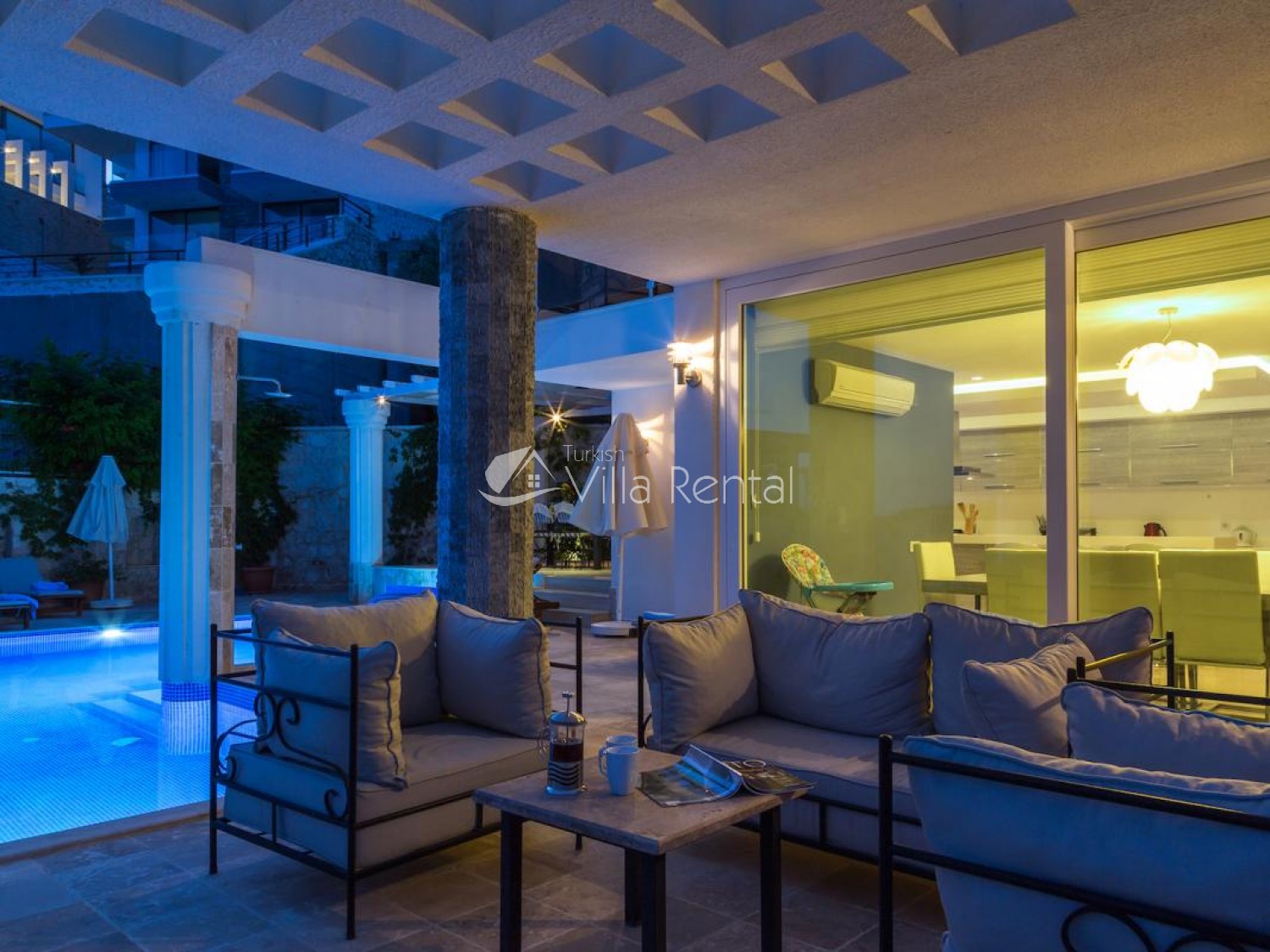 Living Room: There are two lounge areas, air-conditioning, sea views, comfortable seating, TV, satellite receiver and modem for internet. There is a pool-side exit from the lounge.