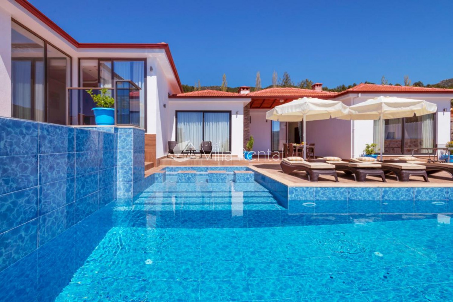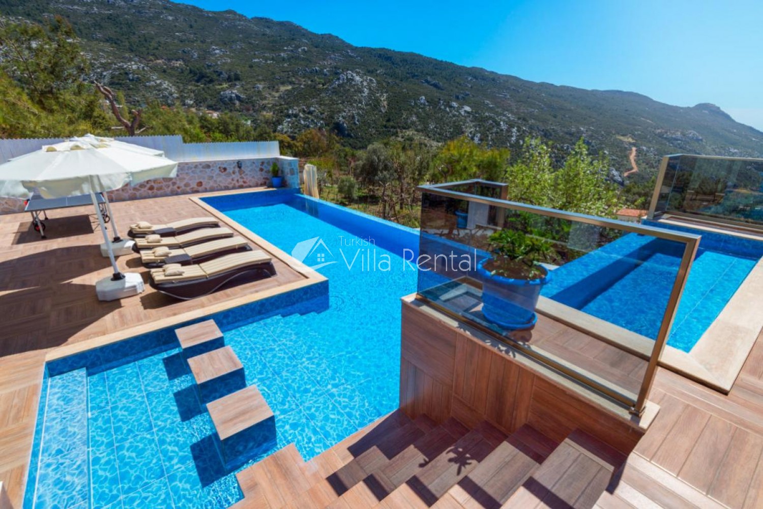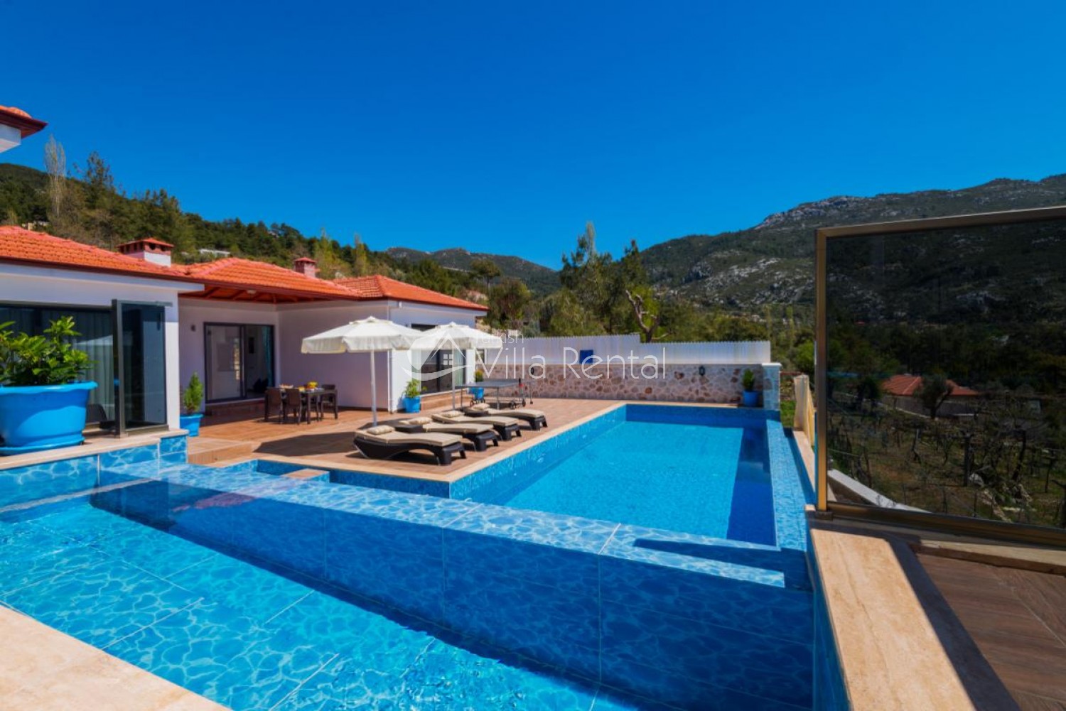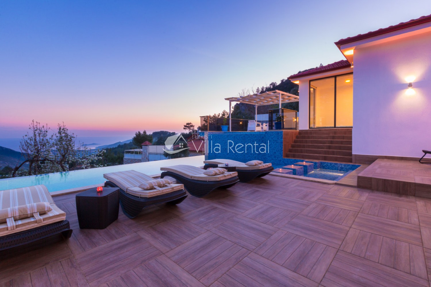 The pool terrace has a private pool of 13x4 metres, a 5x3 metre jacuzzi and a shallow pool / children swimming pool with a size of 3.5x3 metres. All of these pools are sheltered and not visible from the outside which makes it perfect for honeymoon couples or small families who require privacy. 7 km to the center of Kalkan.