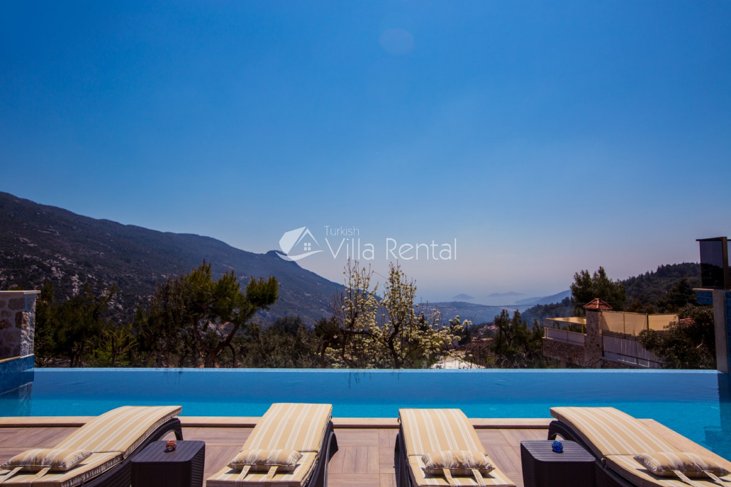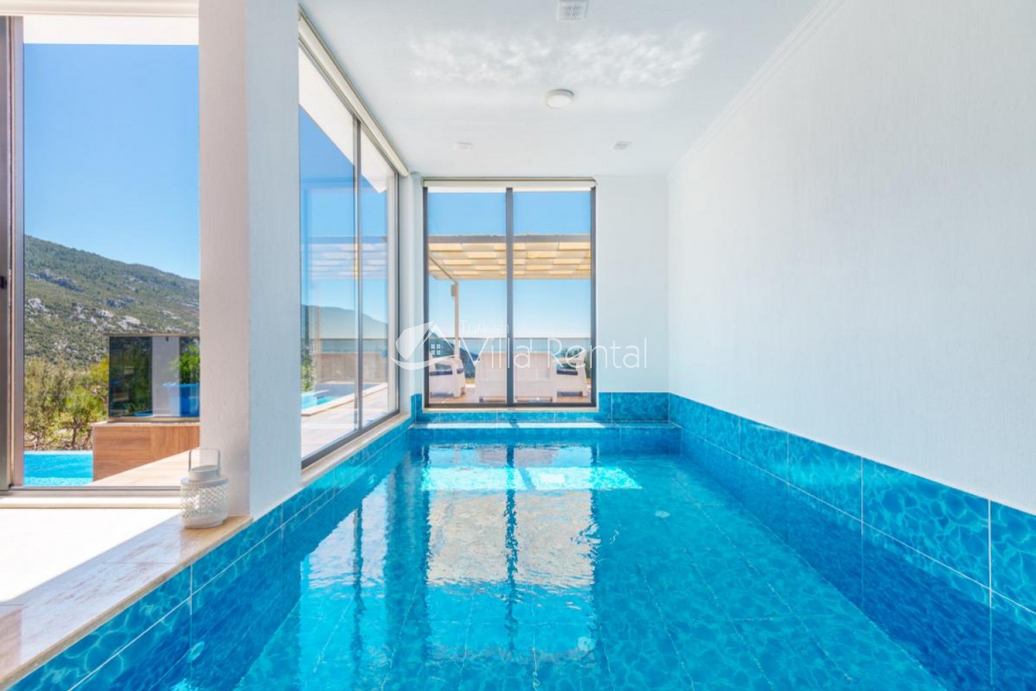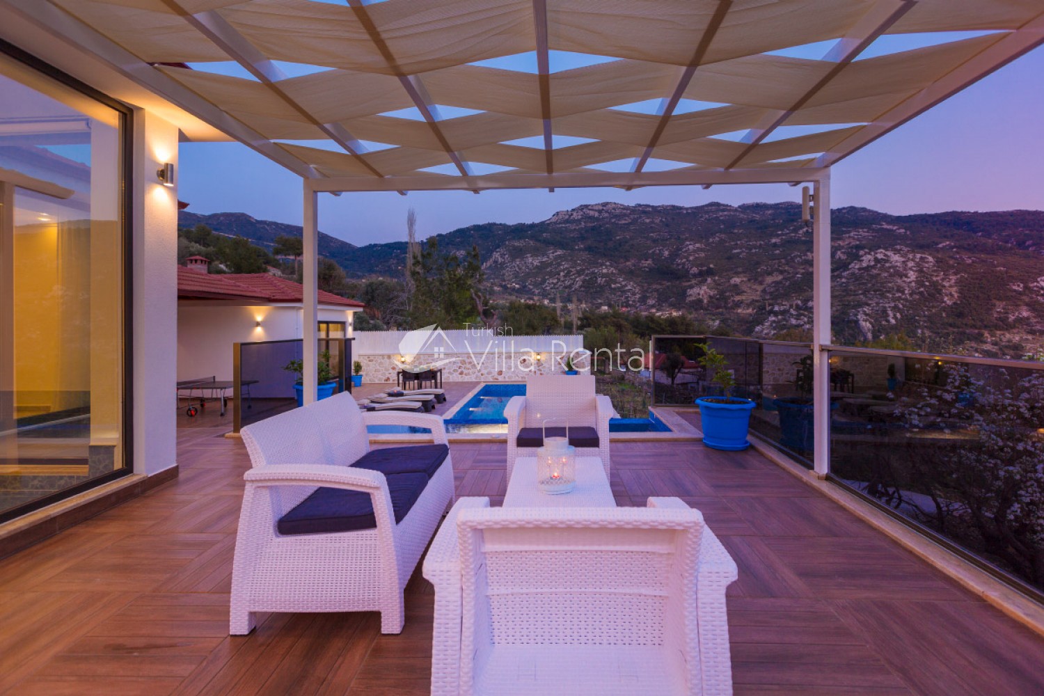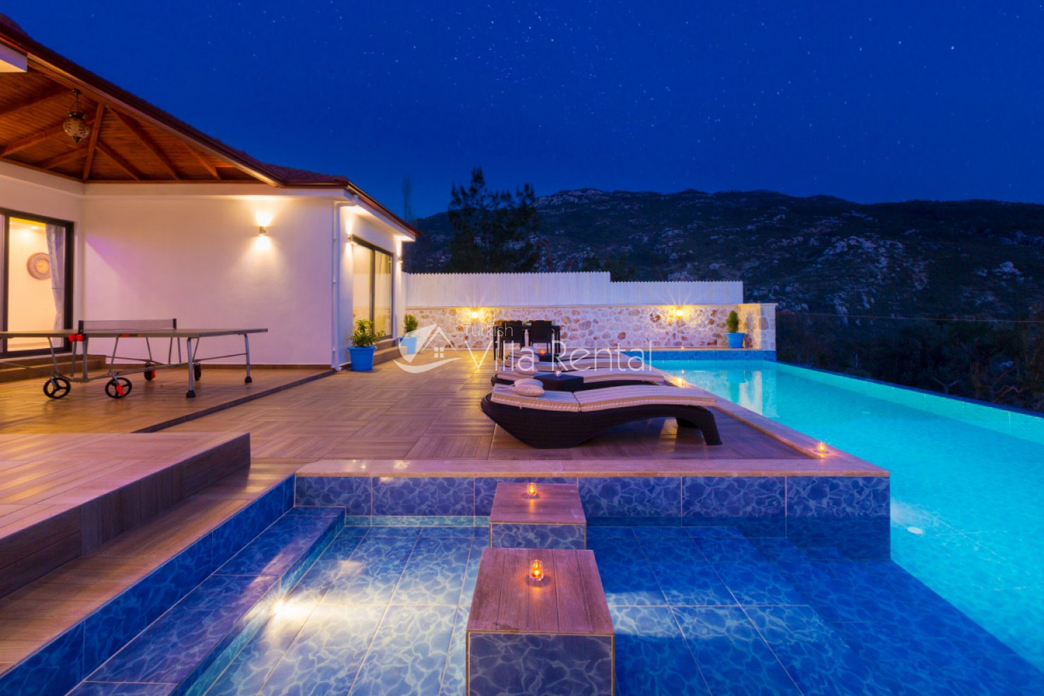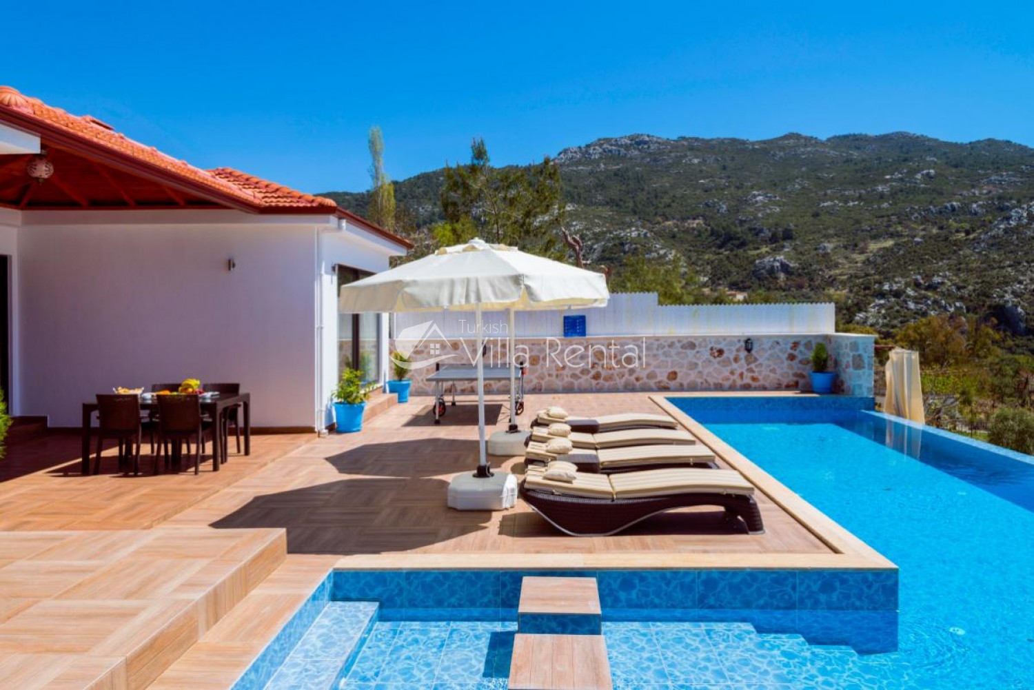 The pool terrace has a private pool of 13x4 metres, a 5x3 metre jacuzzi and a shallow pool / children swimming pool with a size of 3.5x3 metres. All of these pools are sheltered and not visible from the outside which makes it perfect for honeymoon couples or small families who require privacy. 7 km to the center of Kalkan.