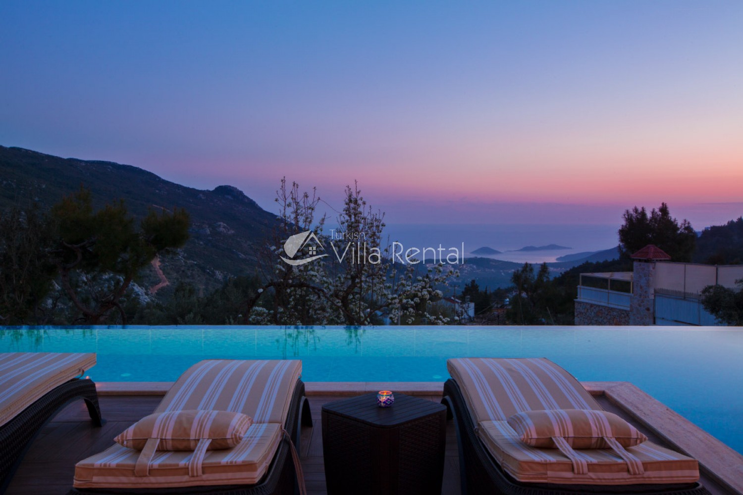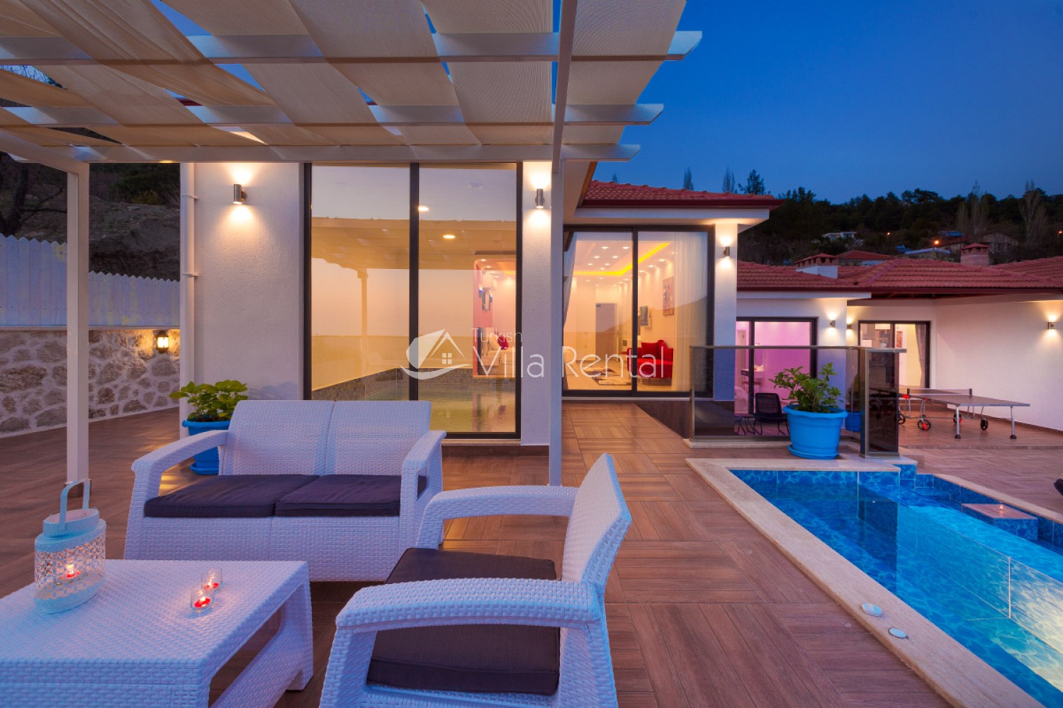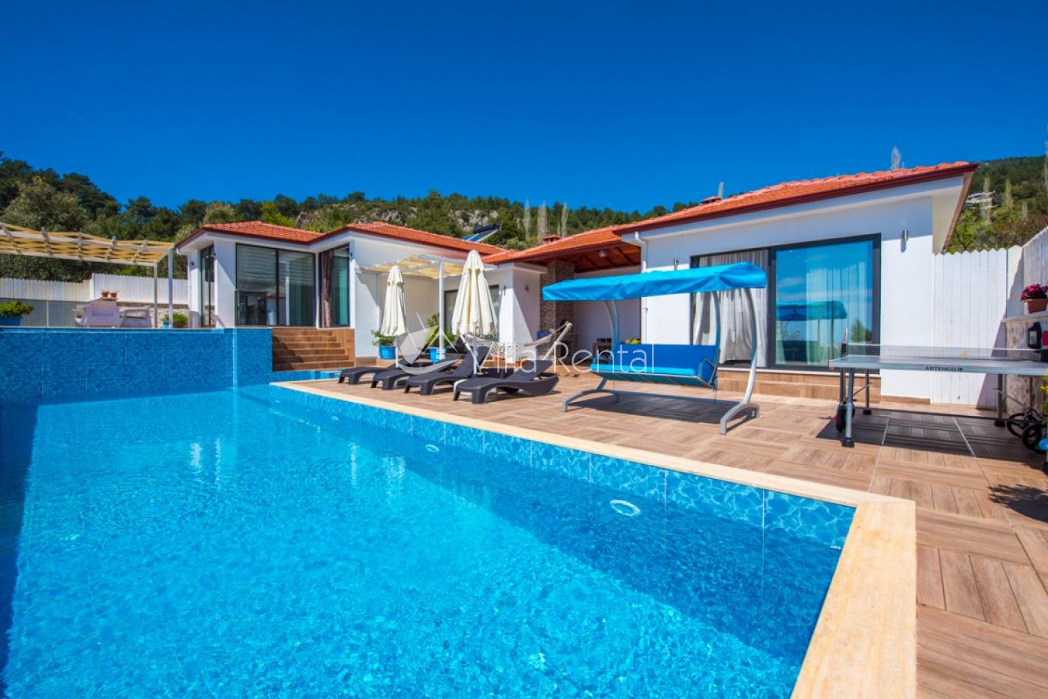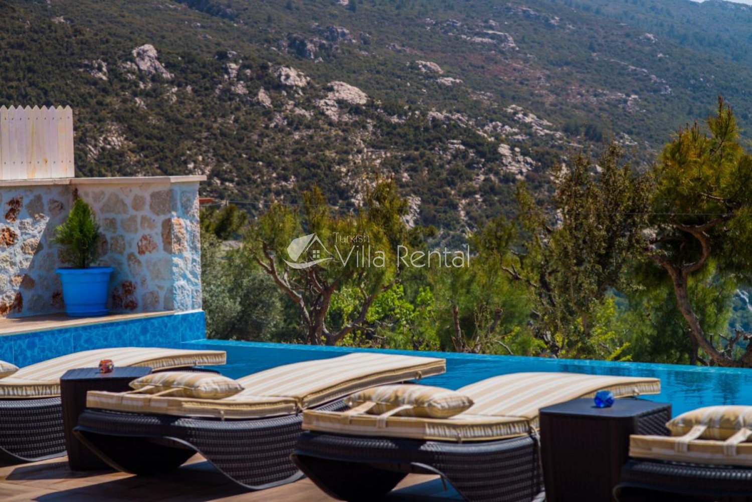The pool terrace has a private pool of 13x4 metres, a 5x3 metre jacuzzi and a shallow pool / children swimming pool with a size of 3.5x3 metres. All of these pools are sheltered and not visible from the outside which makes it perfect for honeymoon couples or small families who require privacy. 7 km to the center of Kalkan.