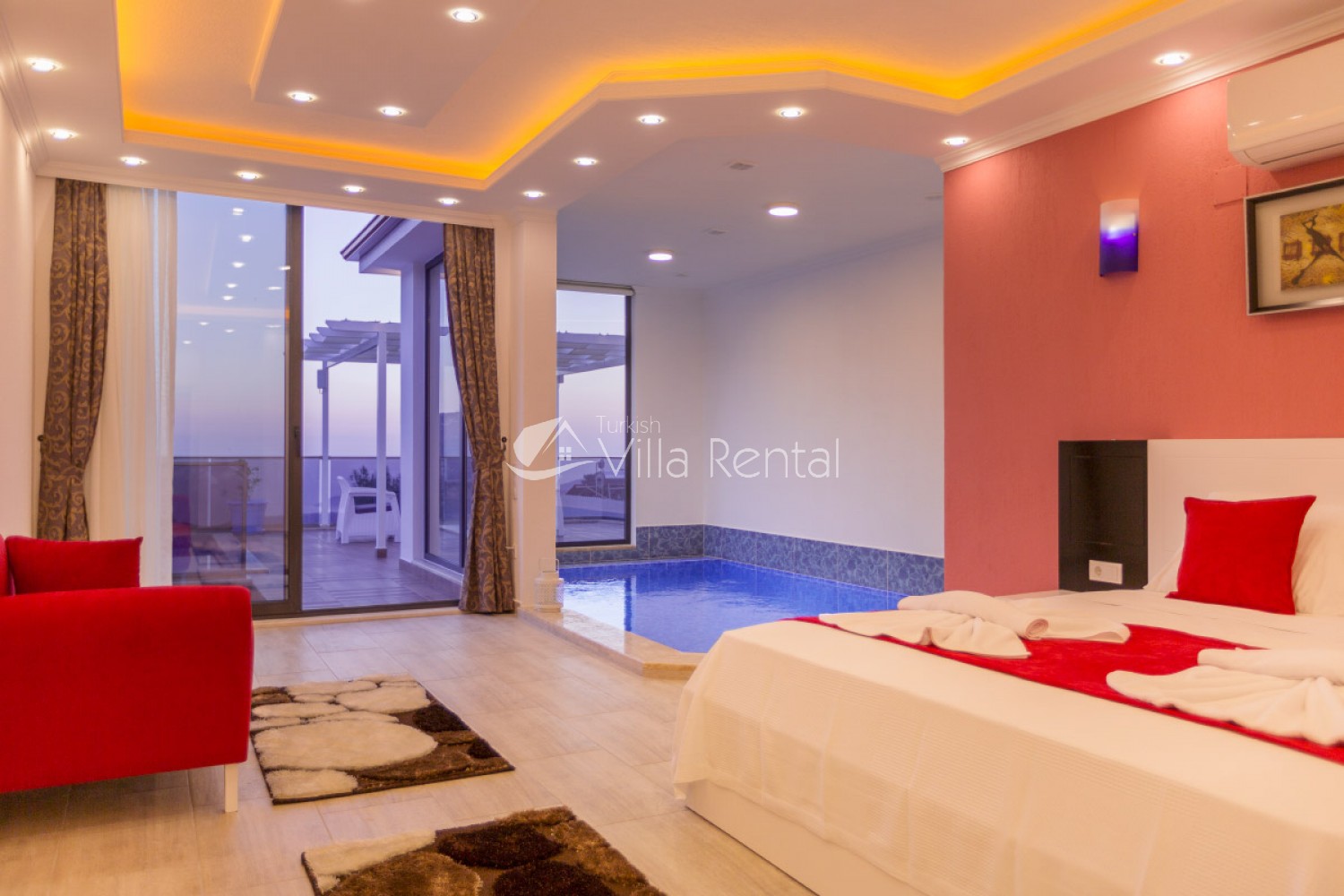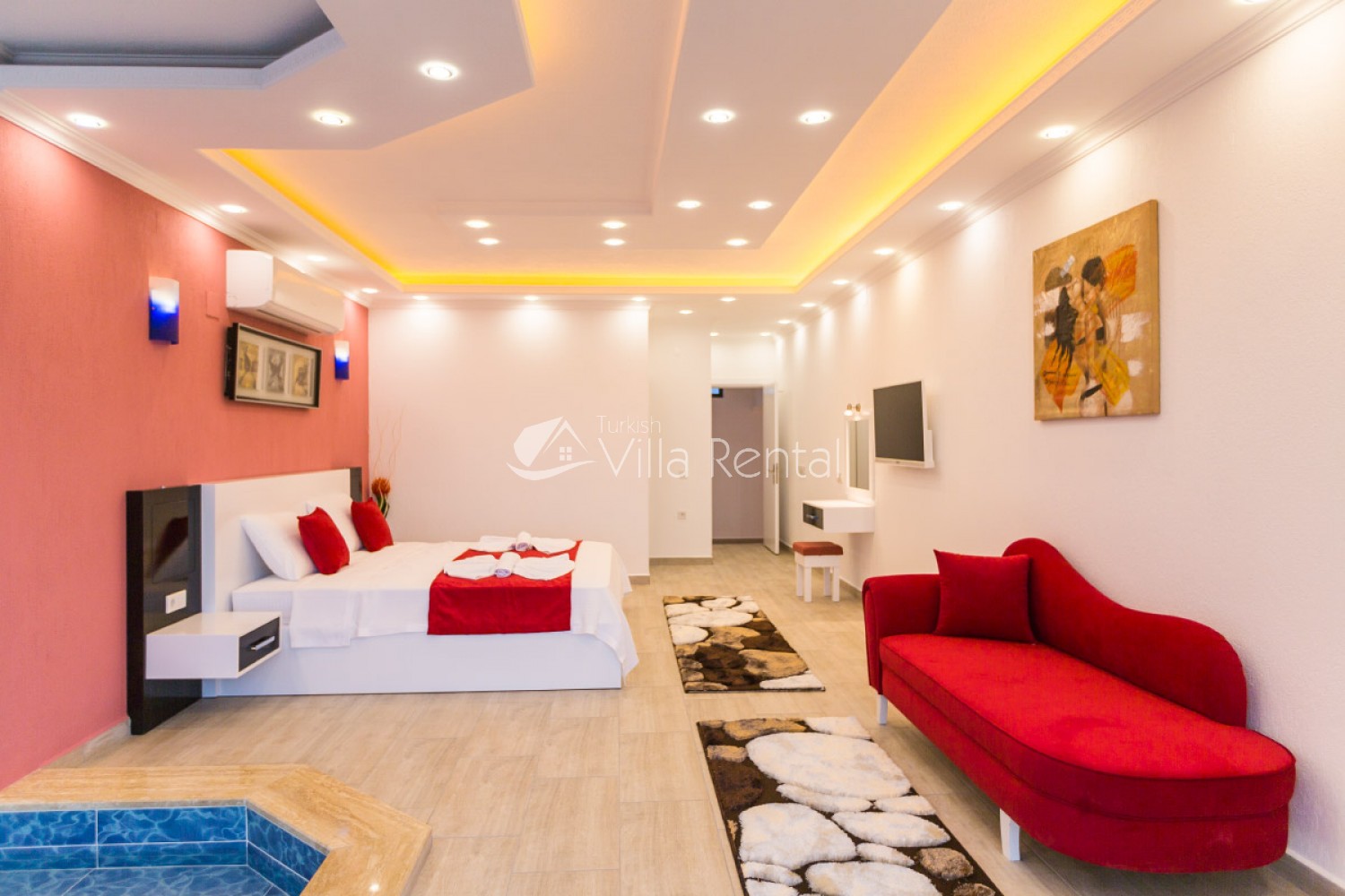 1. Bedroom: Master suite bedroom; The air-conditioned bedroom has 1 double 3x5 meter heated pool, dresser, vanity table, LCD TV, wardrobe and bathroom and toilet. The pool terrace has exit.