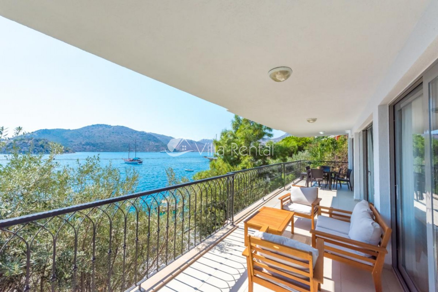 Terrace: Inside the terrace with spacious sea view, Villa Boraes has a dining table and seating group.