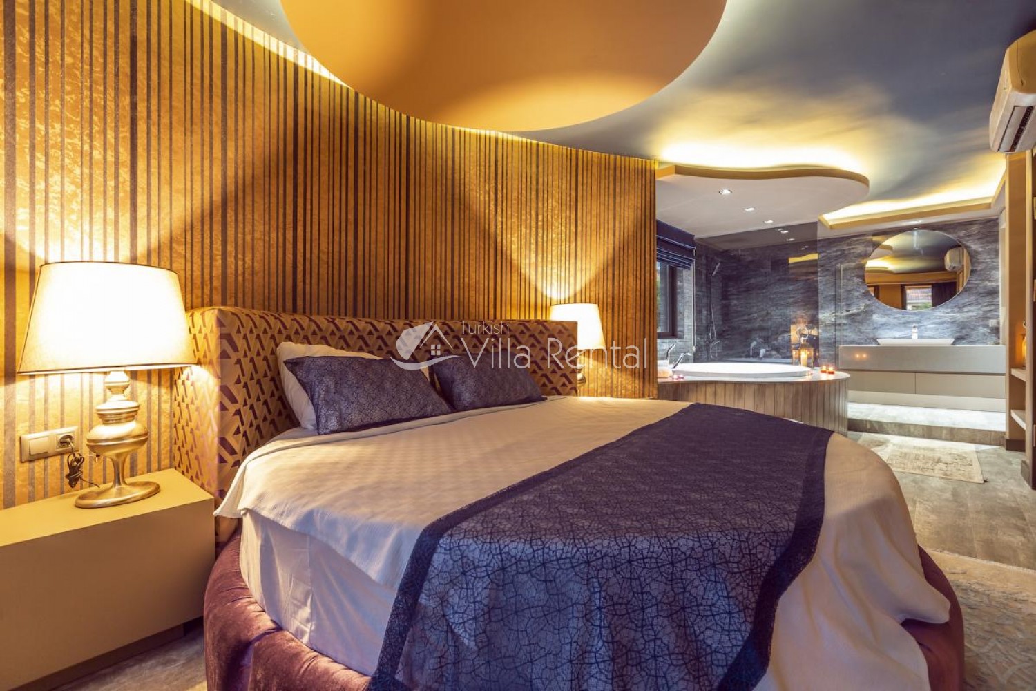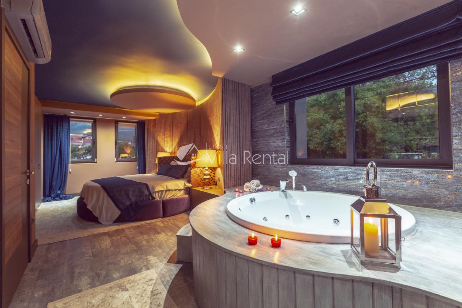 Bedroom 1: Master bedroom, round double bed, LCD TV, dressing table, wardrobe with safe, Jacuzzi and en-suite.