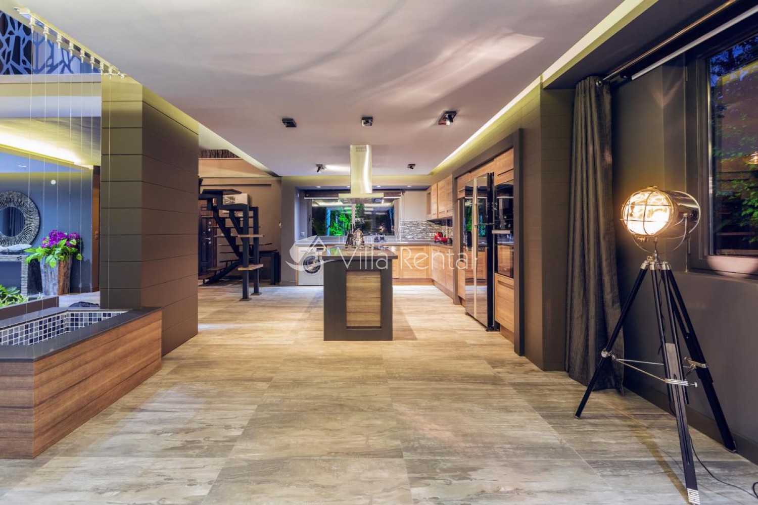 Living Room: Spacious open-plan living area, with stylish sofa, LCD TV and satellite, water feature, dining area with high chair, kitchen area and WC. Access to pool area.