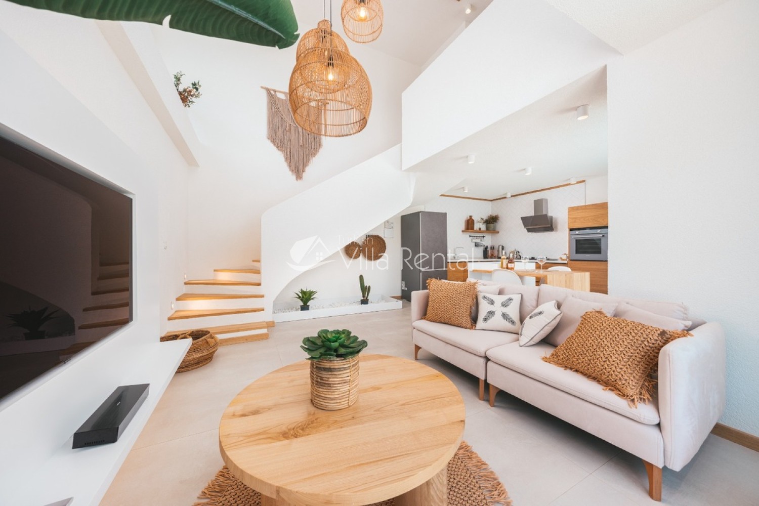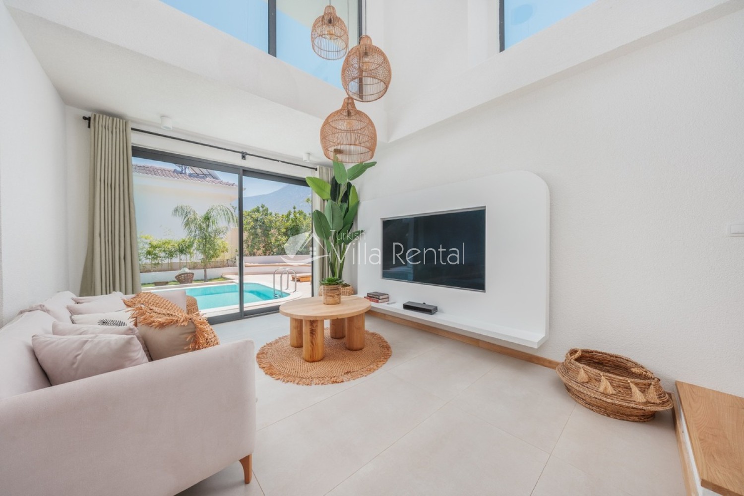 Comfortable seating area, TV, pool view and access to garden and pool area.