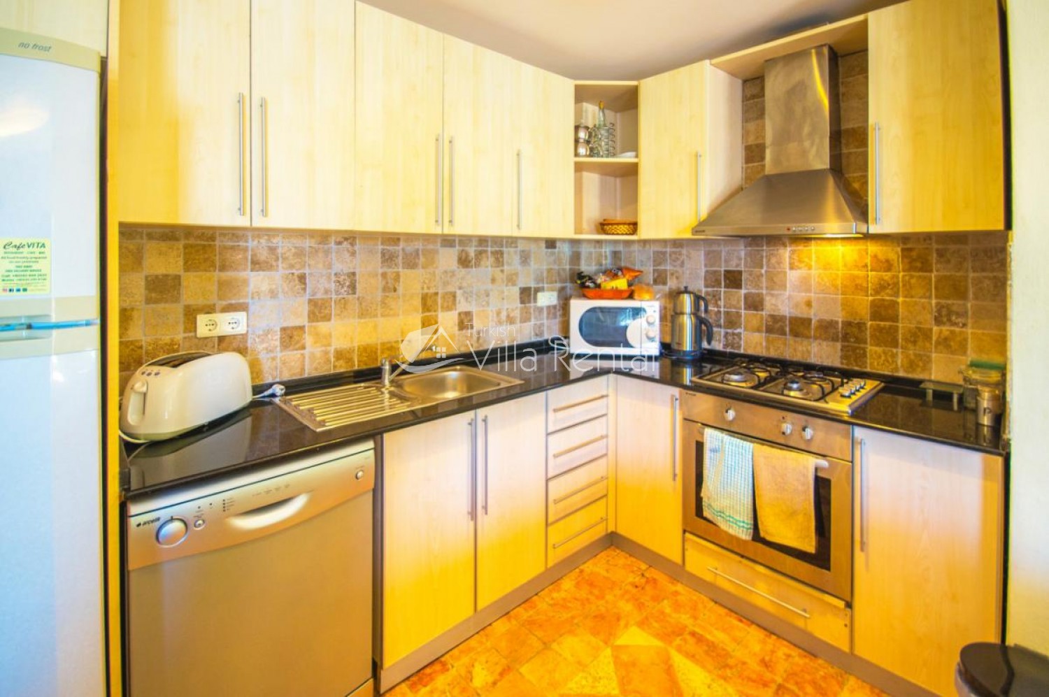 Kitchen: Open plan and fully equipped with fridge, dishwasher, built-in oven, oven, microwave, pans and cookware, kettle.