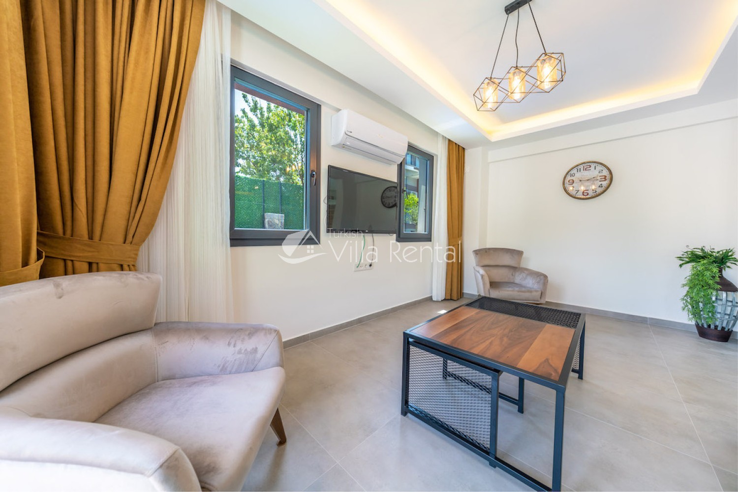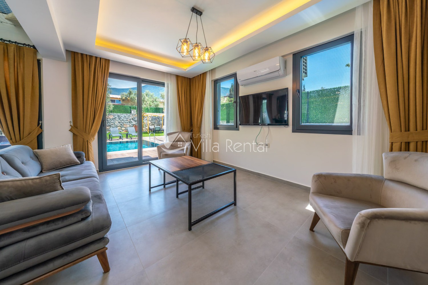 Living Room: Stylish sitting group, TV, air conditioner and direct exit to the pool terrace.
