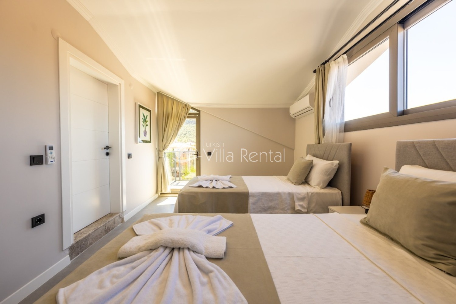 3. Bedroom: There are 2 single beds, air conditioning, nightstand, wardrobe, bathroom & WC and exit to the balcony.
