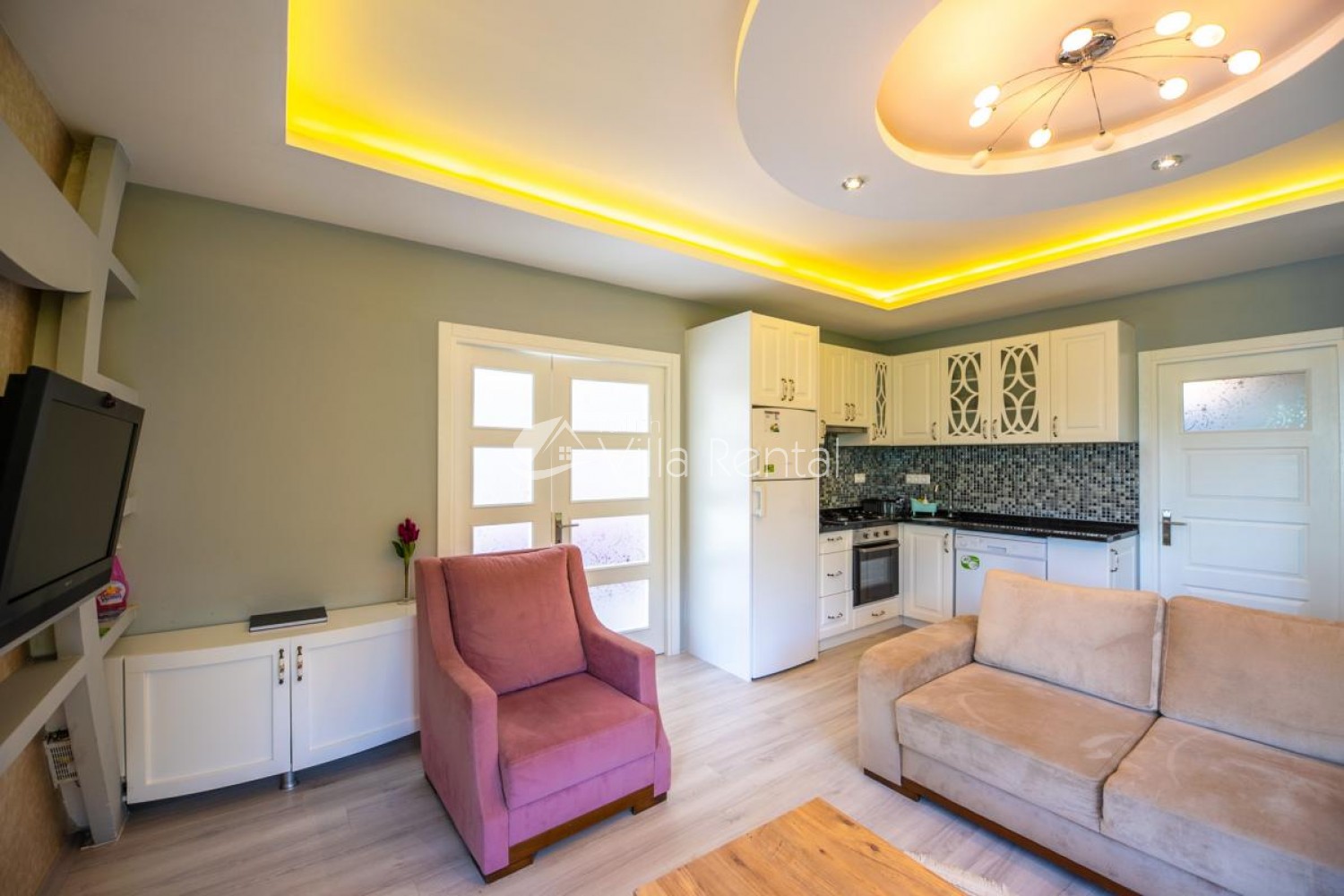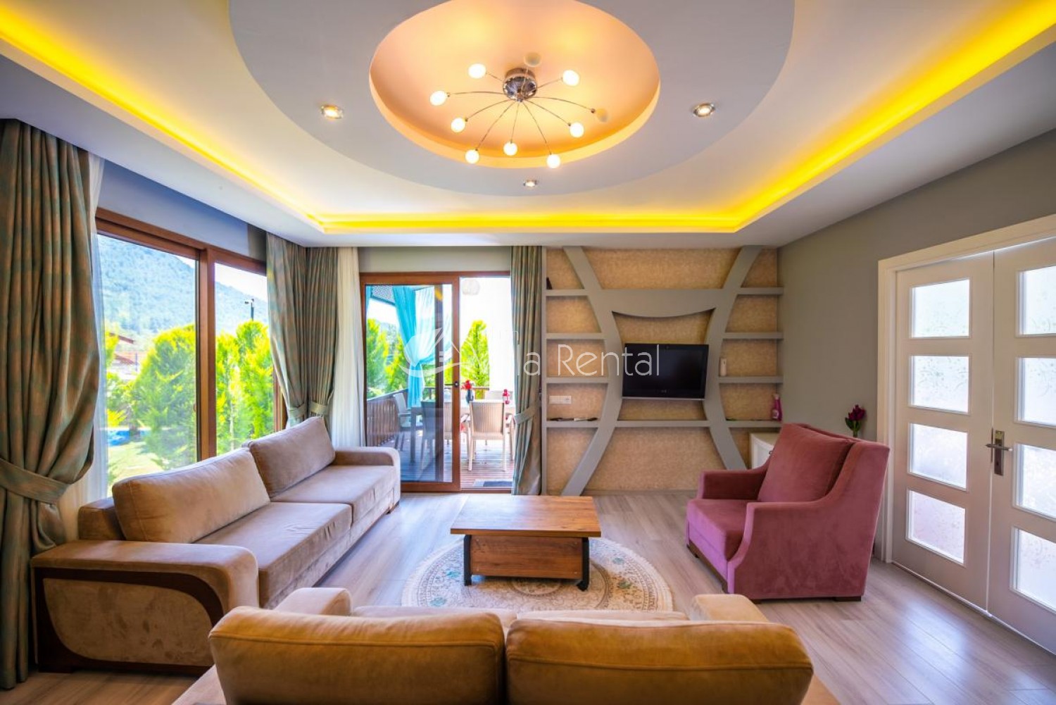 Salon Villa Çam has a living room with nature view on the ground floor. The lounge has a TV, satellite receiver, modern sofa set, air conditioning, bath / toilet and exit to the pool terrace.