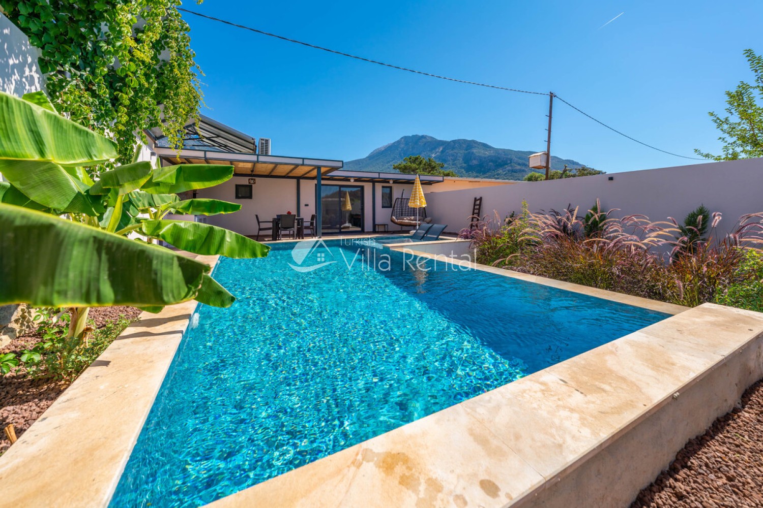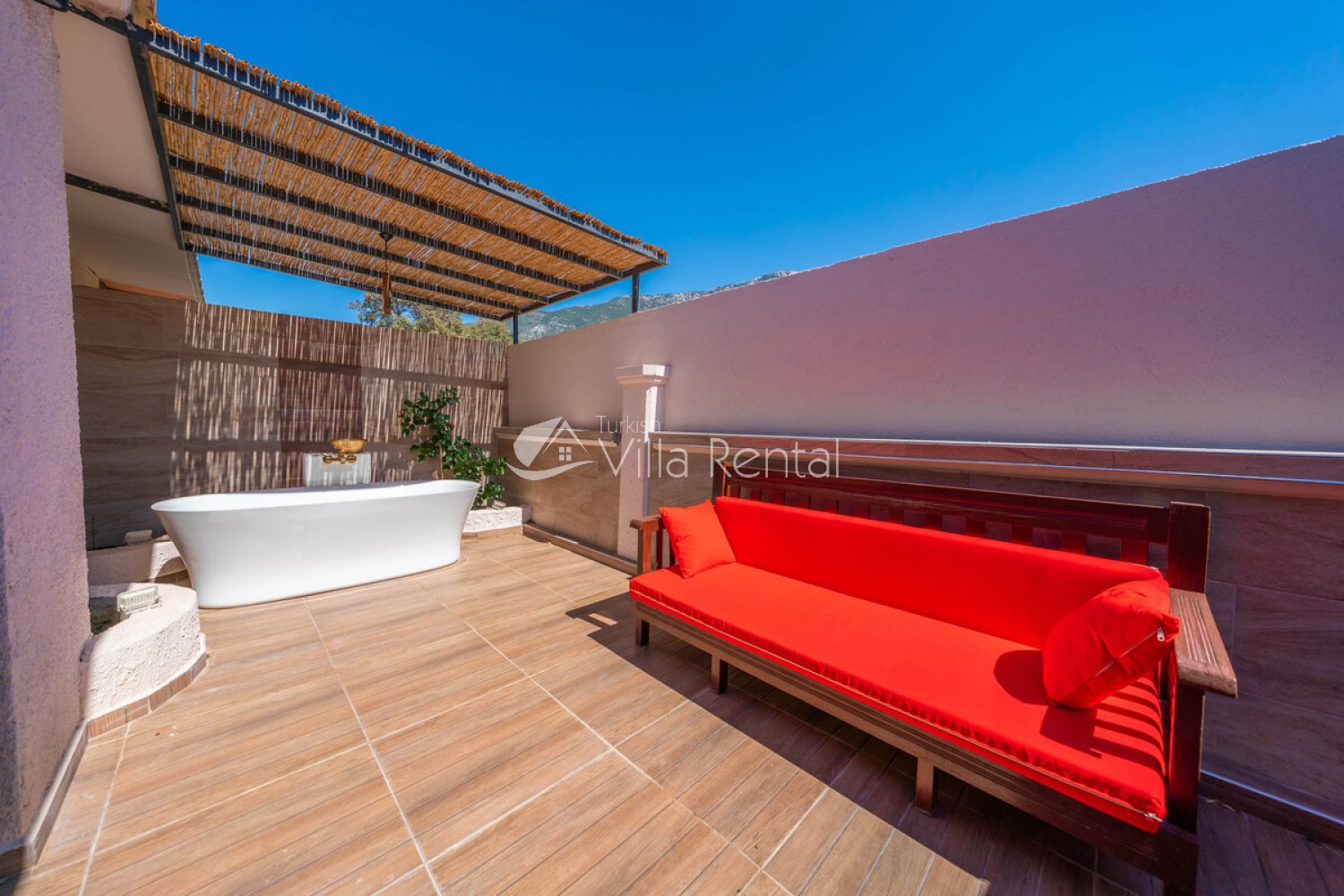 Villa Safir, which has an attentive and stylish concept for honeymooners in Fethiye Hisarönü region, is designed for you to have a peaceful and comfortable holiday with its studio style living area and sheltered pool feature. It is a great alternative for honeymooners with its bathtub on the terrace and a special accommodation capacity for 2 people.