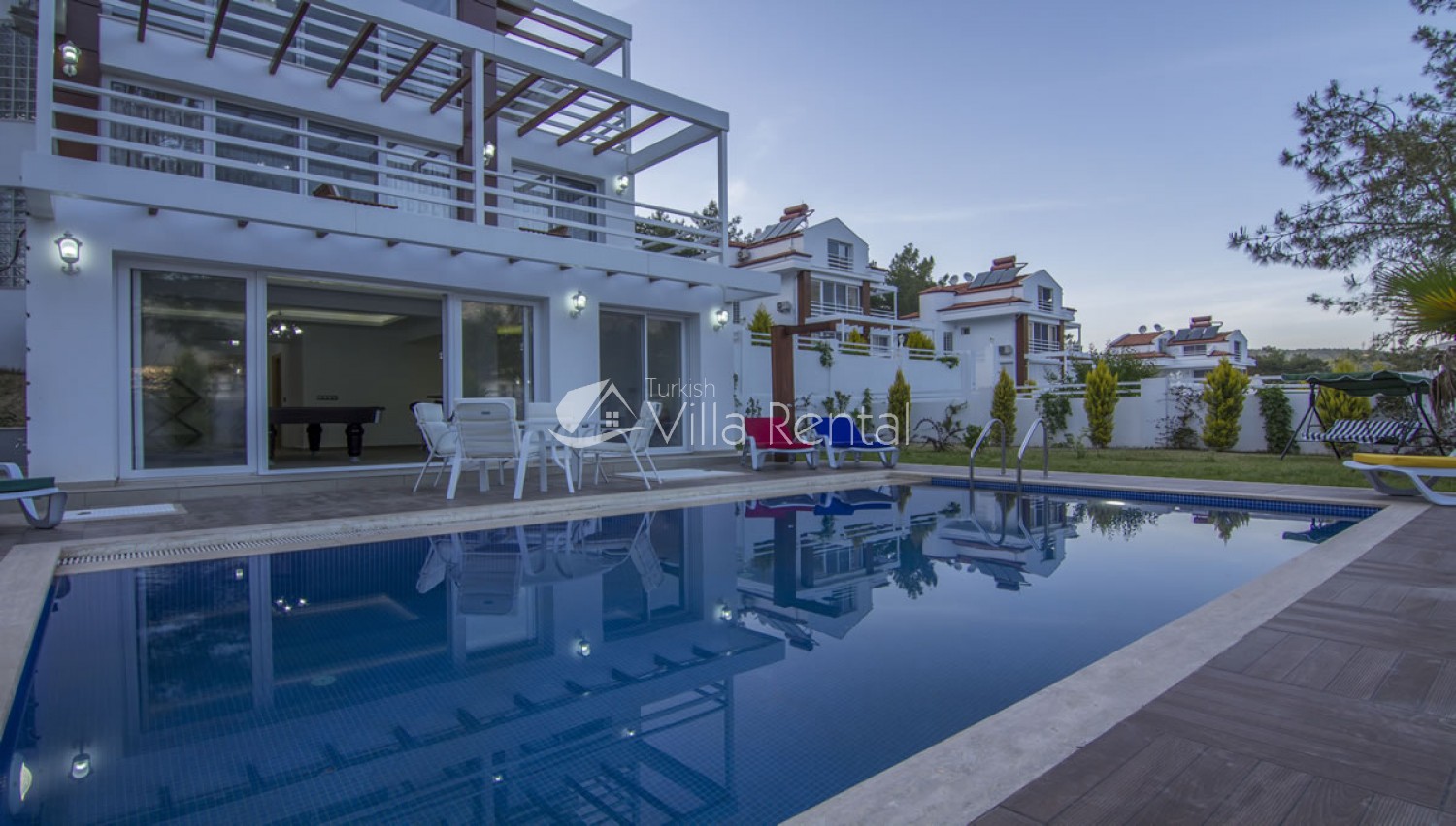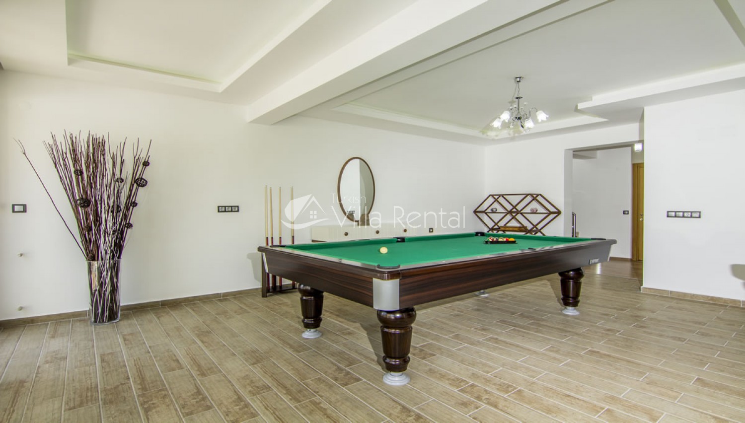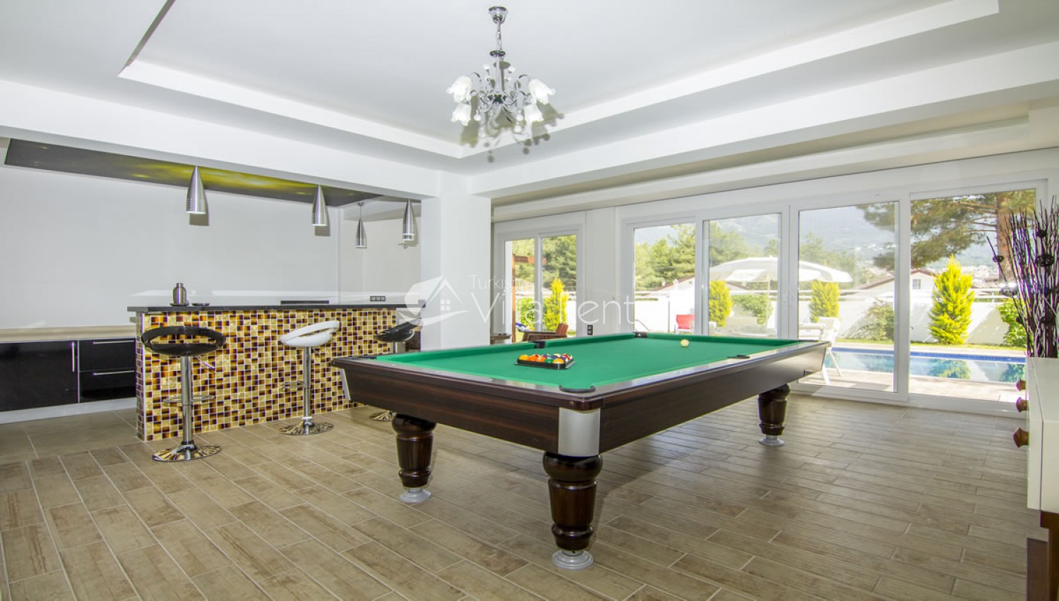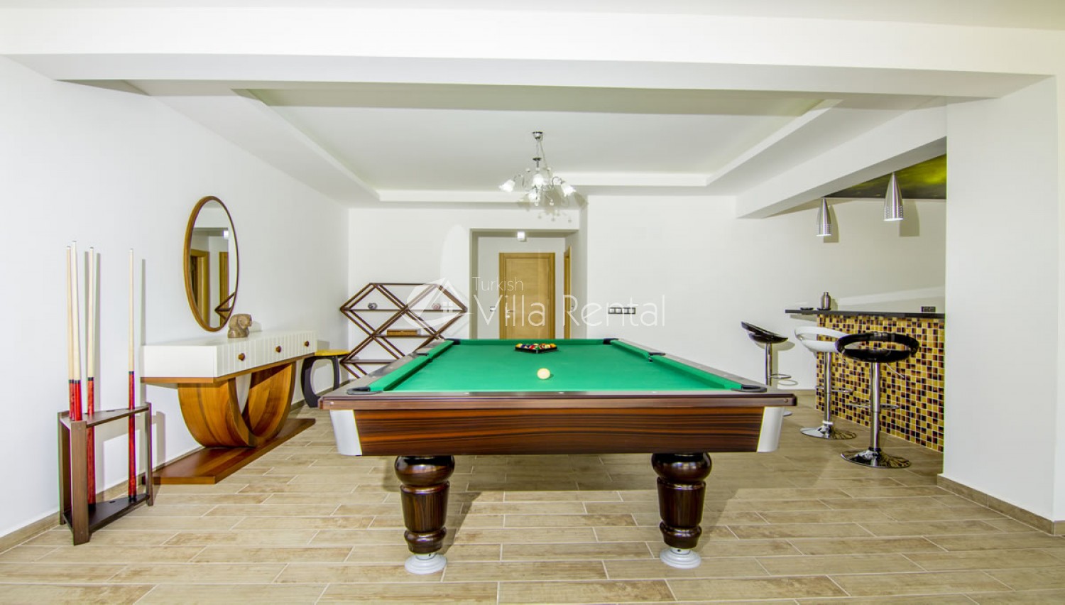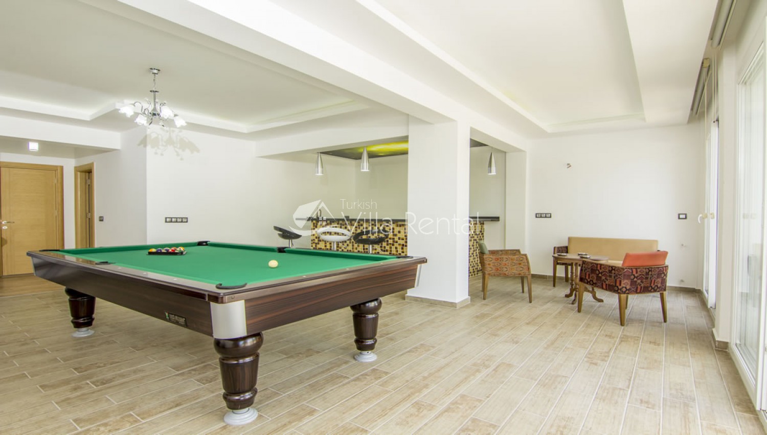Salon There are 2 halls in Villa Tala 1. In the main hall; air conditioning, comfortable and comfortable seating group, dining table and chairs for 6 people, LCD TV, sink. There is an exit from the lounge to the pool side. In the lower hall; Features a pool table, minibar and shared bathroom.