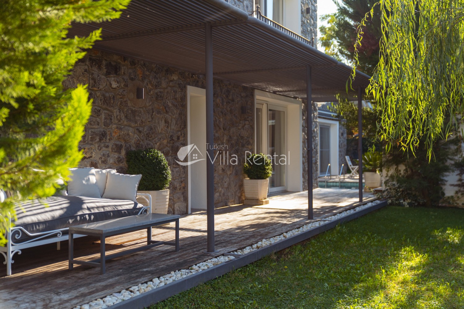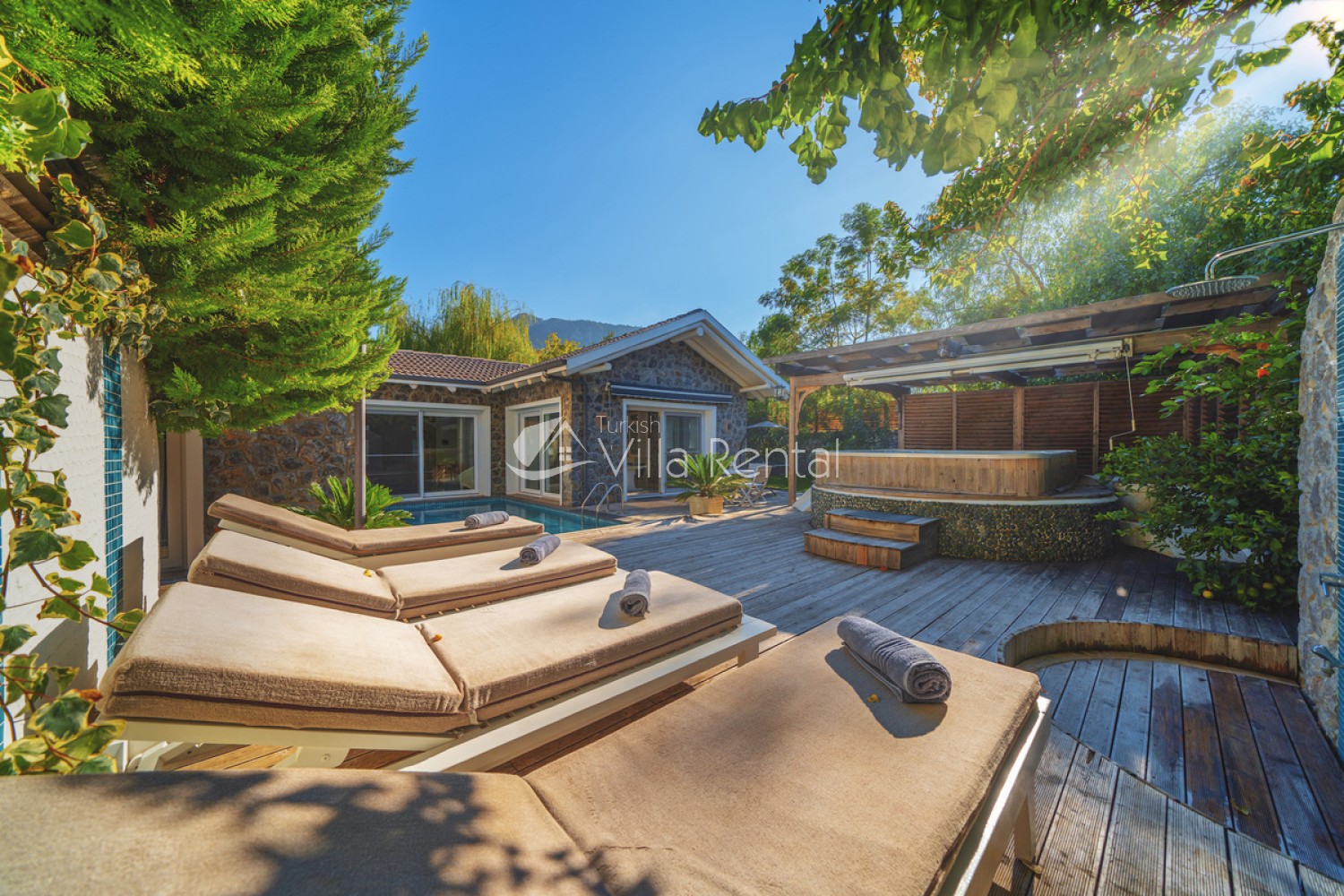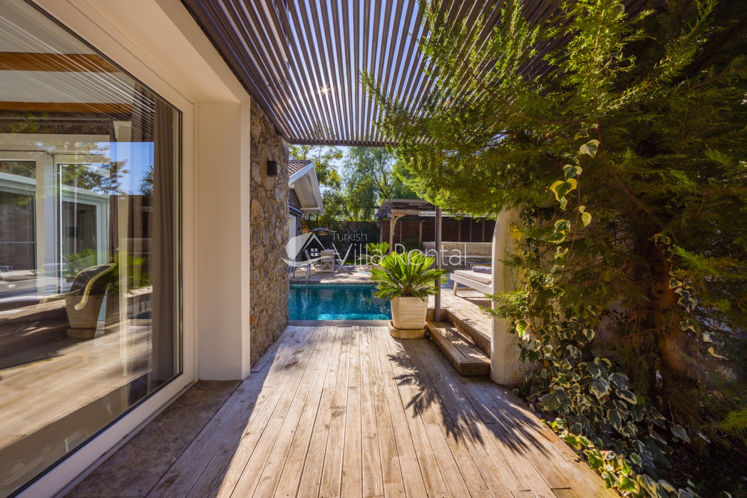 The villa has a private garden and private swimming pool that is partially secluded, which means it cannot be seen easily from outside.