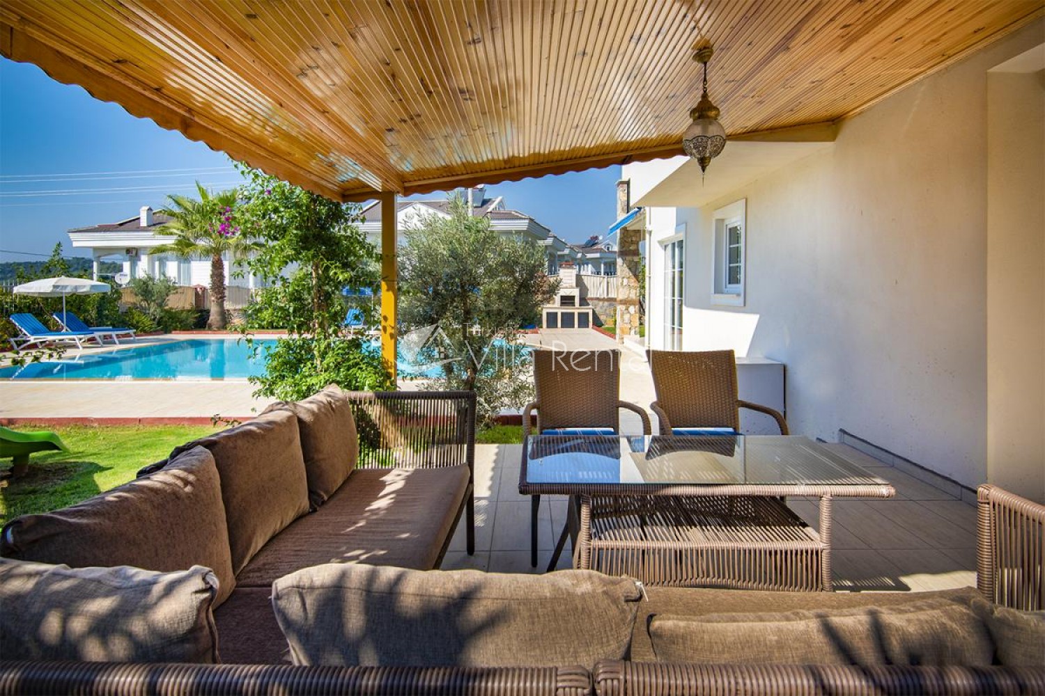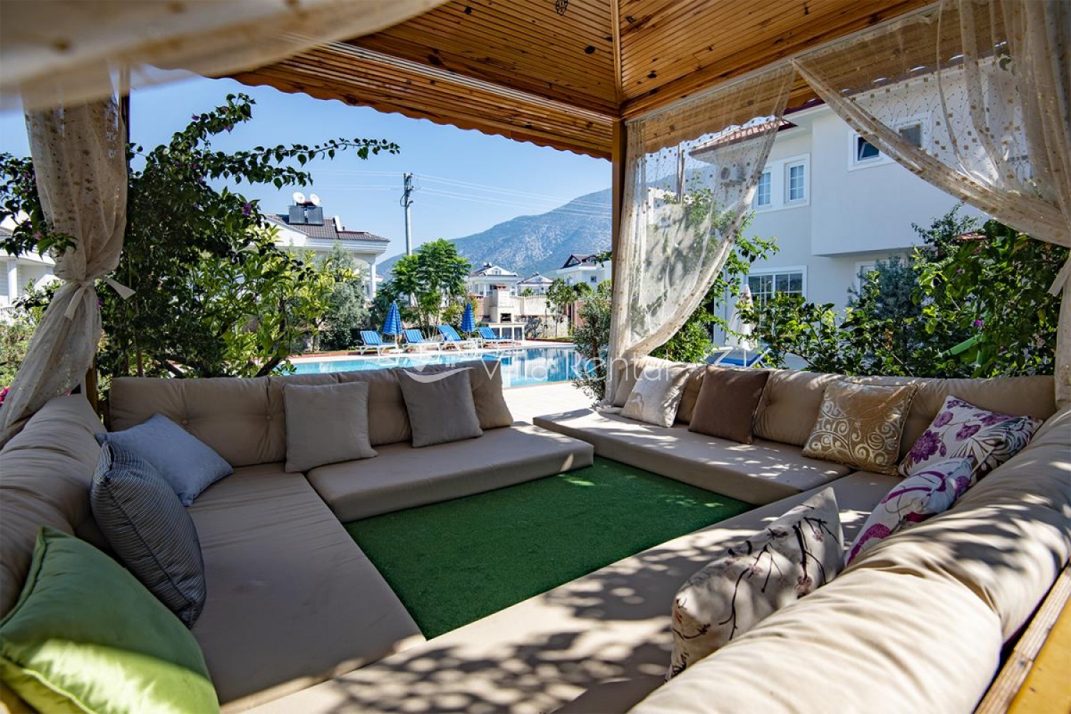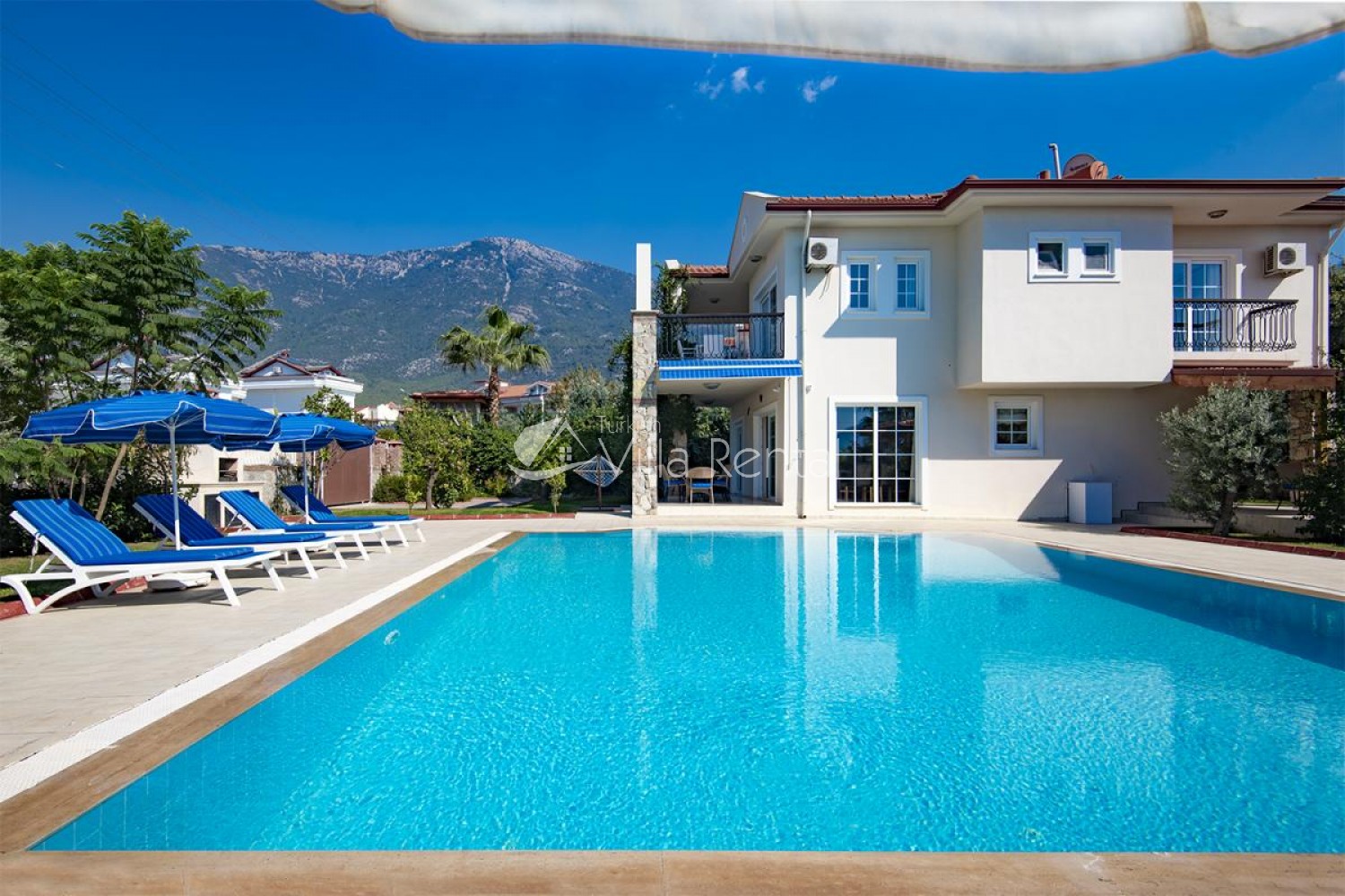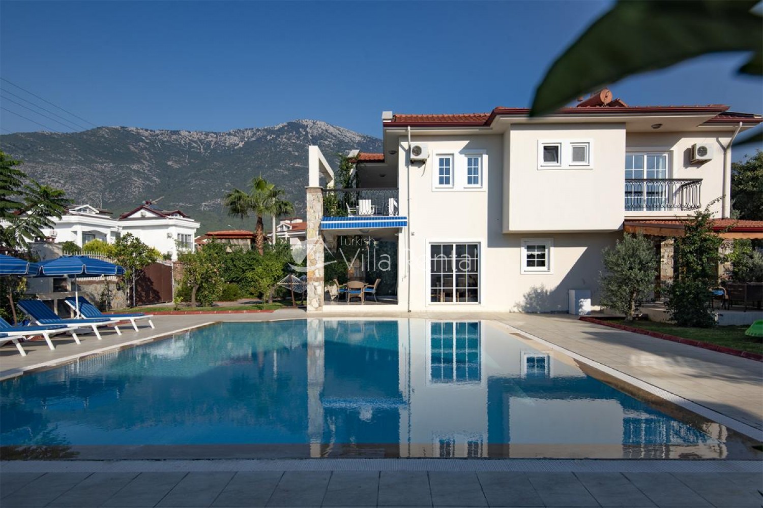 Villa Unver 2 is a beautiful villa for rent with its 700 sq.m large garden and the standard swimming pool of 65 sqm, located in Hisaronu close to the famous Oludeniz. Just a 5 minute drive from Ölüdeniz and a 1 minute drive from the centre of Hisaronu. Even though the villa is close to the center, it is in a very calm and peaceful area. For those guests who have a larger group but would like to keep their own space, we have Unver 1 just next door.