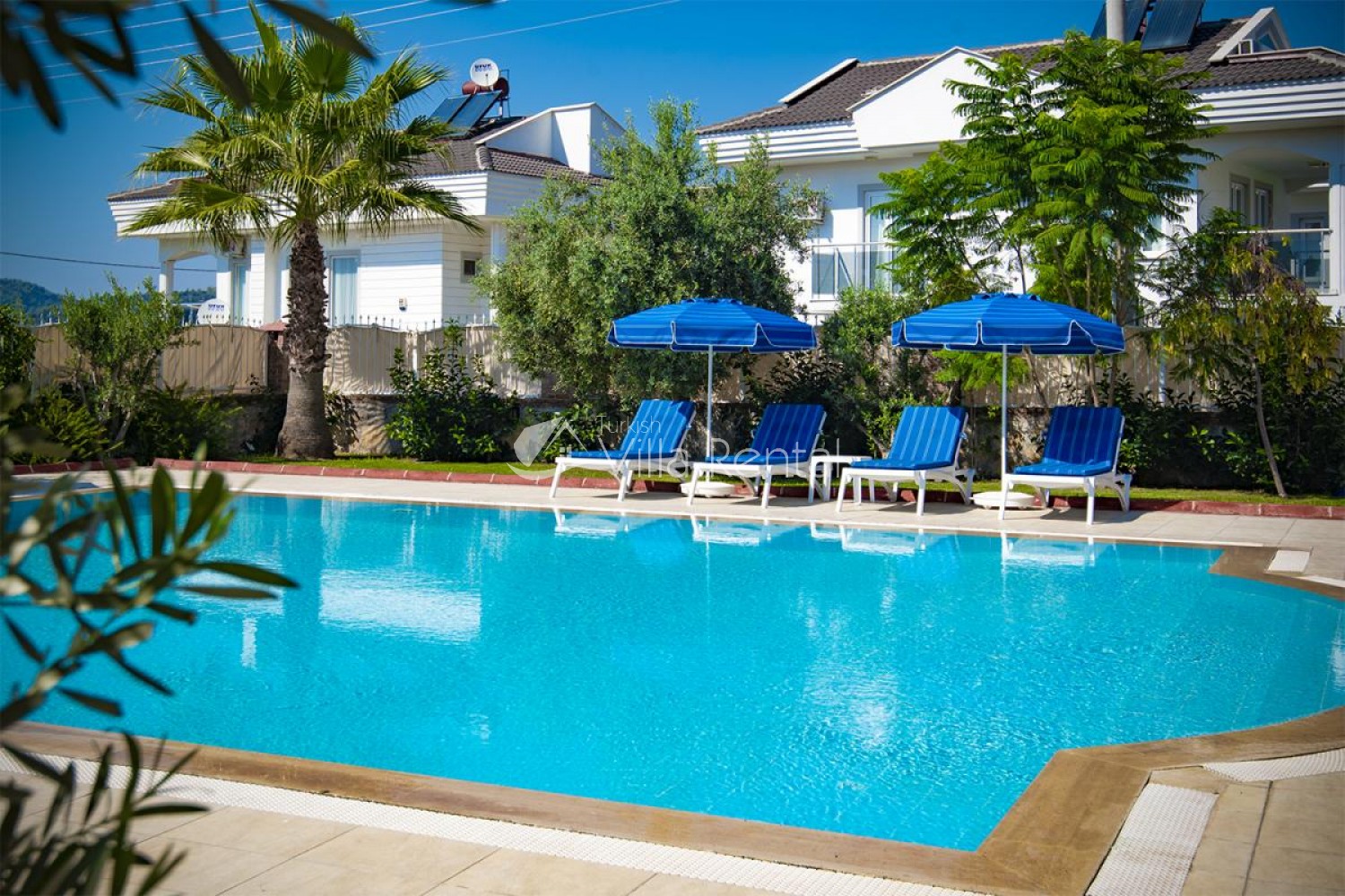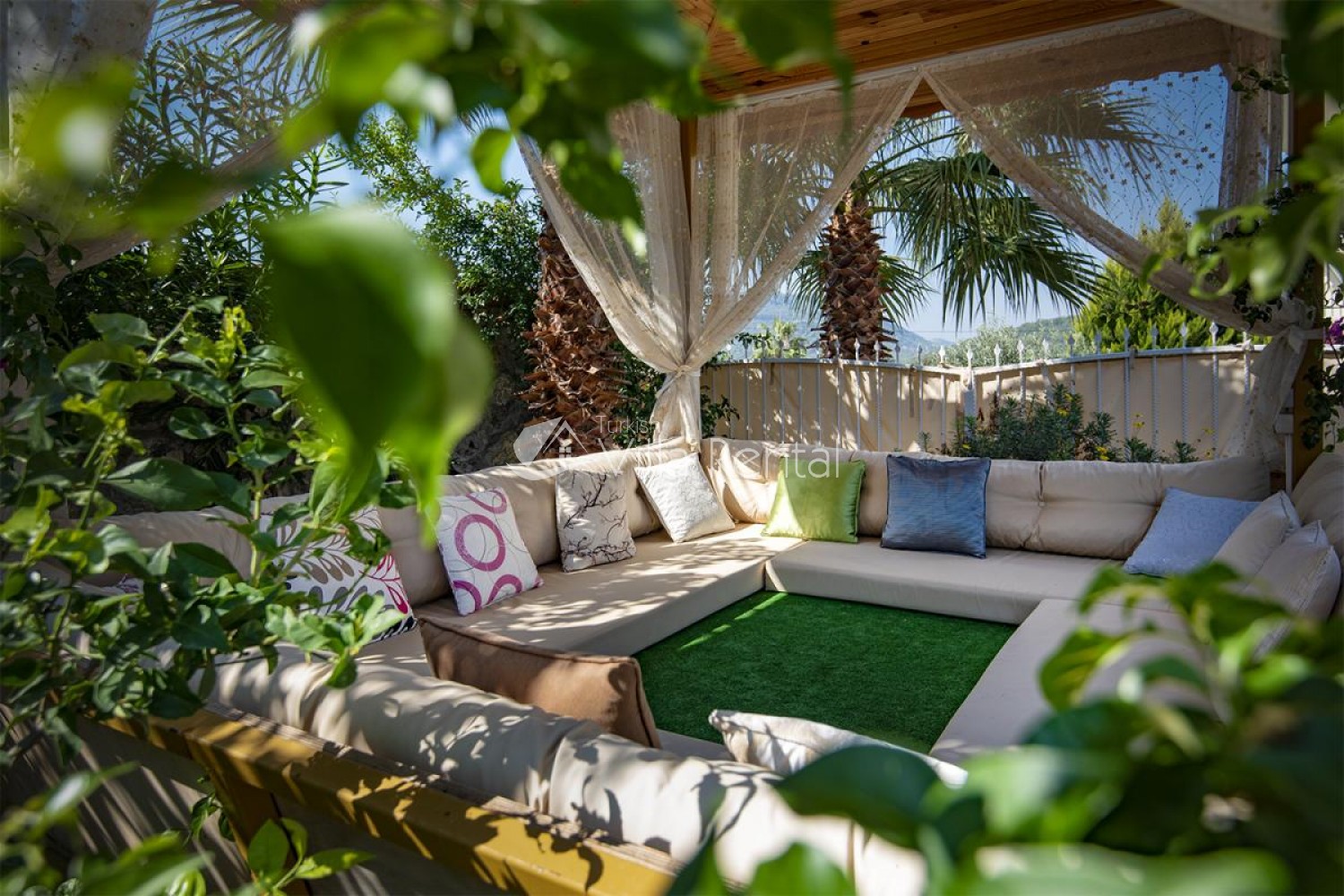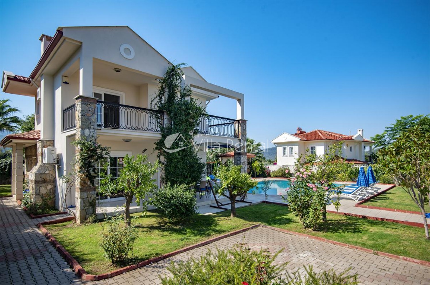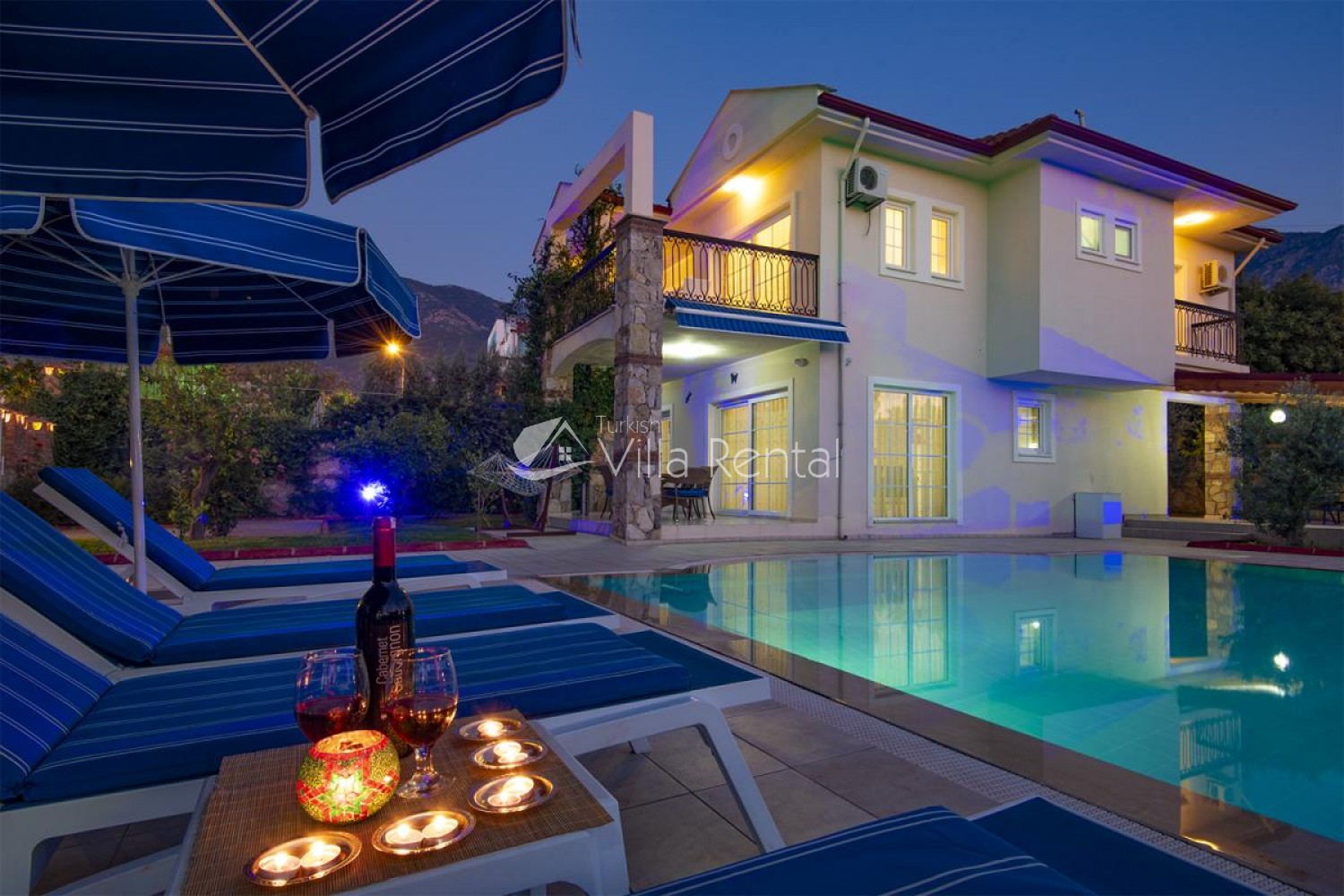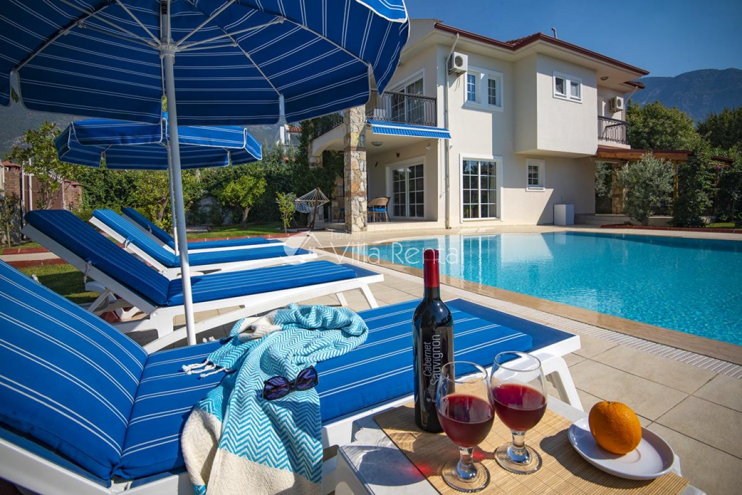 Villa Unver 2 is a beautiful villa for rent with its 700 sq.m large garden and the standard swimming pool of 65 sqm, located in Hisaronu close to the famous Oludeniz. Just a 5 minute drive from Ölüdeniz and a 1 minute drive from the centre of Hisaronu. Even though the villa is close to the center, it is in a very calm and peaceful area. For those guests who have a larger group but would like to keep their own space, we have Unver 1 just next door.