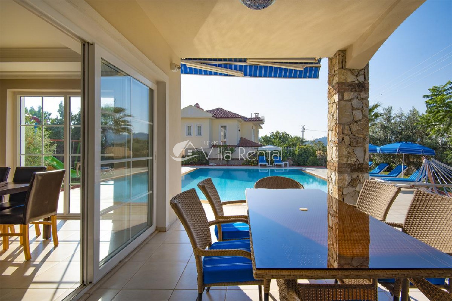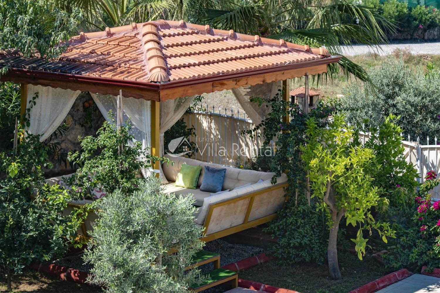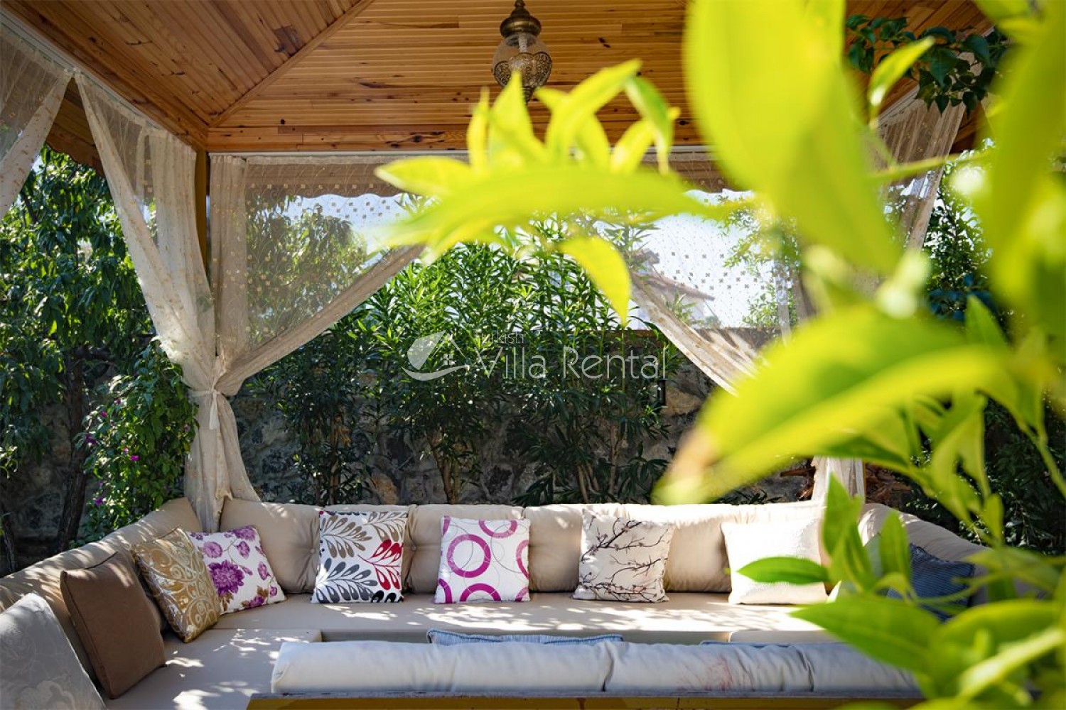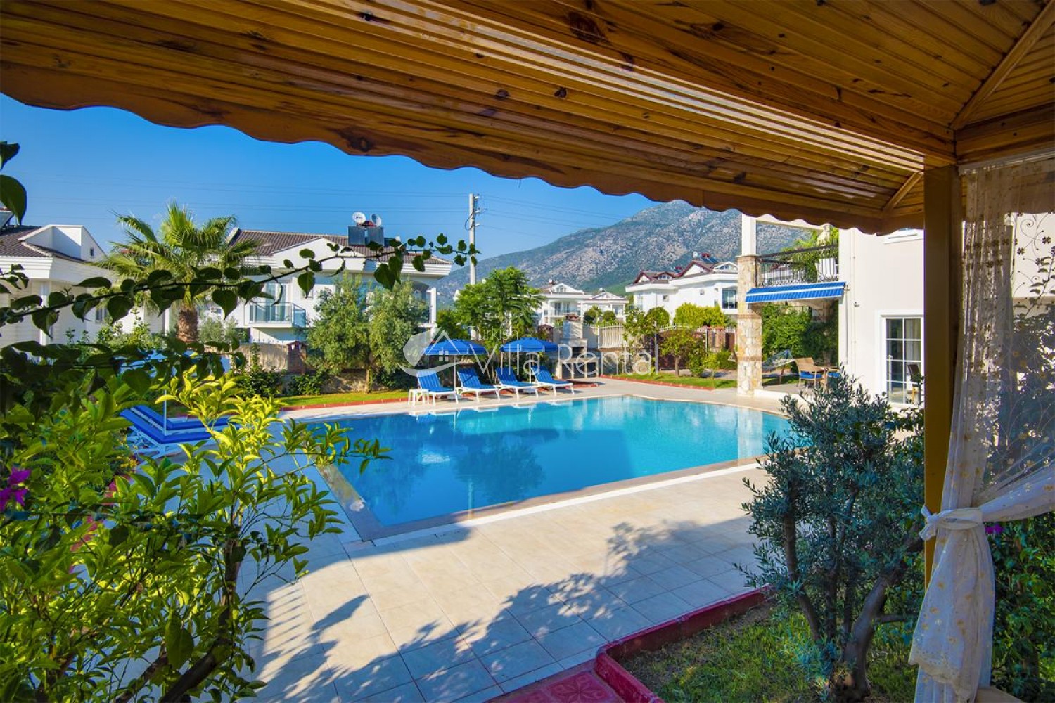Villa Unver 2 is a beautiful villa for rent with its 700 sq.m large garden and the standard swimming pool of 65 sqm, located in Hisaronu close to the famous Oludeniz. Just a 5 minute drive from Ölüdeniz and a 1 minute drive from the centre of Hisaronu. Even though the villa is close to the center, it is in a very calm and peaceful area. For those guests who have a larger group but would like to keep their own space, we have Unver 1 just next door.