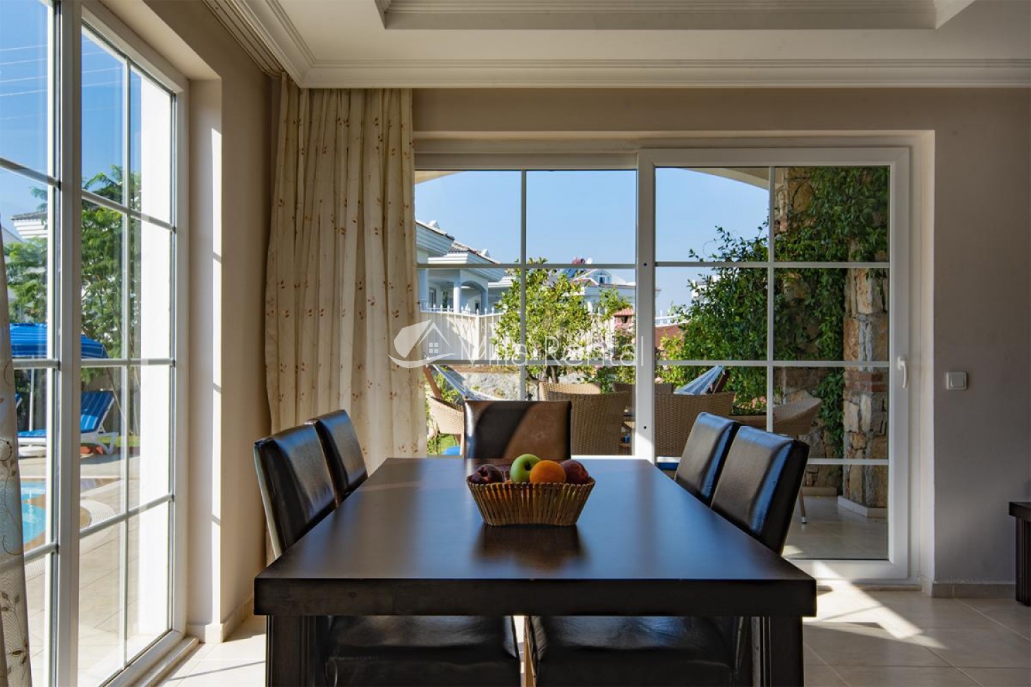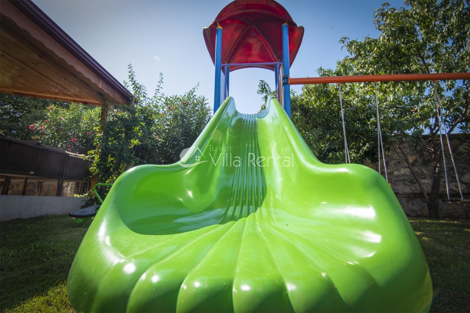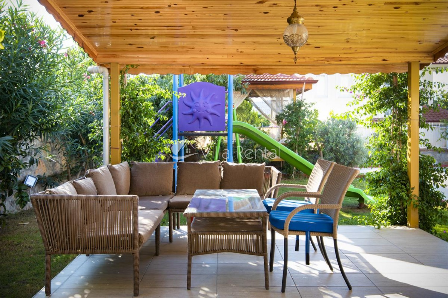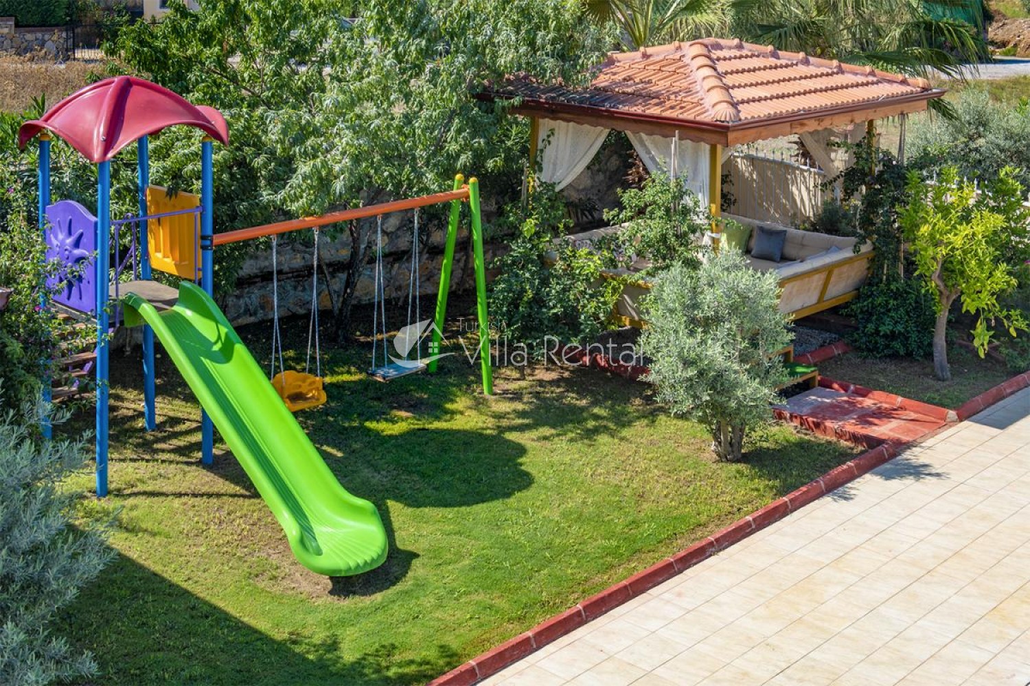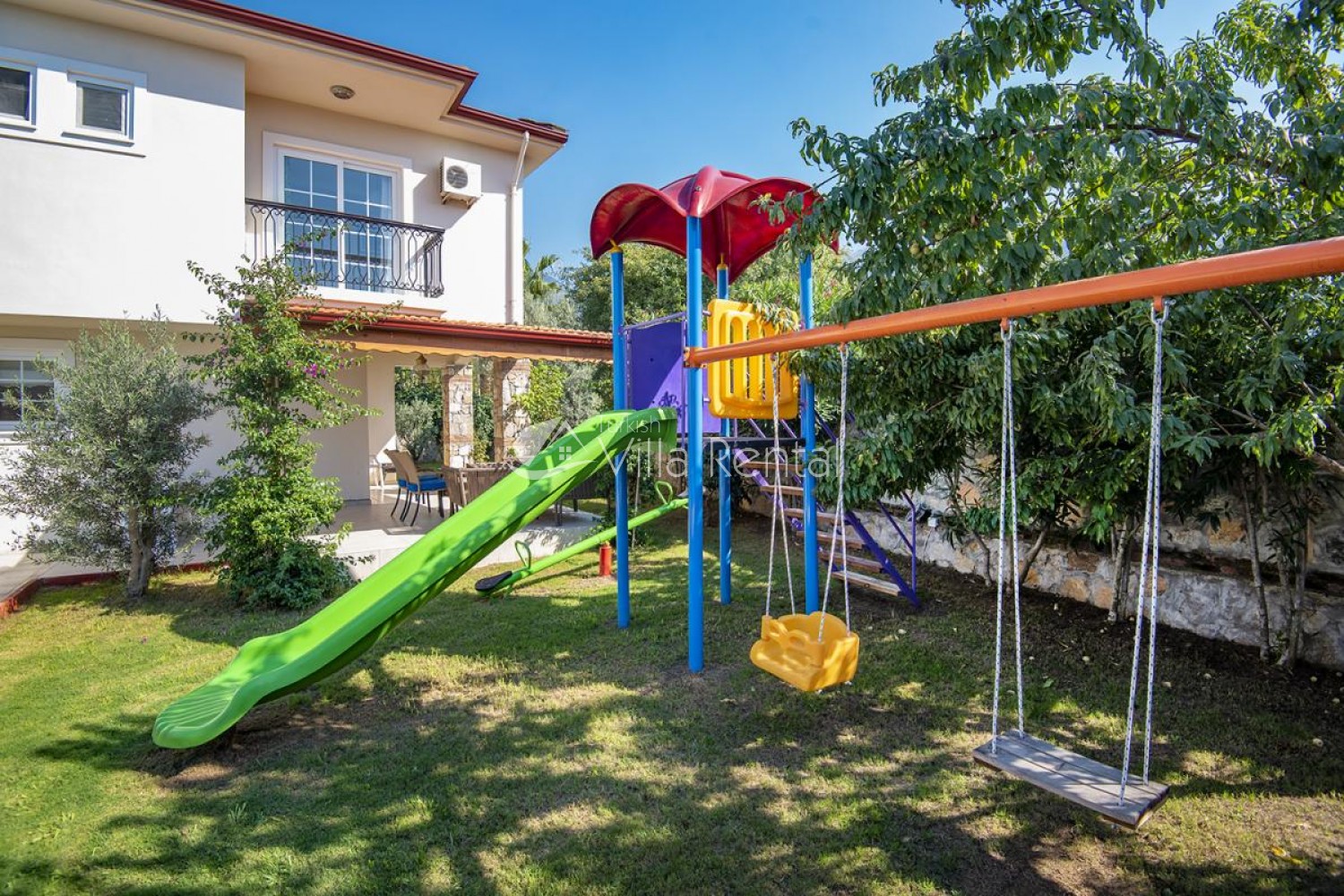 Villa Unver 2 is a beautiful villa for rent with its 700 sq.m large garden and the standard swimming pool of 65 sqm, located in Hisaronu close to the famous Oludeniz. Just a 5 minute drive from Ölüdeniz and a 1 minute drive from the centre of Hisaronu. Even though the villa is close to the center, it is in a very calm and peaceful area. For those guests who have a larger group but would like to keep their own space, we have Unver 1 just next door.