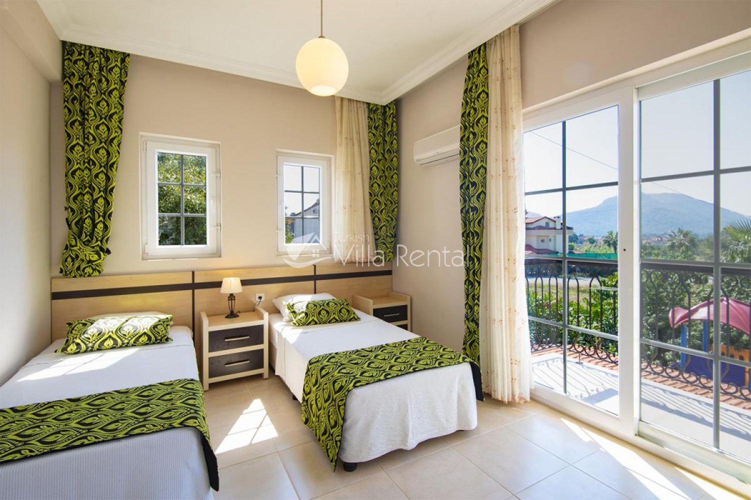 Bedroom 3: en-suite twin bedroom with 2 single beds, air conditioner, dresser, balcony, toilet and bathroom.