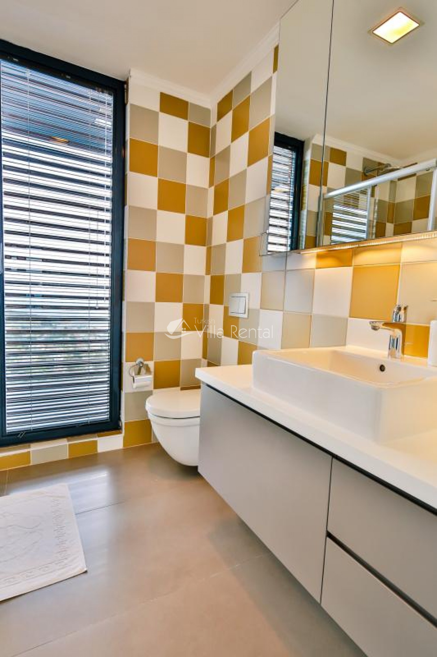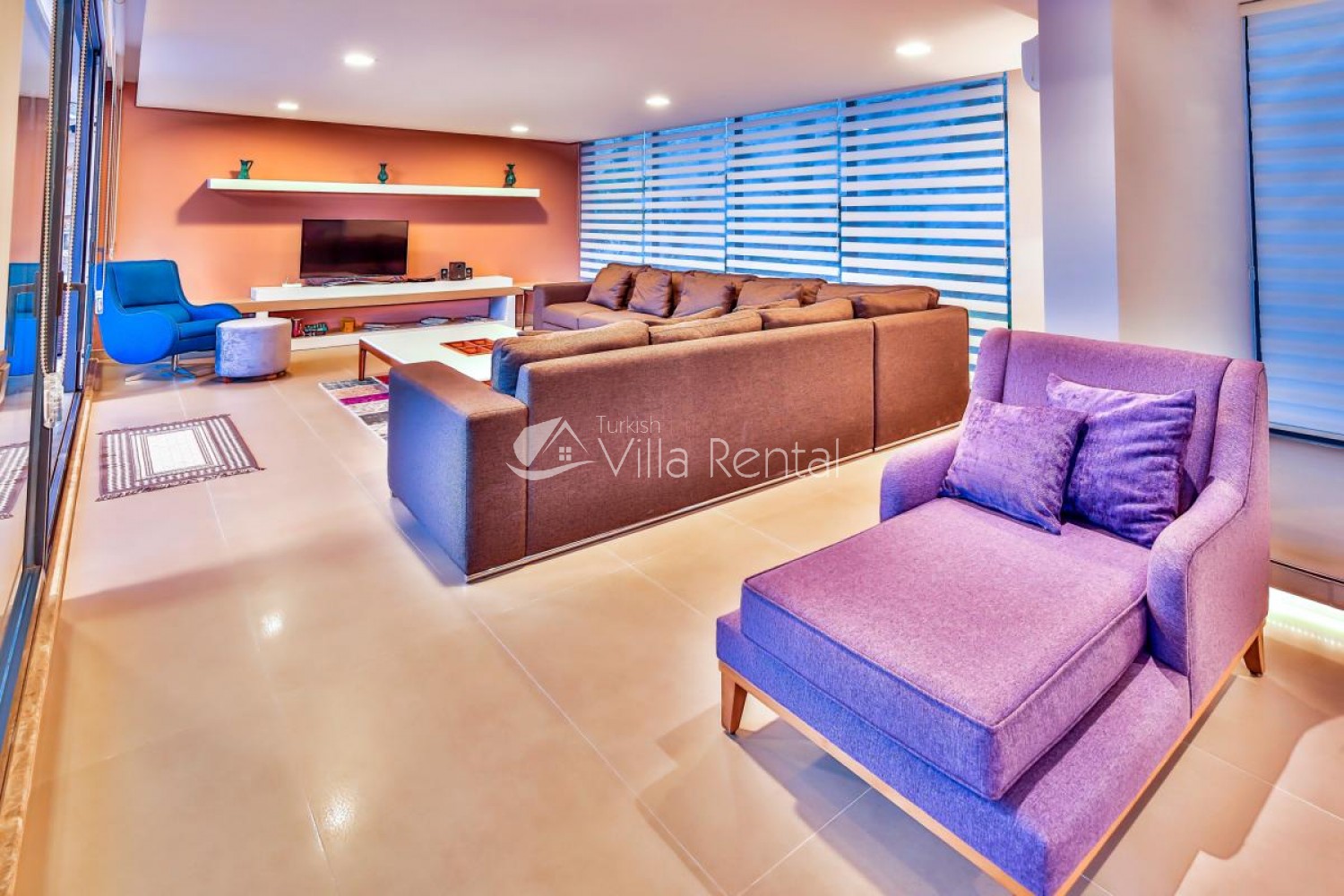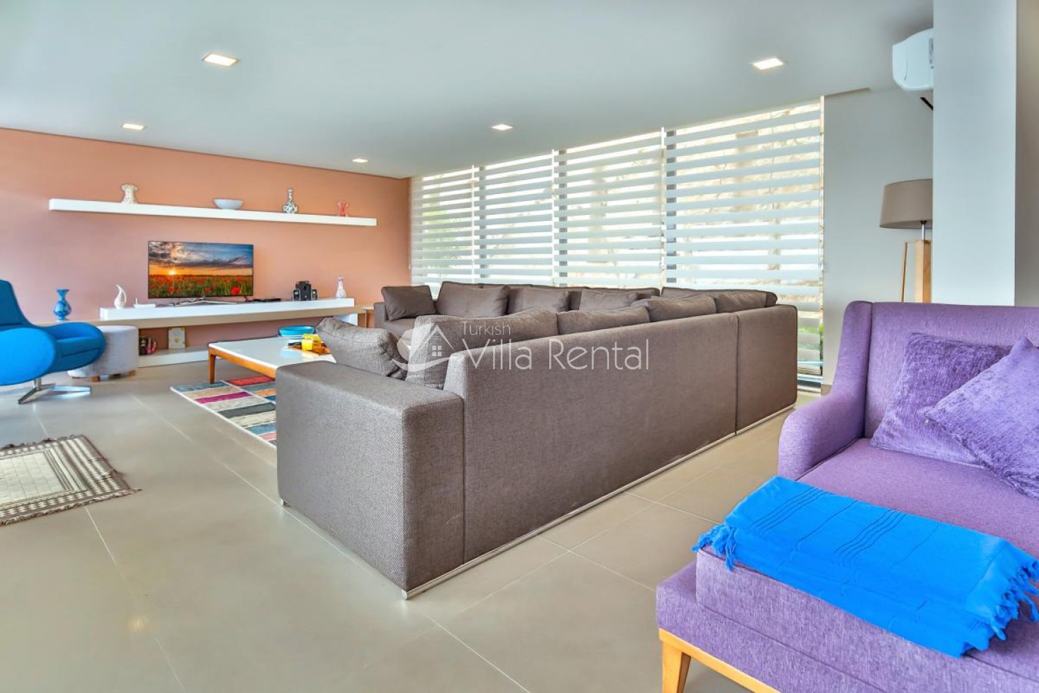 Living Room: There is air conditioner, satellite receiver, TV, DVD player, sitting group, iron and ironing board, sink in the living room and there is an exit to the pool side. The hall is on the pool floor. On the top floor, there is another very large viewing terrace for relaxing and sunbathing. This area also has a sitting group, table and chair.