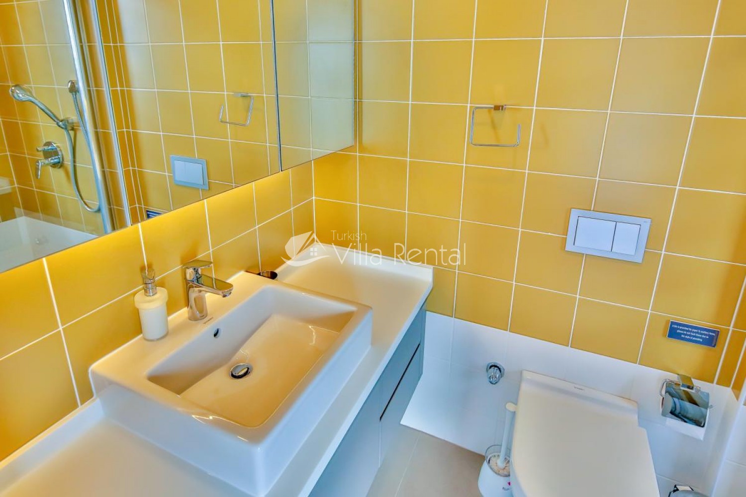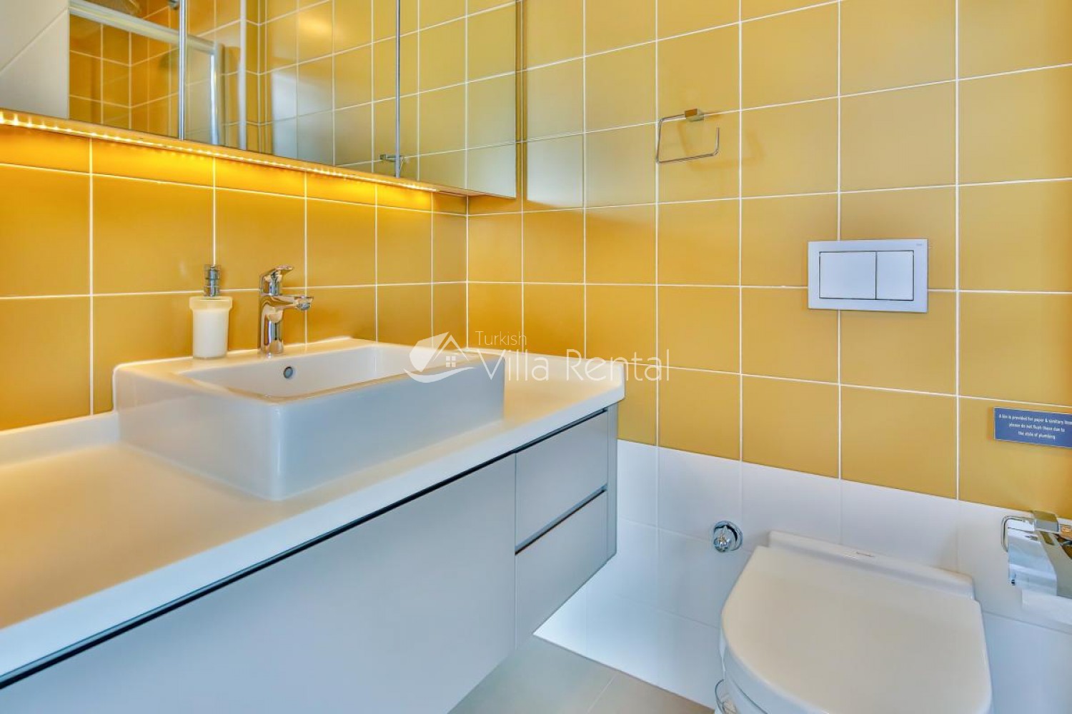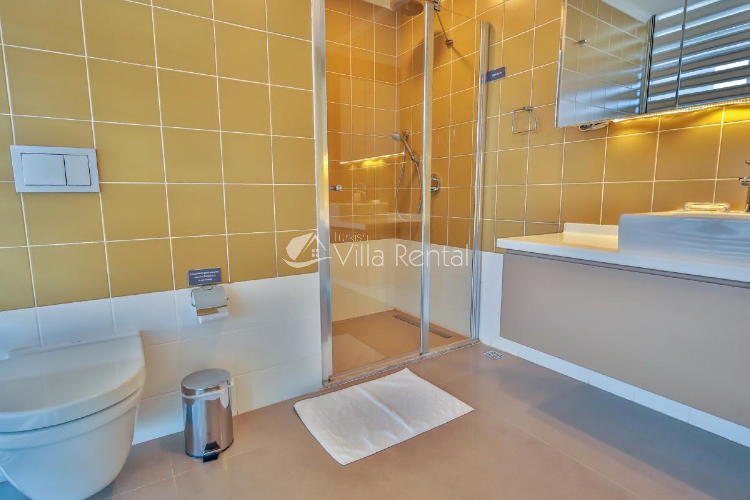 Living Room: There is air conditioner, satellite receiver, TV, DVD player, sitting group, iron and ironing board, sink in the living room and there is an exit to the pool side. The hall is on the pool floor. On the top floor, there is another very large viewing terrace for relaxing and sunbathing. This area also has a sitting group, table and chair.