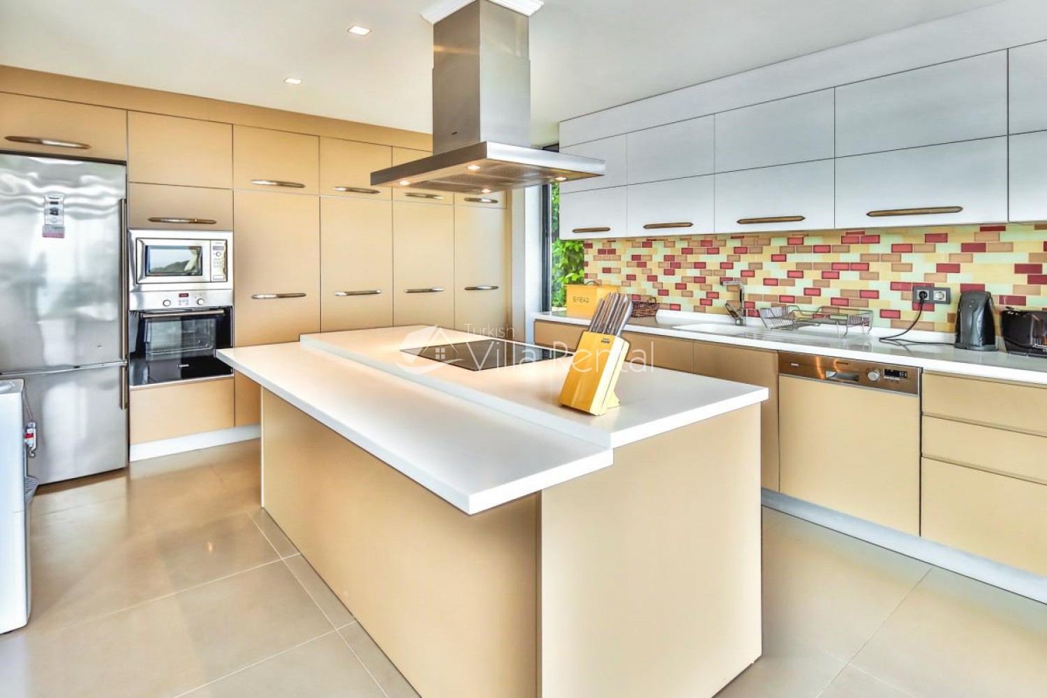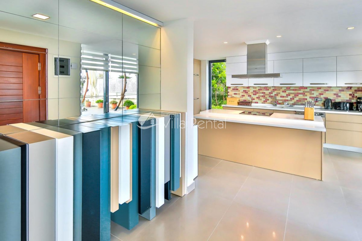 Kitchen: American kitchen. In the kitchen, there are microwave oven, dishwasher, built-in oven, refrigerator, washing machine, built-in 4-stove, electric kettle kettle, toaster, pots and pans set, 8-person dinner set, spoon and fork set and glasses. The kitchen is on the pool floor.
